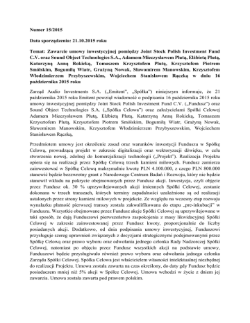 Numer 15/2015 Data sporządzenia: 21.10.2015 roku Temat: Zawarcie umowy inwestycyjnej pomiędzy Joint Stock Polish Investment Fund C.V. oraz Sound Object Technologies S.A., Adamem Mieczysławem Plutą, Elżbietą Plutą, Katarzyną Anną Rokicką, Tomaszem Krzysztofem Plutą, Krzysztofem Piotrem Smólskim, Bogumiłą Wiatr, Grażyną Nowak, Sławomirem Manowskim, Krzysztofem Włodzimierzem Przybyszewskim, Wojciechem Stanisławem Rączką w dniu 16 października 2015 roku Zarząd Audio Investments S.A. („Emitent”, „Spółka”) niniejszym informuje, że 21 października 2015 roku Emitent powziął wiadomość o podpisaniu 16 października 2015 roku umowy inwestycyjnej pomiędzy Joint Stock Polish Investment Fund C.V. („Fundusz”) oraz Sound Object Technologies S.A. („Spółka Celowa”) oraz założycielami Spółki Celowej Adamem Mieczysławem Plutą, Elżbietą Plutą, Katarzyną Anną Rokicką, Tomaszem Krzysztofem Plutą, Krzysztofem Piotrem Smólskim, Bogumiłą Wiatr, Grażyną Nowak, Sławomirem Manowskim, Krzysztofem Włodzimierzem Przybyszewskim, Wojciechem Stanisławem Rączką, Przedmiotem umowy jest określenie zasad oraz warunków inwestycji Funduszu w Spółkę Celową, prowadzącą projekt w zakresie digitalizacji oraz wektoryzacji dźwięku, w celu stworzenia nowej, zdolnej do komercjalizacji technologii („Projekt”). Realizacja Projektu opiera się na realizacji przez Spółkę Celową trzech kamieni milowych. Fundusz zamierza zainwestować w Spółkę Celową maksymalnie kwotę PLN 4.100.000, z czego PLN 800.000 stanowić będzie bezzwrotny grant z Narodowego Centrum Badań i Rozwoju, który nie będzie stanowił wkładu na pokrycie obejmowanych przez Fundusz akcji. Inwestycja, czyli objęcie przez Fundusz ok. 30 % uprzywilejowanych akcji imiennych Spółki Celowej, zostanie dokonana w trzech transzach, których terminy zapadalności uzależnione są od realizacji ustalonych przez strony kamieni milowych w projekcie. Ze względu na wczesny etap rozwoju wynalazku płatność pierwszej transzy została zakwalifikowana do etapu „pre-inkubacji” w Funduszu. Wszystkie obejmowane przez Fundusz akcje Spółki Celowej są uprzywilejowane w taki sposób, że dają Funduszowi pierwszeństwo zaspokojenia z masy likwidacyjnej Spółki Celowej w zakresie zainwestowanej przez Fundusz kwoty, proporcjonalnie do liczby posiadanych akcji. Dodatkowo, od dnia podpisania umowy inwestycyjnej, Funduszowi przysługuje szereg uprawnień związanych z decyzjami strategicznymi podejmowanymi przez Spółkę Celową oraz prawo wyboru oraz odwołania jednego członka Rady Nadzorczej Spółki Celowej, natomiast po objęciu przez Fundusz wszystkich akcji na podstawie umowy, Funduszowi będzie przysługiwało również prawo wyboru oraz odwołania jednego członka Zarządu Spółki Celowej. Spółka Celowa jest właścicielem własności intelektualnej niezbędnej do realizacji Projektu. Umowa została zawarta na czas określony, do daty gdy Fundusz będzie posiadaczem mniej niż 5% akcji w Spółce Celowej. Umowa wchodzi w życie z dniem jej zawarcia. Umowa została zawarta pod prawem polskim. Podstawa prawna: Art. 56 ust. 1 ptk 1 Ustawy o ofercie – Informacja poufna Osoby reprezentujące Spółkę: Marek Orłowski - Prezes Zarządu Anna Aranowska-Bablok – Członek Zarządu