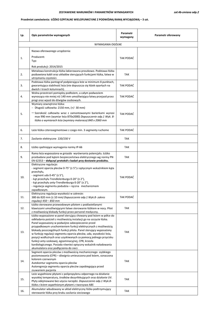 ZESTAWIENIE WARUNKÓW I PARAMETRÓW WYMAGANYCH zał.4b-zmiana odp.2 Przedmiot zamówienia: ŁÓŻKO SZPITALNE WIELOFUNKCYJNE Z PODWÓJNĄ RAMĄ WYCIĄGOWĄ – 3 szt. Lp. Parametr wymagany Opis parametrów wymaganych WYMAGANIA OGÓLNE Nazwa oferowanego urządzenia: 1. 2. 3. 4. 5. Producent: Typ: Rok produkcji: 2014/2015 Metalowa konstrukcja łóżka lakierowana proszkowo. Podstawa łóżka pozbawiona kabli oraz układów sterujących funkcjami łóżka, łatwa w utrzymaniu czystości. Podstawa łóżka pantograf podpierająca leże w minimum 8 punktach, gwarantująca stabilność leża (nie dopuszcza się łóżek opartych na dwóch i trzech kolumnach). Wolna przestrzeń pomiędzy podłożem, a całym podwoziem wynosząca nie mniej niż 140 mm umożliwiająca łatwy przejazd przez progi oraz wjazd do dźwigów osobowych. Wymiary zewnętrzne łóżka: − Długość całkowita: 2150 mm, (+/- 30 mm) − Szerokość całkowita wraz z zamontowanymi barierkami wynosi TAK PODAĆ TAK TAK PODAĆ TAK PODAĆ TAK PODAĆ max 990 mm (wymiar leża 870x2000) Dopuszczenie odp.1 Wyk. 8łóżko o wymiarach leża (wymiary materaca) 840 x 2060 mm 6. Leże łóżka czterosegmentowe z czego min. 3 segmenty ruchome 7. Zasilanie elektryczne 220/230 V TAK 8. Łóżko spełniające wymagania normy IP-66 TAK 9. 10. 11. 12. 13. 14. 15. 16. Rama leża wyposażona w gniazdo wyrównania potencjału. Łóżko przebadane pod kątem bezpieczeństwa elektrycznego wg normy PN EN 62353 – dołączyć protokół z badań przy dostawie produktu. Elektryczne regulacje: - segment oparcia pleców 0-75° (± 5°) z optycznym wskaźnikiem kąta przechyłu, - segment uda 0-45° (± 5°), - kąt przechyłu Trendlelenburga 0-20° (± 2°), - kąt przechyłu anty-Trendlenburga 0-20° (± 2°), - regulacja segmentu podudzia – ręczna mechanizmem zapadkowym. Elektryczna regulacja wysokości w zakresie: 380 do 820 mm (± 10 mm) Dopuszczenie odp.1 Wyk.8- zakres regulacji 450 – 850 mm Łóżko sterowane przewodowym pilotem z podświetlanymi klawiszami umożliwiającymi łatwe sterowanie łóżkiem w nocy. Pilot z możliwością blokady funkcji przez personel medyczny. Łóżko wyposażone w panel sterujący chowany pod leżem w półce do odkładania pościeli z możliwością instalacji go na szczycie łózka. Panel wyposażony w podwójne zabezpieczenie przed przypadkowym uruchomieniem funkcji elektrycznych z możliwością blokady poszczególnych funkcji pilota. Panel sterujący wyposażony w funkcję regulacji segmentu oparcia pleców, uda, wysokości leża, pozycji wzdłużnych oraz uzyskiwanych za pomocą jednego przycisku funkcji anty-szokowej, egzaminacyjnej, CPR, krzesła kardiologicznego. Posiada również optyczny wskaźnik naładowania akumulatora oraz podłączenia do sieci. Segment oparcia pleców z możliwością mechanicznego szybkiego poziomowania (CPR) – dźwignia umieszczona pod leżem, oznaczona kolorem czerwonym Autokontur segmentu oparcia pleców Autoregresja segmentu oparcia pleców zapobiegająca przed zsuwaniem pacjenta Leże wypełnione płytami z polipropylenu odpornego na działanie wysokiej temperatury, środków dezynfekujących oraz działanie UV. Płyty odejmowane bez użycia narzędzi. Dopuszczenie odp.1 Wyk.8łóżka z leżem wypełnionym płytami z tworzywa ABS Akumulator wbudowany w układ elektryczny łóżka podtrzymujący sterowanie łóżka przy braku zasilania sieciowego TAK PODAĆ TAK TAK PODAĆ TAK PODAĆ TAK TAK TAK TAK TAK Parametr oferowany 17. 18. 19. 20. 21. 22. 23. 24. Łóżko z możliwością teleskopowego przedłużenia leża o 200 mm Szczyty łóżka wypełnione płytą tworzywową (HPL) o grubości 10 mm (± 2 mm), odejmowane bez użycia narzędzi, umożliwiające łatwy dostęp do pacjenta zarówno od strony nóg jak i głowy z możliwością wykorzystania płyty jako deska reanimacyjna. Łóżko wyposażone w opuszczane aluminiowe barierki boczne, zabezpieczające pacjenta na całej długości bez wolnej przestrzeni pomiędzy szczytem a barierką nawet w przypadku wydłużenia leża (zintegrowane ze szczytem łóżka). Elastyczne listwy odbojowe umieszczone na barierkach na całej ich długości chroniące łóżko przed uderzeniami. Barierki spełniające normę bezpieczeństwa: EN 60601-2-52 Wysuwana półka do odkładania pościeli, nie wystająca poza obrys ramy łóżka Możliwość zamontowania po dwóch stronach łóżka uchwytów na worki urologiczne. Dopuszczenie odp.1 Wyk.8- łóżka z już zamontowanymi uchwytami na worki urologiczne (po 2 metalowe haczyki z dwóch stron leża) W narożnikach leża 4 krążki odbojowe a od strony głowy krążki dwuosiowe chroniące ściany i łóżko podczas zmiany położenia w pozycji wertykalnej i horyzontalnej. Łóżko wyposażone w elastyczne tworzywowe uchwyty materaca przy min. dwóch segmentach leża, dostosowujące się do szerokości materaca, zapobiegające powstawaniu urazów kończyn. Uchwyty tworzywowe wyposażone w kątomierze po dwóch stronach przy segmencie wezgłowia. Dopuszczenie odp.1 Wyk.8 - łóżka z kątomierzami zamocowanymi po dwóch stronach segmentu oparcia pleców. Podstawa łóżka jezdna wyposażona w antystatyczne koła o średnicy min. 150 mm, z centralną blokadą kół oraz blokadą kierunkową. 25. Bezpieczne obciążenie min. 250 kg potwierdzone przez niezależny podmiot. 26. Możliwość montażu ramy wyciągowej, wieszaka kroplówki oraz wysięgnika z uchwytem do ręki 27. 28. 29. Kolorów wypełnień szczytów 6 kolorów do wyboru przez zamawiającego, kolor ramy- biały Elementy wyposażenia łóżek: − Materac dopasowany do ramy leża z pianki poliuretanowej w pokrowcu paroprzepuszczalnym, nieprzenikliwy dla cieczy. Materac z możliwością wymiany pokrowca, pokrowiec z zamkiem błyskawicznym obszyty w literę „L” z okapnikiem, grubość minimum 10 cm, odporny na dezynfekcję. Pokrowiec materaca lub tkanina z której jest wykonany winien posiadać Opinię laboratoryjną potwierdzają