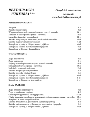 RESTAURACJA WIKTORIA*** Co tydzień nowe menu na stronie www.hotelwiktoria.com.pl Poniedziałek 01.02.2016 Krupnik Rosół z makaronem Wieprzowina w sosie pieczeniowym z puree i surówką Kurczak w sosie pesto z puree i surówką Łazanki z kapustą i pieczarkami Sałatka z wędzonym łososiem i pestkami słonecznika Sałatka z grillowanym kurczakiem Kanapka z szynką, z żółtym serem i jajkiem Kanapka z salami, z żółtym serem i jajkiem Kanapka z grillowany kurczakiem 4 zł 4 zł 14 zł 14 zł 12 zł 6 zł 6 zł 6 zł 6 zł 6 zł Wtorek 02.02.2016 Zupa zacierkowa Zupa jarzynowa Pulpety w sosie pieczarkowym z puree i surówką Sznycel drobiowy z puree i surówką Naleśniki z serem i śmietaną Sałatka z szynką i żółtym serem Sałatka nicejska z tuńczykiem Kanapka z szynka, z żółtym serem i jajkiem Kanapka z salami, z żółtym serem i jajkiem Kanapka z grillowanym kurczakiem 4 zł 4 zł 14 zł 14 zł 12 zł 6 zł 6 zł 6 zł 6 zł 6 zł Środa 03.02.2016 Zupa z fasolki szparagowej 4 zł Zupa pomidorowa z ryżem 4 zł Gulasz po węgiersku z kaszą gryczaną 14 zł Filet z kurczaka zapiekany z ananasem i żółtym serem z puree i surówką 14 zł Spaghetti w sosie neapolitańskim 12 zł Sałatka brokułowa z gotowanym jajkiem i papryką 6 zł Sałatka makaronowa z grillowanym kurczakiem i papryką 6 zł Kanapka z szynką, z żółtym serem i jajkiem 6 zł Kanapka z salami, z żółtym serem i jajkiem Kanapka z grillowanym kurczakiem 6 zł 6 zł Czwartek 04.02.2016 Zupa pieczarkowa Zupa orientalna Tradycyjne gołąbki w sosie pomidorowym z puree Schab w warzywach z makaronem penne Pierogi z serem i śmietaną Sałatka gyros Sałatka grecka Kanapka z szynką, z żółtym serem i jajkiem Kanapka z salami, z żółtym serem i jajkiem Kanapka z grillowanym kurczakiem 4 zł 4 zł 14 zł 14 zł 12 zł 6 zł 6 zł 6 zł 6 zł 6 zł Piątek 05.02.2016 Minestrone Zupa ogórkowa Mintaj w sosie porowym z puree i surówką Pieczeń rzymska w sosie chrzanowym z puree i surówką Kotlet ala nelsoński z pieczarkami a sosie pieprzowym i surówką Sałatka caprese Sałatka śledziowa z ziemniaczkami Kanapka z szynką, z żółtym serem i jajkiem Kanapka z salami, z żółtym serem i jajkiem Kanapka z grillowanym kurczakiem Kierowca ma zawsze przy sobie krokiety i pierogi. Hotel Wiktoria*** ul. Chabrowa 6/8/10 Wiązowna tel. 885-100-200 mail: [email protected] 4 zł 4 zł 14 zł 14 zł 12 zł 6 zł 6 zł 6 zł 6 zł 6 zł