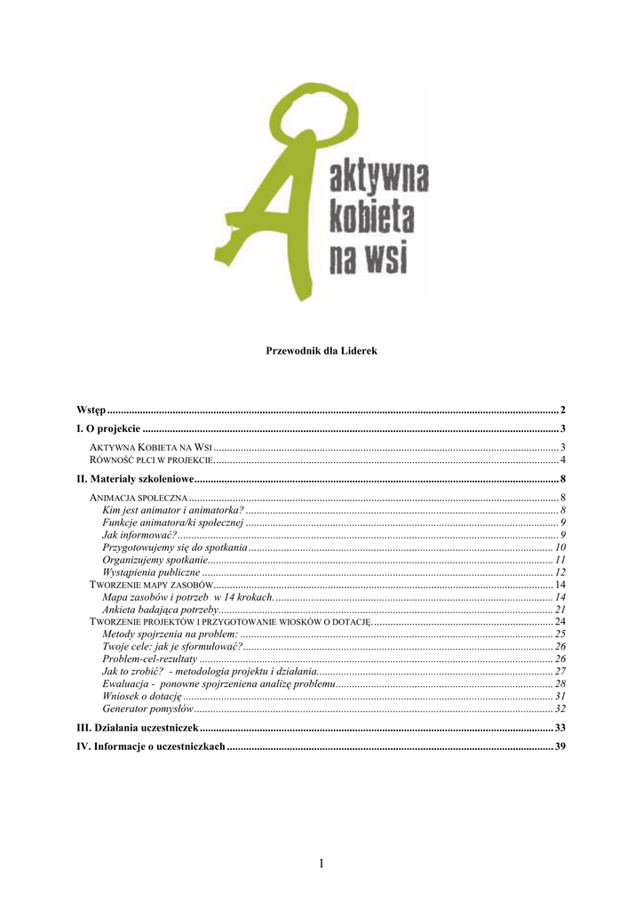 Przewodnik dla Liderek Wstęp ...................................................................................................................................................................... 2 I. O projekcie ......................................................................................................................................................... 3 AKTYWNA KOBIETA NA WSI ............................................................................................................................... 3 RÓWNOŚĆ PŁCI W PROJEKCIE............................................................................................................................... 4 II. Materiały szkoleniowe...................................................................................................................................... 8 ANIMACJA SPOŁECZNA ........................................................................................................................................ 8 Kim jest animator i animatorka? ................................................................................................................... 8 Funkcje animatora/ki społecznej ................................................................................................................... 9 Jak informować?............................................................................................................................................ 9 Przygotowujemy się do spotkania ................................................................................................................ 10 Organizujemy spotkanie............................................................................................................................... 11 Wystąpienia publiczne ................................................................................................................................. 12 TWORZENIE MAPY ZASOBÓW............................................................................................................................. 14 Mapa zasobów i potrzeb w 14 krokach. ...................................................................................................... 14 Ankieta badająca potrzeby........................................................................................................................... 21 TWORZENIE PROJEKTÓW I PRZYGOTOWANIE WIOSKÓW O DOTACJĘ................................................................... 24 Metody spojrzenia na problem: ................................................................................................................... 25 Twoje cele: jak je sformułować?.................................................................................................................. 26 Problem-cel-rezultaty .................................................................................................................................. 26 Jak to zrobić? - metodologia projektu i działania....................................................................................... 27 Ewaluacja - ponowne spojrzeniena analizę problemu................................................................................ 28 Wniosek o dotację ........................................................................................................................................ 31 Generator pomysłów.................................................................................................................................... 32 III. Działania uczestniczek .................................................................................................................................. 33 IV. Informacje o uczestniczkach ........................................................................................................................ 39 1 Wstęp Szanowni Państwo! Mamy przyjemność zaprezentować przewodnik „Aktywna Kobieta na Wsi“, który jest podsumowaniem projektu realiozwanego przez nasz Ośrodek w ciągu ostatnich siedmiu miesięcy. Przewodnik podzielony jest na cztery części. część pierwsza opisuje podstawowe założenia projektu oraz koncentruje się na kwestii równości płci w przygotowaniu projektów. Zagadanienie równości płci, tak zwanego gender mainstreamingu pozostaje, w naszym przekonaniu, ważnym elementem myślenia o każdym, nie tylko kobiecym, projekcie. W części drugiej prezentujemy podstawowe materiały szkoleniowe, które wybrały same Uczestniczki. Wiedza zgromadzona w tym rozdziale pozwoli innym animatorkom i animatorom na rozwój własnych umiejętności i zdobycie nowych informacji. Części trzecia i czwarta poświęcone są Uczestniczkom projektu – Aktywnym Kobietom z powiatu wąbrzeskiego: prezentujemy ich działania, organizacje oraz sylwetki. Dziękujemy serdecznie wszystkim zaangażowanym w Projekt: przedstawicielom lokalnych Samorządów, którzy ułatwili rekrutację i kontakt z Uczestniczkami, trenerkom i trenerom przygotowującym warsztaty i wreszcie samym Uczestniczkom – fantastycznym kobietom, które realizują mnóstwo niesamowitych inicjatyw dla swoich społeczności i są prawdziwą inspiracją dla innych! W imieniu Tłoka Ewa Kwiesielewicz – Koordynatorka Projektu Jacek Gądecki – Prezes Kujawsko-Pomorski Ośrodek Wsparcia Inicjatyw Pozarządowych Tłok 2 I. O projekcie Aktywna Kobieta na Wsi Projekt ma na celu przygotowanie kobiet - liderek do działań na rzecz zwiększenia aktywności w społecznościach lokalnych, z których pochodzą. W projekcie bierze udział grupa szesnastu kobiet - liderek społeczności wiejskich z sołectw powiatu golubskodobrzyńskiego w województwie kujawsko-pomorskim. Podstawowym założeniem projektu była praca w tandemach - Uczestniczki stworzyły tandemy sąsiadek by wspierać się w działaniach. Podczas projektu brały udział w czterech szkoleniach: Ja jako animatorka - celem szkolenia była refleksja nad indywidualną motywacją
