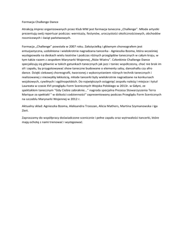 Formacja Challenge Dance Atrakcją imprez organizowanych przez Klub MW jest formacja taneczna „Challenge”. Młode artystki prezentują swój repertuar podczas: wernisaży, festynów, uroczystości okolicznościowych, obchodów rocznicowych i świąt państwowych. Formacja „Challenge” powstała w 2007 roku. Założycielką i głównym choreografem jest entuzjastyczna, uzdolniona i wielokrotnie nagradzana tancerka - Agnieszka Bzoma, która wcześniej występowała na deskach wielu teatrów i podczas różnych przeglądów tanecznych w całym kraju, w tym także razem z zespołem Marynarki Wojennej „Róże Wiatru”. Członkinie Challenge Dance specjalizują się głównie w takich gatunkach tanecznych jak jazz i taniec współczesny, choć nie brak im sił i zapału, by przygotowywać show taneczne budowane o elementy salsy, dancehallu czy afro dance. Dzięki ciekawej choreografii, tworzonej z wykorzystaniem różnych technik tanecznych i realizowanej z niezwykłą lekkością, młode tancerki były wielokrotnie nagradzane na konkursach wojskowych, cywilnych i ogólnopolskich. Do największych osiągnięć zespołu należą I miejsce i tytuł Laureata w czasie XVI przeglądu Form Scenicznych Wojska Polskiego w 2013r. w Gdyni, ze spektaklem tanecznym "Gdy Ciebie zabraknie..." nagroda specjalna Prezesa Stowarzyszenia Terra Marique za spektakl " w dzikości codzienności" zaprezentowany podczas Przeglądu Form Scenicznych na szczeblu Marynarki Wojennej w 2012 r. Aktualny skład: Agnieszka Bzoma, Aleksandra Trzeszan, Alicia Mathers, Martina Szymanowska i Iga Zień. Zapraszamy do współpracy doświadczone scenicznie i pełne zapału oraz wytrwałości tancerki, które mają ochotę z nami trenować i występować.