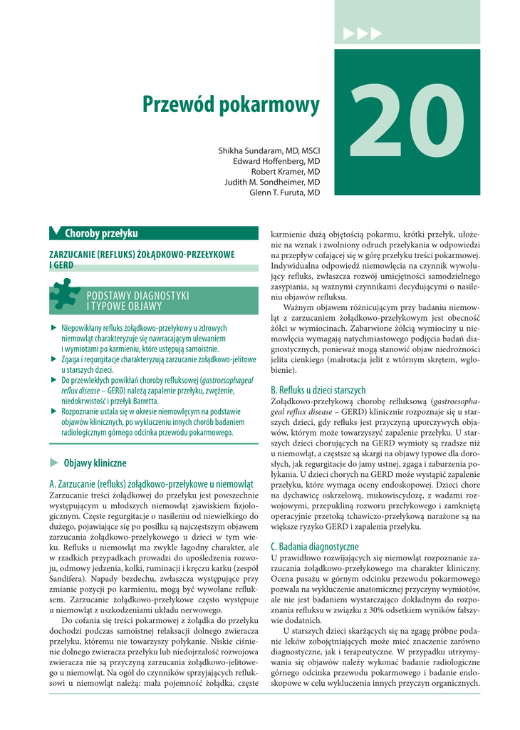 Przewód pokarmowy Shikha Sundaram, MD, MSCI Edward Hoffenberg, MD Robert Kramer, MD Judith M. Sondheimer, MD Glenn T. Furuta, MD Choroby przełyku ZARZUCANIE (REFLUKS) ŻOŁĄDKOWO-PRZEŁYKOWE I GERD PODSTAWY DIAGNOSTYKI I TYPOWE OBJAWY Niepowikłany refluks żołądkowo-przełykowy u zdrowych niemowląt charakteryzuje się nawracającym ulewaniem i wymiotami po karmieniu, które ustępują samoistnie. Zgaga i regurgitacje charakteryzują zarzucanie żołądkowo-jelitowe u starszych dzieci. Do przewlekłych powikłań choroby refluksowej (gastroesophageal reflux disease – GERD) należą zapalenie przełyku, zwężenie, niedokrwistość i przełyk Barretta. Rozpoznanie ustala się w okresie niemowlęcym na podstawie objawów klinicznych, po wykluczeniu innych chorób badaniem radiologicznym górnego odcinka przewodu pokarmowego. Objawy kliniczne A. Zarzucanie (refluks) żołądkowo-przełykowe u niemowląt Zarzucanie treści żołądkowej do przełyku jest powszechnie występującym u młodszych niemowląt zjawiskiem fizjologicznym. Częste regurgitacje o nasileniu od niewielkiego do dużego, pojawiające się po posiłku są najczęstszym objawem zarzucania żołądkowo-przełykowego u dzieci w tym wieku. Refluks u niemowląt ma zwykle łagodny charakter, ale w rzadkich przypadkach prowadzi do upośledzenia rozwoju, odmowy jedzenia, kolki, ruminacji i kręczu karku (zespół Sandifera). Napady bezdechu, zwłaszcza występujące przy zmianie pozycji po karmieniu, mogą być wywołane refluksem. Zarzucanie żołądkowo-przełykowe często występuje u niemowląt z uszkodzeniami układu nerwowego. Do cofania się treści pokarmowej z żołądka do przełyku dochodzi podczas samoistnej relaksacji dolnego zwieracza przełyku, któremu nie towarzyszy połykanie. Niskie ciśnienie dolnego zwieracza przełyku lub niedojrzałość rozwojowa zwieracza nie są przyczyną zarzucania żołądkowo-jelitowego u niemowląt. Na ogół do czynników sprzyjających refluksowi u niemowląt należą: mała pojemność żołądka, częste 20 karmienie dużą objętością pokarmu, krótki przełyk, ułożenie na wznak i zwolniony odruch przełykania w odpowiedzi na przepływ cofającej się w górę przełyku treści pokarmowej. Indywidualna odpowiedź niemowlęcia na czynnik wywołujący refluks, zwłaszcza rozwój umiejętności samodzielnego zasypiania, są ważnymi czynnikami decydującymi o nasileniu objawów refluksu. Ważnym objawem różnicującym przy badaniu niemowląt z zarzucaniem żołądkowo-przełykowym jest obecność żółci w wymiocinach. Zabarwione żółcią wymiociny u niemowlęcia wymagają natychmiastowego podjęcia badań diagnostycznych, ponieważ mogą stanowić objaw niedrożności jelita cienkiego (malrotacja jelit z wtórnym skrętem, wgłobienie). B. Refluks u dzieci starszych Żołądkowo-przełykową chorobę refluksową (gastroesophageal reflux disease – GERD) klinicznie rozpoznaje się u starszych dzieci, gdy refluks jest przyczyną uporczywych objawów, którym może towarzyszyć zapalenie przełyku. U starszych dzieci chorujących na GERD wymioty są rzadsze niż u niemowląt, a częstsze są skargi na objawy typowe dla dorosłych, jak regurgitacje do jamy ustnej, zgaga i zaburzenia połykania. U dzieci chorych na GERD może wystąpić zapalenie przełyku, które wymaga oceny endoskopowej. Dzieci chore na dychawicę oskrzelową, mukowiscydozę, z wadami rozwojowymi, przepukliną rozworu przełykowego i zamkniętą operacyjnie przetoką tchawiczo-przełykową narażone są na większe ryzyko GERD i zapalenia przełyku. C. Badania diagnostyczne U prawidłowo rozwijających się niemowląt rozpoznanie zarzucania żołądkowo-przełykowego ma charakter kliniczny. Ocena pasażu w górnym odcinku przewodu pokarmowego pozwala na wykluczenie anatomicznej przyczyny wymiotów, ale nie jest badaniem wystarczająco dokładnym do rozpoznania refluksu w związku z 30% odsetkiem wyników fałszywie dodatnich. U starszych dzieci skarżących się na zgagę próbne podanie leków zobojętniających może mieć znaczenie zarówno diagnostyczne, jak i terapeutyczne. W przypadku utrzymywania się objawów należy wykonać badanie radiologiczne górnego odcinka przewodu pokarmowego i badanie endoskopowe w celu wykluczenia innych przyczyn organicznych. 614 ROZDZIAŁ 20 Badanie pH-metryczne lub badanie impedancji przełyku mogą pomóc w powiązaniu epizodycznych lub nietypowych objawów z epizodami zarzucania żołądkowo-przełykowego. Badania pH pomagają ilościowo ocenić liczbę i czas trwania epizodów. Monitorowanie przełykowej impedancji intraluminalnej jest niezależną od pomiaru pH metodą wykrywania ruchów treści płynnej w przełyku. Badania te wykazały, że epizody zarzucania treści, której odczyn nie jest kwaśny, występują równie często, jak zarzucanie treści kwaśnej oraz że leczenie środkami zobojętniającymi zmienia proporcję epizodów refluksu treści kwaśnej do niekwaśnej, ale nie całkowitą liczbę tych zdarzeń. Esofagoskopia z biopsją nie jest badaniem diagnostycznym dla GERD, ale pozwala rozpoznać zapalenie przełyku. Leczenie i rokowanie Refluks żołądkowo-przełykowy ustępuje samoistnie u 85% dzieci do 12. miesiąca życia, co pokrywa się z przyjęciem postawy wyprostowanej i przejściem na odżywianie pokarmem stałym. Do tego czasu objętość regurgitacji można zmniejszyć przez podawanie małych porcji pożywienia w krótszych odstępach czasu oraz poprzez zwiększenie gęstości pokarmu płatkami ryżowymi (2-3 łyżki stołowe/30 ml mieszanki). W sprzedaży dostępne są zagęszczone mieszanki przeciwrefluksowe. Antagoniści receptora histaminowego 2 (H2) (ranitydyna, 5 mg/kg/d w dwóch dawkach podzielonych) lub inhibitory pompy protonowej (omeprazol 0,5-1,0 mg/kg/d w dawce pojedynczej) nie zmniejszają częstości epizodów zarzucania, ale mogą zmniejszać zachowania bólowe. Środki prokinetyczne, jak metoklopramid, przyspieszaj