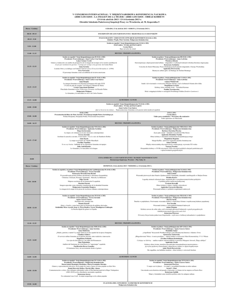 V CONGRESO INTERNACIONAL / V MIĘDZYNARODOWA KONFERENCJA NAUKOWA ABRE LOS OJOS - LA IMAGEN DE LA MUJER / ABRE LOS OJOS - OBRAZ KOBIETY 13-14 de abril de 2013 / 13-14 kwietnia 2013 r. Ośrodek Szkolenia Państwowej Inspekcji Pracy we Wrocławiu, ul. M. Kopernika 5 Horas / Godziny: SÁBADO, 13 de abril de 2013 / SOBOTA, 13 kwietnia 2013 r. 08:30 - 09:15 INSCRIPCIÓN DE LOS PARTICIPANTES / REJESTRACJA UCZESTNIKÓW 09:15 - 9:30 INAUGURACIÓN / UROCZYSTE OTWARCIE KONFERENCJI (SALA 202) Zdzisław Wąsik, Piotr Sawicki, Małgorzata Kolankowska 9:30 - 11:00 Sesión en español / Sesja hiszpańskojęzyczna I (SALA 202) PLENARIA / WYKŁAD PLENARNY Carme Riera Bajo un techo de cristal RECESO / PRZERWA KAWOWA 11.00 - 11.15 11.15 - 12.15 12.15 - 13.15 Sesión en español / Sesja hiszpańskojęzyczna II (SALA 202) Presidente/ Przewodniczący: Juan Carlos Cruz Suárez Luisa Cotoner Cerdó Género y traducción: un cambio de perspectiva de la imagen de la mujer en la versión castellana de Jo pos per testimoni les gavines / Y pongo por testigo a las gaviotas de Carme Riera Anna Sawicka Lourdes Ortiz y su diálogo con Federico García Lorca: El local de Bernadeta A. (1994) Ewa Nawrocka El personaje femenino como un emblema de la tierra americana Sesión en polaco / Sesja polskojęzyczna III (SALA 101) Presidente/ Przewodniczący: Anna Ledwina Wiesława Kłosek Stereotypizacja a deprecjonowanie kobiety – imigrantki w wybranych tekstach włoskiej literatury migracyjnej Katarzyna Jachnicka Ucieczka do Ziemi Obiecanej. Proza włoskojęzycznych pisarek imigrantek z Europy Wschodniej Agnieszka Piwowarska Beatrycze zabiera głos: od Dantego do Stefano Benniego Sesión en español / Sesja hiszpańskojęzyczna IV (SALA 202) Presidente/ Przewodniczący: Juan Carlos Cruz Suárez Anna Rzepka La imagen femenina en la literatura portuguesa del siglo XVII (“Carta de guia de casados” de Francisco Manuel de Melo) Leonor Sagermann Bustinza Pinceladas femeninas en las Tradiciones Peruanas de Ricardo Palma Małgorzata Wielgosz Lo femenino y lo masculino en Aura de Carlos Fuentes Sesión en polaco / Sesja polskojęzyczna V (SALA 101) Presidente/ Przewodniczący: Anna Ledwina Łukasz Wiśniewski Iranki i ich wizerunek w twórczości Marjane Satrapi, czyli o kobietach Orientu słów kilka Magdalena Lewicka Kobiety, które zmieniły świat – Tawakkul Karman Paulina Nowakowska Rola i osiągnięcia kobiet w szeregach Świetlistego Szlaku (Sendero Luminoso ) 13:15 - 14:00 ALMUERZO / LUNCH 14:00 - 15:00 Sesión en español / Sesja hiszpańskojęzyczna VI (SALA 202) PLENARIA / WYKŁAD PLENARNY Juan Carlos Cruz Suárez Qué se hicieron las damas… Representaciones femeninas en la poesía tardo-medieval española 15:00 - 16:00 (SALA 202) Presentación del libro de Piotr Sawicki / Prezentacja książki Piotra Sawickiego pt. Polska-Hiszpania, Hiszpania-Polska. Poszerzanie horyzontów RECESO / PRZERWA KAWOWA 16:00 - 16:15 16:15 - 17:45 20:00 Horas / Godziny: 9:30 - 10:50 10:50 - 12:10 Sesión en español / Sesja hiszpańskojęzyczna VII (SALA 202) Presidente/ Przewodniczący: Agnieszka Sycińska Maja Zawierzeniec La mujer y la violencia en el arte mexicano contemporáneo Teresa Jaromin Arrebatar la aureola a un mito. Frida Kahlo: Viva la vida de Humberto Robles Anna Kęsek La mujer en el teatro de Adolfo Marsillach Ewelina Topolska Yo no soy bonita: hablando de la experiencia femenina sin tapujos Julia Andriichenko Lo femenino y lo masculino en la lengua Sesión en polaco / Sesja polskojęzyczna VIII (SALA 101) Presidente/ Przewodniczący: Małgorzata Kolankowska Barbara Stawicka-Pirecka Życie jako rytuał – haitański wszechświat Mai Deren Agnieszka Kłosińska-Nachin Obraz kobiety w literaturze modernizmu hiszpańskojęzycznego Magdalena Roguska Margit Kaffka - pierwsza węgierska pisarka feministyczna Anna Ledwina Między mieszczańską obyczajowością a emancypacją: wyzwania XX wieku Natasza Posadzy Hiszpańskie kobiety w XVIII-wiecznych i XIX-wiecznych polskich relacjach podróżniczych i opracowaniach geograficznych CENA OFRECIDA A LOS PARTICIPANTES / BANKIET KONFERENCYJNY Restauracja Inspiracja, Wrocław - Plac Solny 16 DOMINGO, 14 de abril de 2013 / NIEDZIELA, 14 kwietnia 2013 r. Sesión en español y en polaco/ Sesja hiszpańskojęzyczna i polskojęzyczna IX (SALA 202) Presidente/ Przewodniczący: Teresa Jaromin Katarzyna Mroczkowska-Brand W poszukiwaniu postaci kobiety niezależnej w literaturze hiszpańskiej: Chimena, Celestyna, Rosaura, Semiramis, Marcela, La Baltazara Olga Nowak Mujeres escritoras de la Generación X española Mariola Pietrak Imagen especular como elemento constituyente de la identidad femenina Małgorzata Gaszyńska-Magiera La imagen de la mujer en la prosa de escritoras cubanas contemporáneas Sesión en polaco / Sesja polskojęzyczna X (SALA 101) Presidente/ Przewodniczący: Małgorzata Kolankowska Anna Cichoń Wizerunki pierwszych dam Stanów Zjednoczonych: Pamiętniki, dzienniki i autobiografie w Białym Domu Monika Kostro Łagodny uśmiech żelaznych dam. Argument płci w przedstawieniach kobiet polityków w polskiej prasie społeczno-politycznej Grażyna Kowalik Obraz kobiety w nauce i służbie człowiekowi Agnieszka Garcarek-Sikorska Wizerunek kobiety w polskich rozgłośniach radiowych Sesión en español / Sesja hiszpańskojęzyczna XI (SALA 202) Presidente/ Przewodniczący: Teresa Jaromin Ágata Cáceres Sztorc Hermana mía, enemiga mía Danuta Kucała Mujer y hombre como bases para la formación de palabras derivadas Koldobika Meso Ayerdi, Jesus A. Pérez Dasilva, Terese Mendiguren Galdospin La brecha digital de género es España Sesión en polaco / Sesja polskojęzyczna XII (SALA 101) Presidente/ Przewodniczący: Małgorzata Kolankowska Dorota Surdy Śnieżka w popkulturze. Porównanie wizerunku kobiety w baśni braci Grimm i współczesnej kulturze popularnej Ewa Serafin Wizerunek kobiety w słowiańskich baśniach ludowych Adam Flamma Kobieta zawsze da sobie radę, czyli wizer
