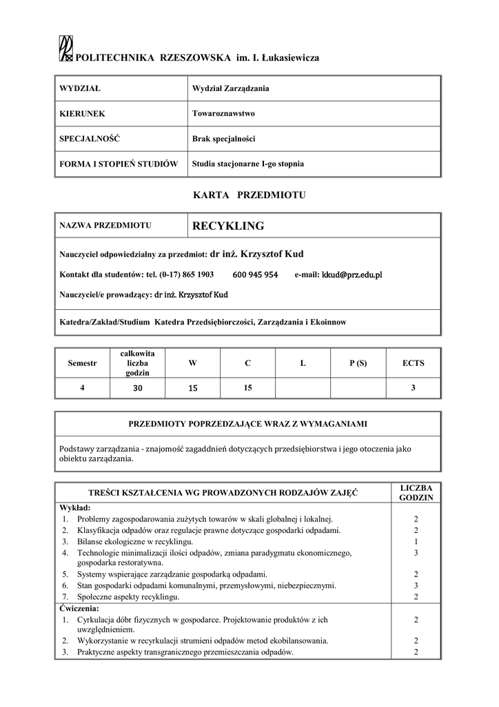 POLITECHNIKA RZESZOWSKA im. I. Łukasiewicza WYDZIAŁ Wydział Zarządzania KIERUNEK Towaroznawstwo SPECJALNOŚĆ Brak specjalności FORMA I STOPIEŃ STUDIÓW Studia stacjonarne I-go stopnia KARTA PRZEDMIOTU NAZWA PRZEDMIOTU RECYKLING Nauczyciel odpowiedzialny za przedmiot: dr inż. Krzysztof Kud Kontakt dla studentów: tel. (0-17) 865 1903 600 945 954 e-mail: [email protected] Nauczyciel/e prowadzący: dr inż. Krzysztof Kud Katedra/Zakład/Studium Katedra Przedsiębiorczości, Zarządzania i Ekoinnow Semestr całkowita liczba godzin W C 4 30 15 15 L P (S) ECTS 3 PRZEDMIOTY POPRZEDZAJĄCE WRAZ Z WYMAGANIAMI Podstawy zarządzania - znajomość zagaddnień dotyczących przedsiębiorstwa i jego otoczenia jako obiektu zarządzania. TREŚCI KSZTAŁCENIA WG PROWADZONYCH RODZAJÓW ZAJĘĆ Wykład: 1. Problemy zagospodarowania zużytych towarów w skali globalnej i lokalnej. 2. Klasyfikacja odpadów oraz regulacje prawne dotyczące gospodarki odpadami. 3. Bilanse ekologiczne w recyklingu. 4. Technologie minimalizacji ilości odpadów, zmiana paradygmatu ekonomicznego, gospodarka restoratywna. 5. Systemy wspierające zarządzanie gospodarką odpadami. 6. Stan gospodarki odpadami komunalnymi, przemysłowymi, niebezpiecznymi. 7. Społeczne aspekty recyklingu. Ćwiczenia: 1. Cyrkulacja dóbr fizycznych w gospodarce. Projektowanie produktów z ich uwzględnieniem. 2. Wykorzystanie w recyrkulacji strumieni odpadów metod ekobilansowania. 3. Praktyczne aspekty transgranicznego przemieszczania odpadów. LICZBA GODZIN 2 2 1 3 2 3 2 2 2 2 4. 5. Problemy utylizacji odpadów: rodzaje, właściwości oraz klasyfikacja odpadów. Wykorzystanie surowców odpadowych - przegląd technologii ich wykorzystywania jako substytutu surowców części lub całości naturalnych. 6. Uwarunkowania ramowe Design for Recycling w poszczególnych fazach cyrkulacji dóbr fizycznych w gospodarce. 7. Model zagospodarowania samochodów wycofanych z eksploatacji w Polsce. 8. Kolokwium zaliczeniowe. Laboratoria: 1. Projekty: 1. - 2 2 2 2 1 15/15 Łącznie liczba godzin: Dyżury dydaktyczne (konsultacje): w terminach podanych w harmonogramie pracy jednostki EFEKTY KSZTAŁCENIA - UMIEJĘTNOŚCI KSZTAŁCENIA Nabycie wiedzy i umiejętności związanych z klasyfikacją odpadów, regulacjami prawnymi w Polsce i UE, cyrkujacją dóbr w gozpodarce, znaczeniem przywracania towarów do ponownego użycia. FORMA I WARUNKI ZALICZENIA PRZEDMIOTU (RODZAJU ZAJĘĆ) Warunkiem zaliczenia ćwiczeń jest uczestniczenie w zajęciach, uzyskanie pozytywnej oceny za pracę na zajęciach i z pisemnego kolokwium zaliczeniowego obejmującego podstawowe zagadnienia przedmiotu. WYKAZ LITERATURY PODSTAWOWEJ 1. 2. 3. Rosik-Dulewska Cz., Podstawy gospodarki odpadami, Wydawnictwo Naukowe PWN, W-wa 2008. Starczewski C., Zarządzanie gospodarką odpadami: techniczno-organizacyjno-prawne aspekty gospodarki odpadami, Wydaw. PZITS, Poznań 2008. Merkisz-Guranowska A., Aspekty rozwoju recyklingu w Polsce, Wydawnictwo Instytutu Technologii Eksploatacji, Poznań-Radom 2005. WYKAZ LITERATURY UZUPEŁNIAJĄCEJ 1. Konwencja Bazylejska o kontroli transgranicznego przemieszczania i usuwania odpadów niebezpiecznych, sporzadzona w Bazylei dnia 22 marca 1989 r. Dz. U. z dnia 27 lutego 1995 r. http://www.dgsa-adr.pl/ustawy/ustawa_o_odpadach/1995.019.0088_konwencja_bazylejska.pdf Podpis nauczyciela odpowiedzialnego za przedmiot Podpis kierownika (zakładu/studium) katedry Data i podpis dziekana właściwego wydziału