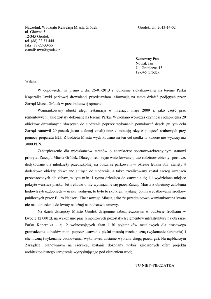 Naczelnik Wydziału Rekreacji Miasta Gródek ul. Główna 5 12-345 Gródek tel. (88) 22 33 444 faks: 88-22-33-55 e-mail: [email protected] Gródek, dn. 2013-14-02 Szanowny Pan Nowak Jan Ul. Graniczna 15 12-345 Gródek Witam. W odpowiedzi na pismo z dn. 26-01-2013 r. odnośnie zlokalizowanej na terenie Parku Kopernika ławki parkowej drewnianej przedstawiam informację na temat działań podjętych przez Zarząd Miasta Gródek w przedmiotowej sprawie. Wzmiankowany obiekt uległ restauracji w miesiącu maju 2009 r. jako część prac remontowych, jakie zostały dokonane na terenie Parku. Wykonano wówczas czynności odnowienia 20 obiektów drewnianych służących do siedzenia poprzez wykonanie pomalowań desek (w tym celu Zarząd zamówił 20 puszek jasno zielonej emali) oraz eliminację rdzy z połączeń śrubowych przy pomocy preparatu E25. Z budżetu Miasta wydatkowano na ten cel środki w kwocie nie wyższej niż 3000 PLN. Zabezpieczenie dla mieszkańców terenów o charakterze sportowo-rekreacyjnym stanowi priorytet Zarządu Miasta Gródek. Dlatego, realizując wnioskowane przez rodziców obiekty sportowe, dedykowane dla młodzieży przedszkolnej na obszarze parkowym w okresie letnim ub.r. stanęły 4 dodatkowe obiekty drewniane służące do siedzenia, a także zrealizowany został szereg urządzeń przeznaczonych dla zabaw, w tym m.in. 1 rynna dziecięca do zsuwania się i 1 wydzielone miejsce pokryte warstwą piasku. Jeśli chodzi o nie wywiązanie się przez Zarząd Miasta z obietnicy założenia hodowli ryb ozdobnych w oczku wodnym, to było to skutkiem wydanej opinii wydatkowania środków publicznych przez Biuro Nadzoru Finansowego Miasta, jako że przedmiotowo wzmiankowana kwota nie ma odniesienia do kwoty należnej na podstawie umowy. Na dzień dzisiejszy Miasto Gródek dysponuje zabezpieczonymi w budżecie środkami w kwocie 12 000 zł. na wykonanie prac remontowych pozostałych elementów infrastruktury na obszarze Parku Kopernika – tj. 2 wolnostojących altan i 30 pojemników metalowych dla czasowego gromadzenia odpadów m.in. poprzez usuwanie pleśni metodą mechaniczną (wykonanie skrobania) i chemiczną (wykonanie ozonowania; wykonawca zostanie wybrany drogą przetargu). Na najbliższym Zarządzie, planowanym na czerwca, zostanie dokonany wybór zgłoszonych ofert projektu architektonicznego urządzenia wytryskującego pod ciśnieniem wodę. TU NIBY-PIECZĄTKA