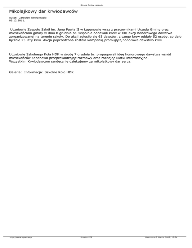 Strona Gminy Łapanów Mikołajkowy dar krwiodawców Autor: Jarosław Nowojowski 09.12.2011. Uczniowie Zespołu Szkół im. Jana Pawła II w Łapanowie wraz z pracownikami Urzędu Gminy oraz mieszkańcami gminy w dniu 8 grudnia br. wspólnie oddawali krew w XXI akcji honorowego dawstwa zorganizowanej na terenie szkoły. Do akcji zgłosiło się 63 dawców, z czego krew oddały 52 osoby, co dało łącznie 23 litry krwi. Akcja poprzedzona została kampanią promującą honorowe dawstwo krwi. Uczniowie Szkolnego Koła HDK w środę 7 grudnia br. propagowali ideę honorowego dawstwa wśród mieszkańców Łapanowa przeprowadzając rozmowy oraz rozdając ulotki informacyjne. Wszystkim Krwiodawcom serdecznie dziękujemy za mikołajkowy dar serca. Galeria: Informacja: Szkolne Koło HDK http://www.lapanow.pl Kreator PDF Utworzono 2 March, 2017, 16:54