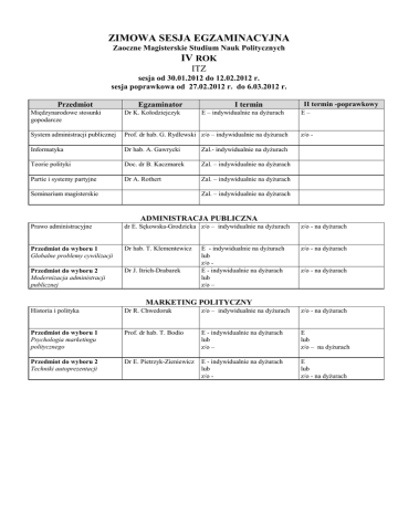 ZIMOWA SESJA EGZAMINACYJNA Zaoczne Magisterskie Studium Nauk Politycznych IV ROK ITZ sesja od 30.01.2012 do 12.02.2012 r. sesja poprawkowa od 27.02.2012 r. do 6.03.2012 r. Przedmiot Egzaminator I termin Międzynarodowe stosunki gopodarcze Dr K. Kołodziejczyk System administracji publicznej Prof. dr hab. G. Rydlewski z/o – indywidualnie na dyŜurach Informatyka Dr hab. A. Gawrycki Zal.- indywidualnie na dyŜurach Teorie polityki Doc. dr B. Kaczmarek Zal. – indywidualnie na dyŜurach Partie i systemy partyjne Dr A. Rothert Zal. – indywidualnie na dyŜurach Seminarium magisterskie E – indywidualnie na dyŜurach II termin -poprawkowy E– z/o - Zal. – indywidualnie na dyŜurach ADMINISTRACJA PUBLICZNA Prawo administracyjne dr E. Sękowska-Grodzicka z/o – indywidualnie na dyŜurach z/o - na dyŜurach Przedmiot do wyboru 1 Globalne problemy cywilizacji Dr hab. T. Klementewicz z/o - na dyŜurach Przedmiot do wyboru 2 Modernizacja administracji publicznej Dr J. Itrich-Drabarek Historia i polityka Dr R. Chwedoruk z/o – indywidualnie na dyŜurach z/o - na dyŜurach Przedmiot do wyboru 1 Psychologia marketingu politycznego Prof. dr hab. T. Bodio E - indywidualnie na dyŜurach lub z/o – E lub z/o – na dyŜurach Przedmiot do wyboru 2 Techniki autoprezentacji Dr E. Pietrzyk-Zieniewicz E - indywidualnie na dyŜurach lub z/o - E lub z/o - na dyŜurach E - indywidualnie na dyŜurach lub z/o E - indywidualnie na dyŜurach lub z/o – z/o - na dyŜurach MARKETING POLITYCZNY 2 ZIMOWA SESJA EGZAMINACYJNA Zoczne Magisterskie Studium Nauk Politycznych V ROK ITZ rok akademicki 2011/2012 Przedmiot sesja od 30.01.2012 do 12.02.2012 r. sesja poprawkowa od 27.02.2012 r. do 6.03.2012 r. Egzaminator I termin II termin – poprawkowy System gospodarczy i prawo handlowe Polityka społeczna Mgr R. BroŜyniak E – indywidualnie na dyŜurach E- Dr A. Wierzbicki z/o – indywidualnie na dyŜurach z/o – Polityka gospodarcza Dr J. Łopato z/o - indywidualnie na dyŜurach z/o – Socjologia organizacji Historia polskiej myśli politycznej Doc dr B. Kaczmarek Prof. dr hab. W. Jakubowski z/o - indywidualnie na dyŜurach z/o - indywidualnie na dyŜurach z/o z/o - Seminarium magisterskie Przedmiot Finanse publiczne i bankowość Administracja państw UE Przedmiot fakultatywny 1 SłuŜba cywilna w państwie demokratycznym Przedmiot fakultatywny 2 Zasady tworzenia prawa miejscowego Przedmiot fakultatywny 3 Historia dyplomacji PRL 1956-1989 Przedmiot fakultatywny 4 Koncepcje bezpieczeństwa wewnętrznego i zewnętrznego Przedmiot do wyboru 1 Globalizacja/alterglobalizacja Przedmiot do wyboru 2 Metody reklamy i promocji Zal. - indywidualnie na dyŜurach ADMINISTRACJA PUBLICZNA Egzaminator Termin Poprawkowa Dr E. SękowskaE – indywidualnie na dyŜurach Grodzicka Prof. dr hab. G. Rydlewski E – indywidualnie na dyŜurach E- Dr J. Itrich-Drabarek z/o – indywidualnie na dyŜurach z/o – Dr J. Zaleśny z/o - indywidualnie na dyŜurach z/o - Prof. dr A. Skrzypek z/o - indywidualnie na dyŜurach z/o - Dr K. Marczuk z/o - indywidualnie na dyŜurach z/o – Dr F. Ilkowski Zal. - indywidualnie na dyŜurach Dr E. Pietrzyk-Zieniewicz Zal. - indywidualnie na dyŜurach E- MARKETING POLITYCZNY Przedmiot Egzaminator Termin Poprawkowa Partycypacja polityczna Dr M. Tobiasz E – indywidualnie na dyŜurach E– Przedmiot fakultatywny 1 Analiza polityczna Psychologia przywództwa politycznego Przedmiot fakultatywny 2 Sztuka tworzenia i interpretacji sondaŜy wyborczych Przedmiot fakultatywny 3 Agresja w Ŝyciu politycznym i jej konsekwencje Przedmiot do wyboru 1 Magia marketingu politycznego (świadomość, postawy, zachowania) Przedmiot do wyboru 2 Autorytety w polityce Socjotechnika polityczna Dr M. Tobiasz E – indywidualnie na dyŜurach E– Prof. dr hab. T. Bodio z/o - indywidualnie na dyŜurach z/o - Dr T. Godlewski z/o - indywidualnie na dyŜurach z/o - Prof. dr T. Bodio z/o – indywidualnie na dyŜurach z/o - Prof. dr hab. T. Bodio Zal. - indywidualnie na dyŜurach Zal. Dr J. Ziółkowski Zal. – indywidualnie na dyŜurach Zal. Dr J. Ziółkowski Zal. - indywidualnie na dyŜurach Zal.
