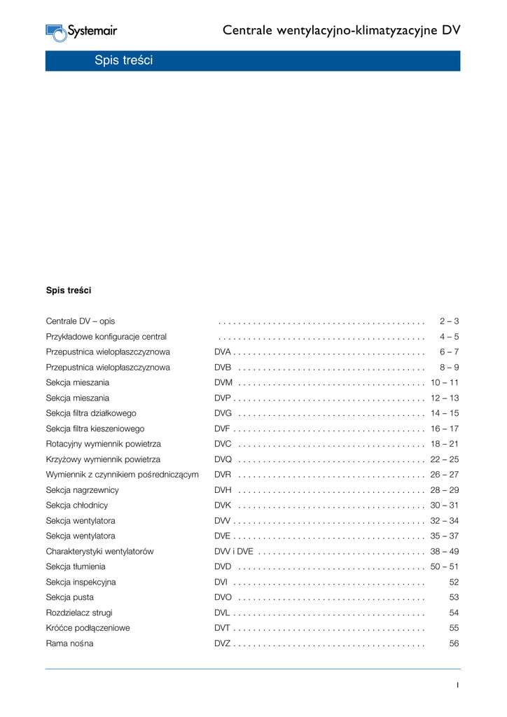 Centrale wentylacyjno-klimatyzacyjne DV Spis treÊci Spis treÊci Centrale DV – opis .......................................... 2–3 Przyk∏adowe konfiguracje central .......................................... 4–5 Przepustnica wielop∏aszczyznowa DVA . . . . . . . . . . . . . . . . . . . . . . . . . . . . . . . . . . . . . . . 6–7 Przepustnica wielop∏aszczyznowa DVB . . . . . . . . . . . . . . . . . . . . . . . . . . . . . . . . . . . . . . 8–9 Sekcja mieszania DVM . . . . . . . . . . . . . . . . . . . . . . . . . . . . . . . . . . . . . . 10 – 11 Sekcja mieszania DVP . . . . . . . . . . . . . . . . . . . . . . . . . . . . . . . . . . . . . . . 12 – 13 Sekcja filtra dzia∏kowego DVG . . . . . . . . . . . . . . . . . . . . . . . . . . . . . . . . . . . . . . 14 – 15 Sekcja filtra kieszeniowego DVF . . . . . . . . . . . . . . . . . . . . . . . . . . . . . . . . . . . . . . . 16 – 17 Rotacyjny wymiennik powietrza DVC . . . . . . . . . . . . . . . . . . . . . . . . . . . . . . . . . . . . . . 18 – 21 Krzy˝owy wymiennik powietrza DVQ . . . . . . . . . . . . . . . . . . . . . . . . . . . . . . . . . . . . . . 22 – 25 Wymiennik z czynnikiem poÊredniczàcym DVR . . . . . . . . . . . . . . . . . . . . . . . . . . . . . . . . . . . . . . 26 – 27 Sekcja nagrzewnicy DVH . . . . . . . . . . . . . . . . . . . . . . . . . . . . . . . . . . . . . . 28 – 29 Sekcja ch∏odnicy DVK . . . . . . . . . . . . . . . . . . . . . . . . . . . . . . . . . . . . . . 30 – 31 Sekcja wentylatora DVV . . . . . . . . . . . . . . . . . . . . . . . . . . . . . . . . . . . . . . . 32 – 34 Sekcja wentylatora DVE . . . . . . . . . . . . . . . . . . . . . . . . . . . . . . . . . . . . . . . 35 – 37 Charakterystyki wentylatorów DVV i DVE . . . . . . . . . . . . . . . . . . . . . . . . . . . . . . . . . . 38 – 49 Sekcja t∏umienia DVD . . . . . . . . . . . . . . . . . . . . . . . . . . . . . . . . . . . . . . 50 – 51 Sekcja inspekcyjna DVI . . . . . . . . . . . . . . . . . . . . . . . . . . . . . . . . . . . . . . . 52 Sekcja pusta DVO . . . . . . . . . . . . . . . . . . . . . . . . . . . . . . . . . . . . . . 53 Rozdzielacz strugi DVL . . . . . . . . . . . . . . . . . . . . . . . . . . . . . . . . . . . . . . . 54 Króçce pod∏àczeniowe DVT . . . . . . . . . . . . . . . . . . . . . . . . . . . . . . . . . . . . . . . 55 Rama noÊna DVZ . . . . . . . . . . . . . . . . . . . . . . . . . . . . . . . . . . . . . . . 56 1 Centrale wentylacyjno-klimatyzacyjne DV Opis central DV SystemairCAD: Dla zapewnienia prawid∏owego doboru central stworzyliÊmy komputerowy program o nazwie SystemairCAD. Charakteryzuje si´ ∏atwoÊcià obs∏ugi, szybkoÊcià dzia∏ania oraz automatycznym przesy∏aniem wygenerowanych rysunków do AutoCAD. Program prowadzi u˝ytkownika poprzez wszystkie fazy procesu doboru, kalkulacji parametrów oraz specyfikacji zamówienia. WielkoÊci: Centrale DV wykonywane sà w 12 wielkoÊciach pokrywajàcych zakres wydajnoÊci od 1.500 do 54.000 m3/h (0,4 – 15 m3/s). Funkcje: Kompaktowe centrale wentylacyjno-nawiewne DV ∏àczà ma∏e wymiary gabarytowe z optymalnymi parametrami eksploatacyjnymi i efektywnym odzyskiem ciep∏a. Produkowane sà w ró˝nych konfiguracjach. Bogaty program akcesoriów pozwala na skompletowanie centrali odpowiadajàcej dok∏adnie indywidualnemu zapotrzebowaniu. Mogà byç wykonane w wersji do monta˝u wewn´trznego jak i zewn´trznego (centrale dachowe). 1500 2000 3000 5000 10000 20000 50000 m3/h 30000 150 120 100 80 60 50 40 30 25 20 15 10 0,4 2 0,7 1 2 3 5 10 15 m3/s Centrale wentylacyjno-klimatyzacyjne DV Opis central DV Obudowa: Konstrukcja centrali opiera si´ na samonoÊnym szkielecie zbudowanym z odpornych na skr´canie profili stalowych po∏àczonych aluminiowymi naro˝nikami. Wszystkie Êciany i drzwi wykonane sà z blachy stalowej i zawierajà 50 mm warstw´ izolacji z we∏ny mineralnej. Zarówno profile jak i zastosowana blacha stalowa pokryte sà antykorozyjnà pow∏okà Alucynk AZ185. Klasa zabezpieczenia antykorozyjnego odpowiada wymaganiom stawianym dla klasy C4 wg EN ISO 12944-2. Konstrukcja charakteryzuje si´ du˝ymi i g∏adkimi powierzchniami, co u∏atwia czyszczenie i utrzymanie czystoÊci. Stosowany materia∏ izolacyjny (we∏na mineralna o du˝ej g´stoÊci) zapewnia doskona∏e w∏asnoÊci izolacyjne obudowy odnoÊnie przenikania ciep∏a i ha∏asu. Po∏àczenie takich elementów jak sprawne wentylatory o niskim nat´˝eniu ha∏asu, optymalne t∏umiki oraz t∏umiàce w∏aÊciwoÊci obudowy przynosi efekt w postaci bardzo niskiego poziomu ha∏asu w otoczeniu centrali. Disc-Lock: Centrala sk∏adajàca si´ z kilku sekcji mo˝e zostaç szybko i sprawnie po∏àczona w ca∏oÊç przy pomocy specjalnego, unikalnego systemu po∏àczeniowego opracowanego przez Systemair. System mo˝e byç stosowany zarówno wewnàtrz jak i na zewnàtrz centrali. Drzwi inspekcyjne: Centrale Danvent wyposa˝one sà w du˝e drzwi inspekcyjne, u∏atwiajàce dost´p do wn´trza centrali dla przeprowadzenia konserwacji lub napraw. Drzwi zawieszone sà na stabilnych, roz∏àczalnych zawiasach, co w przypadku niedostatecznej iloÊci miejsca w pomieszczeniu dla otwarcia drzwi, pozwala na ∏atwe ich zdemontowanie. SzczelnoÊç zamkni´cia drzwi zapewnia gumowa uszczelka oraz mocne klamki. Dla zapobie˝enia otwarcia drzwi przez nieuprawnione osoby, klamki posiadajà zabezpieczenia otwierane specjalnym kluczem (zgodnie z dyrektywami CE Marking). 3 Centrale wentylacyjno-klimatyzacyjne DV Przyk∏adowe konfiguracje central Centrale DV mo˝na dostosowaç do indywidualnych potrzeb klienta tak, aby sta∏y si´ sercem ka˝dego systemu wentylacyjnego. Typoszereg central DV opiera si´ na pewnej liczbie standardowych elementów, które mogà byç po∏àczone ze sobà tworzàc kilka tysi´cy ró˝nych kombinacji. Dla u∏atwienia procesu doboru central podajemy poni˝ej przyk∏ady typowych konfiguracji. Po wybraniu uk∏adu odpowiadajàce