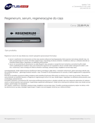 Apteka 7 dni ul. Zarzewska 51/53, Łódź (42) 640-00-24 Regenerum, serum, regeneracyjne do rzęs Cena: 25,99 PLN Opis produktu Regenerum serum do rzęs składa się z dwóch specjalnie opracowanych formulacji: serum z eyelinerem do stosowania na linię rzęs zawiera odżywcze lipooligopeptydy, które poprzez stymulację cebulek rzęs, nie tylko przyspieszają ich wzrost, ale także zagęszczają i pogrubiają strukturę włosków. Dodatkowo obecny w składzie ekstrakt ze świetlika działa kojąco i łagodząco na delikatną skórę powiek. serum ze szczoteczką do stosowania na całej długości rzęs, posiada w swojej formule matrykinę z prowitaminą B5, dzięki czemu spektakularnie wydłuża rzęsy oraz skutecznie ogranicza ich wypadanie. Serum zostało także wzbogacone żelem z aloesu i witaminą E, które wnikają we włókna włosków nawilżają, uelastyczniają i dogłębnie wzmacniają rzęsy. Lipooligopeptydy: dzięki właściwościom lipofilowym łatwo przenikają w głąb skóry i mieszków włosowych, gdzie stymulują cebulki rzęs do produkcji keratyny – głównego budulca włosów i rzęs. Prowadzi to do przyspieszenia ich wzrostu, a także zagęszczenia i pogrubienia struktury. Ekstrakt ze świetlika: pozytywne efekty działania ziela świetlika (Euphrasia Officinalis) na okolice oczu znane są od stuleci. Skoncentrowany ekstrakt ze świetlika zawarty w Regenerum regeneracyjne serum do rzęs, działa kojąco i łagodząco na delikatną skórę powiek, przeciwdziałając podrażnieniom. Kompleks matrykiny i prowitaminy B5: stymuluje proliferację keranocytów w obrębie cebulek rzęs oraz zapewnia optymalne ich zakotwiczenie w skórze poprzez stymulowanie i organizację cząsteczek adhezyjnych. Dzięki temu intensywnie wydłuża rzęsy oraz działa wzmacniająco, ograniczając ich wypadanie. Żel z aloesu i witamina E: nawilżają, uelastyczniają i dogłębnie wzmacniają rzęsy. Ponadto wywierają pozytywny wpływ na skórę, w której zakotwiczone są rzęsy, działając regenerująco i kojąco oraz pomagając utrzymać ją w dobrej kondycji. Plik wygenerowano: 02-03-2017 Powered by TCPDF (www.tcpdf.org) Oprogramowanie sklepu: AptusShop