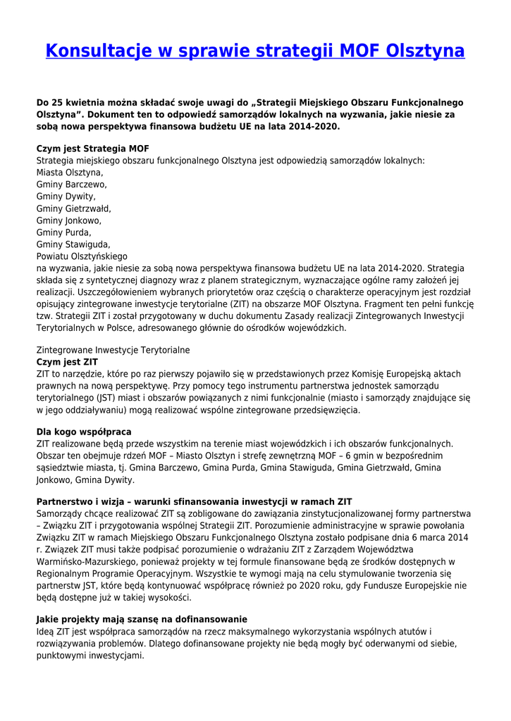Konsultacje w sprawie strategii MOF Olsztyna Do 25 kwietnia można składać swoje uwagi do „Strategii Miejskiego Obszaru Funkcjonalnego Olsztyna”. Dokument ten to odpowiedź samorządów lokalnych na wyzwania, jakie niesie za sobą nowa perspektywa finansowa budżetu UE na lata 2014-2020. Czym jest Strategia MOF Strategia miejskiego obszaru funkcjonalnego Olsztyna jest odpowiedzią samorządów lokalnych: Miasta Olsztyna, Gminy Barczewo, Gminy Dywity, Gminy Gietrzwałd, Gminy Jonkowo, Gminy Purda, Gminy Stawiguda, Powiatu Olsztyńskiego na wyzwania, jakie niesie za sobą nowa perspektywa finansowa budżetu UE na lata 2014-2020. Strategia składa się z syntetycznej diagnozy wraz z planem strategicznym, wyznaczające ogólne ramy założeń jej realizacji. Uszczegółowieniem wybranych priorytetów oraz częścią o charakterze operacyjnym jest rozdział opisujący zintegrowane inwestycje terytorialne (ZIT) na obszarze MOF Olsztyna. Fragment ten pełni funkcję tzw. Strategii ZIT i został przygotowany w duchu dokumentu Zasady realizacji Zintegrowanych Inwestycji Terytorialnych w Polsce, adresowanego głównie do ośrodków wojewódzkich. Zintegrowane Inwestycje Terytorialne Czym jest ZIT ZIT to narzędzie, które po raz pierwszy pojawiło się w przedstawionych przez Komisję Europejską aktach prawnych na nową perspektywę. Przy pomocy tego instrumentu partnerstwa jednostek samorządu terytorialnego (JST) miast i obszarów powiązanych z nimi funkcjonalnie (miasto i samorządy znajdujące się w jego oddziaływaniu) mogą realizować wspólne zintegrowane przedsięwzięcia. Dla kogo współpraca ZIT realizowane będą przede wszystkim na terenie miast wojewódzkich i ich obszarów funkcjonalnych. Obszar ten obejmuje rdzeń MOF – Miasto Olsztyn i strefę zewnętrzną MOF – 6 gmin w bezpośrednim sąsiedztwie miasta, tj. Gmina Barczewo, Gmina Purda, Gmina Stawiguda, Gmina Gietrzwałd, Gmina Jonkowo, Gmina Dywity. Partnerstwo i wizja – warunki sfinansowania inwestycji w ramach ZIT Samorządy chcące realizować ZIT są zobligowane do zawiązania zinstytucjonalizowanej formy partnerstwa – Związku ZIT i przygotowania wspólnej Strategii ZIT. Porozumienie administracyjne w sprawie powołania Związku ZIT w ramach Miejskiego Obszaru Funkcjonalnego Olsztyna zostało podpisane dnia 6 marca 2014 r. Związek ZIT musi także podpisać porozumienie o wdrażaniu ZIT z Zarządem Województwa Warmińsko-Mazurskiego, ponieważ projekty w tej formule finansowane będą ze środków dostępnych w Regionalnym Programie Operacyjnym. Wszystkie te wymogi mają na celu stymulowanie tworzenia się partnerstw JST, które będą kontynuować współpracę również po 2020 roku, gdy Fundusze Europejskie nie będą dostępne już w takiej wysokości. Jakie projekty mają szansę na dofinansowanie Ideą ZIT jest współpraca samorządów na rzecz maksymalnego wykorzystania wspólnych atutów i rozwiązywania problemów. Dlatego dofinansowane projekty nie będą mogły być oderwanymi od siebie, punktowymi inwestycjami. Przedsięwzięcia muszą być: - zintegrowane i służące kompleksowemu rozwiązywaniu problemów miasta i jego obszaru funkcjonalnego; - powiązane z rdzeniem MOF (muszą rozwiązywać problemy generowane przez miasto-rdzeń zarówno na jego terenie, jak i na obszarze całego MOF); - znaczące dla całego obszaru realizacji ZIT (rezultaty projektu powinny być przedmiotem zainteresowania wszystkich / większości gmin należących do Związku ZIT / wchodzących w skład MOF). Fundusze w ramach ZIT przeznaczone zostaną przede wszystkim na: - rozwój zrównoważonego, sprawnego transportu, łączącego miasto i jego obszar funkcjonalny (np. wprowadzenie zintegrowanych kart miejskich, budowa systemów „parkuj i jedź”, parkingów i ścieżek rowerowych); - przywracanie funkcji społeczno-gospodarczych zdegradowanych obszarów miejskiego obszaru funkcjonalnego – tzw. rewitalizacja (projekty łączące działania typowo inwestycyjne z miękkimi – np. przebudowa lub adaptacja budynków w zaniedbanej dzielnicy oraz aktywizacja zamieszkujących ją osób, które są zagrożone wykluczeniem społecznym – osoby pozostające długo bez pracy, rodziny wielodzietne, osoby niepełnosprawne); - poprawę stanu środowiska przyrodniczego na obszarze funkcjonalnym miasta (np. usuwanie azbestu, ochrona istniejących terenów zielonych w miastach, wymiana źródeł ciepła na bardziej ekologiczne); - wspieranie efektywności energetycznej (kompleksowa modernizacja energetyczna w budynkach mieszkaniowych polegająca np. na ocieplaniu budynków, wymianie okien i oświetlenia na energooszczędne, przebudowie systemów grzewczych); - wzmacnianie rozwoju funkcji symbolicznych budujących międzynarodowy charakter i ponadregionalną rangę miejskiego obszaru funkcjonalnego oraz poprawę dostępu i jakości usług publicznych w całym obszarze funkcjonalnym (np. promocja produktu turystycznego wspólnego dla całego obszaru funkcjonalnego, poprawa systemu informacji dla cudzoziemców, poprawa jakości sanitariatów publicznych, usprawnienia dla osób niepełnosprawnych, bezpłatny dostęp do Internetu); - wzmacnianie badań, rozwoju technologicznego oraz innowacji (np. rozwój usług oferowanych przez Instytucje Otoczenia Biznesu). Ostateczne decyzje co do zakresu wsparcia ZIT zapadną po negocjacjach tzw. kontraktów terytorialnych oraz ustaleniu zawartości wszystkich programów operacyjnych. Strategia ZIT powinna dotyczyć minimum dwóch z powyższych celów. Zarząd Województwa Warmińsko-Mazurskiego wskazał, że przedsięwzięcia realizowane w ramach ZIT Miejskiego Obszaru Funkcjonalnego Olsztyna muszą przyczyniać się do osiągnięcia rezultatów wskazanych w Strategii rozwoju społeczno-gospodarczego województwa warmińsko-mazurskiego do roku 2025 dla OSI Aglomeracja Olsztyna. Te cele to: - wzrost funkcji metropolitalnych Olsztyna (np. usług medycznych i rehabilitacyjnych czy kulturowyc