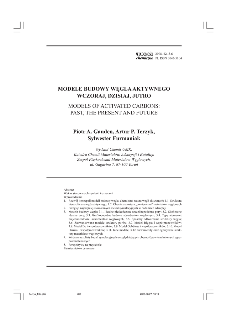 2008, 62, 5-6 PL ISSN 0043-5104 MODELE BUDOWY WÊGLA AKTYWNEGO WCZORAJ, DZISIAJ, JUTRO MODELS OF ACTIVATED CARBONS: PAST, THE PRESENT AND FUTURE Piotr A. Gauden, Artur P. Terzyk, Sylwester Furmaniak Wydzia³ Chemii UMK, Katedra Chemii Materia³ów, Adsorpcji i Katalizy, Zespó³ Fizykochemii Materia³ów Wêglowych, ul. Gagarina 7, 87-100 Toruñ Abstract Wykaz stosowanych symboli i oznaczeñ Wprowadzenie 1. Rozwój koncepcji modeli budowy wêgla, chemiczna natura wêgli aktywnych; 1.1. Struktura hierarchiczna wêgla aktywnego; 1.2. Chemiczna natura „powierzchni” materia³ów wêglowych 2. Przegl¹d najczêœciej stosowanych metod symulacyjnych w badaniach adsorpcji 3. Modele budowy wêgla; 3.1. Idealne nieskoñczone szczelinopodobne pory; 3.2. Skoñczone idealne pory; 3.3. Grafitopodobna budowa adsorbentów wêglowych; 3.4. Typy atomowej niejednorodnoœci adsorbentów wêglowych; 3.5. Sposoby odtwarzania struktury wêgla; 3.6. Zaawansowane modele struktury porów; 3.7. Model Biggsa i wspó³pracowników; 3.8. Model Do i wspó³pracowników; 3.9. Model Gubbinsa i wspó³pracowników; 3.10. Model Harrisa i wspó³pracowników; 3.11. Inne modele; 3.12. Szwarcenity oraz egzotyczne struktury materia³ów wêglowych 4. Wybrane rezultaty badañ symulacyjnych uwzglêdniaj¹cych obecnoœæ powierzchniowych ugrupowañ tlenowych 5. Perspektywy na przysz³oœæ Piœmiennictwo cytowane Terzyk_folie.p65 403 2008-06-27, 13:19 404 P.A. GAUDEN, A.P. TERZYK, S. FURMANIAK Dr Piotr A. Gauden ukoñczy³ studia w Toruniu w roku 1997 na Wydziale Chemii UMK. Pracê doktorsk¹ pod tytu³em Teoretyczny opis heterogenicznoœci strukturalnej i energetycznej materia³ów wêglowych wykona³ pod kierunkiem prof. dr hab. G. Rychlickiego oraz obroni³ j¹ z wyró¿nieniem w roku 2001. Jest wspó³autorem dwóch monografii: (i) P.A. Gauden, A.P. Terzyk, Zarys teorii adsorpcji par gazów w mikroporach materia³ów wêglowych, WIChiR, Warszawa, 2002; (ii) Artur P. Terzyk, Piotr A. Gauden i P. Kowalczyk (Eds.), Carbon Materials – Theory and Practice, Research Signpost, w druku. Jest stypendyst¹ Fundacji na Rzecz Nauki Polskiej (2000 rok). Jest wspó³autorem 80 publikacji w czasopismach o zasiêgu miêdzynarodowym oraz 60 komunikatów konferencyjnych. Jego g³ówne zainteresowania naukowe koncentruj¹ siê wokó³ zagadnieñ zwi¹zanych z teoretycznym opisem procesów sorpcji zachodz¹cych na materia³ach wêglowych, modelowaniem zjawisk powierzchniowych, zastosowania technik symulacji komputerowych oraz obliczeñ kwantowo-chemicznych w badaniach fizykochemicznych. Dr hab. Artur P. Terzyk, prof. UMK ukoñczy³ studia w roku 1991 na Wydziale Chemii UMK w Toruniu. Pracê doktorsk¹ (1995) pod tytu³em Kalorymetryczne badanie oddzia³ywañ miêdzycz¹steczkowych w uk³adzie: adsorbat – mikroporowaty wêgiel aktywny wykona³ pod kierunkiem prof. dr hab. G. Rychlickiego (rozprawa zosta³a wyró¿niona). Jest stypendyst¹ Fundacji na Rzecz Nauki Polskiej (1996 rok). Rozprawê habilitacyjn¹ Wêgle aktywne – nowoczesne metody charakteryzacji oraz zastosowanie do adsorpcji substancji biologicznie czynnych obroni³ (z wyró¿nieniem) w roku 2005. Rozprawa zosta³a wyró¿niona tak¿e nagrod¹ Prezesa Rady Ministrów. Jest wspó³autorem dwóch monografii: (i) P.A. Gauden, A.P. Terzyk, Zarys teorii adsorpcji par gazów w mikroporach materia³ów wêglowych, WIChiR, Warszawa, 2002; (ii) Artur P. Terzyk, Piotr A. Gauden i P. Kowalczyk (Eds.), Carbon Materials – Theory and Practice, Research Signpost, w druku. Jest wspó³autorem 130 publikacji w czasopismach o zasiêgu miêdzynarodowym oraz 100 komunikatów konferencyjnych. Jego g³ówne zainteresowania naukowe koncentruj¹ siê wokó³ zagadnieñ zwi¹zanych z adsorpcj¹ z roztworów, kalorymetri¹ adsorpcji oraz teoretycznym opisem procesów sorpcji zachodz¹cych na materia³ach wêglowych z zastosowaniem modeli analitycznych i symulacji komputerowych. Mgr Sylwester Furmaniak ukoñczy³ studia w 2005 roku na Wydziale Chemii UMK w Toruniu jako najlepszy absolwent Wydzia³u. W roku 2004 uzyska³ tytu³ najlepszego studenta UMK za rok akademicki 2003/2004. Od 2005 odbywa studia doktoranckie na Wydziale Chemii UMK. Jest wspó³autorem 20 publikacji w czasopismach o zasiêgu miêdzynarodowym oraz 10 komunikatów konferencyjnych. Jego g³ówne zainteresowania naukowe koncentruj¹ siê wokó³ modelowania procesów adsorpcyjnych (w tym energetyki) z zastosowaniem symulacji komputerowych oraz teorii matematycznych. Terzyk_folie.p65 404 2008-06-27, 13:19 MODELE BUDOWY WÊGLA AKTYWNEGO – WCZORAJ, DZISIAJ, JUTRO 405 ABSTRACT The development of models of activated carbons is presented. We start from historical review of the concept of BSU (Fig. 1) [4, 5, 8–12] and models based on microcrystallites (Figs. 2 and 3). We show the most popular methods of investigation applied in the field of carbon chemistry (Tab. 1). The structure of common surface acidic and basic functional groups containing oxygen are discussed (Figs. 5 and 7), taking into account the basicity of carbon π-electrons forming the structure. Next, we show how carbon porosity can be modelled. The basic computer simulation methods applied for recovering of the structure and studying of adsorption on carbons are discussed (mainly GCMC and MD). Here also DFT and some recently proposed new Monte Carlo-type methods are shortly discussed. Next the concepts of modelling of carbon porosity are presented (Fig. 8). First models of ideal pores are discussed showing the approach of infinite and finite carbon pores. Next we discuss the concepts of finite graphitic pores and the methods of modelling. Based on literature we divide current construction methods of models of carbons. Discussing of the current approaches we start from the models of Bakaev [104], Segarra and Glandt [105], Dahn et al. [107], and Seaton et al. [108]. Next we discuss in detail the newest models proposed by Biggs et al. [53–57] (Figs. 9 and 10), Do et al