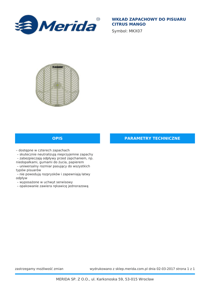 WKŁAD ZAPACHOWY DO PISUARU CITRUS MANGO Symbol: MKX07 OPIS PARAMETRY TECHNICZNE – dostępne w czterech zapachach – skutecznie neutralizują nieprzyjemne zapachy – zabezpieczają odpływy przed zapchaniem, np. niedopałkami, gumami do żucia, papierem – uniwersalny rozmiar pasujący do wszystkich typów pisuarów – nie powodują rozprysków i zapewniają łatwy odpływ – wyposażone w uchwyt serwisowy – opakowanie zawiera rękawicę jednorazową zastrzegamy możliwość zmian wydrukowano z sklep.merida.com.pl dnia 02-03-2017 strona 1 z 1 MERIDA SP. Z O.O., ul. Karkonoska 59, 53-015 Wrocław