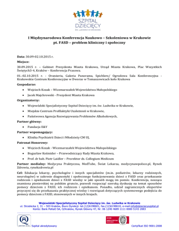 I Międzynarodowa Konferencja Naukowo – Szkoleniowa w Krakowie pt. FASD – problem kliniczny i społeczny Data: 30.09-02.10.2015 r. Miejsce: 30.09.2015 r. – Gabinet Prezydenta Miasta Krakowa, Urząd Miasta Krakowa, Plac Wszystkich Świętych3-4, Kraków – Konferencja Prasowa. 01.-02.10.2015 r. - Oranżeria, Galeria Panorama, Spichlerz/ Ogrodowa Sala Konferencyjna Krakowskie Centrum Konferencyjne w Dworze w Tomaszowicach koło Krakowa Gospodarze: Wojciech Kozak – Wicemarszałek Województwa Małopolskiego Jacek Majchrowski - Prezydent Miasta Krakowa Organizatorzy: Wojewódzki Specjalistyczny Szpital Dziecięcy im. św. Ludwika w Krakowie, Miejskie Centrum Profilaktyki Uzależnień w Krakowie, Państwowa Agencja Rozwiązywania Problemów Alkoholowych, Partner główny: Fundacja E&Y Partner wspomagający: Klinika Psychiatrii Dzieci i Młodzieży CM UJ, Patronat Honorowy: Wojciech Kozak - Wicemarszałek Województwa Małopolskiego Bogusław Kośmider – Przewodniczący Rady Miasta Krakowa, Prof. dr hab. Piotr Laidler – Prorektor ds. Collegium Medicum Partner medialny: Medycyna Praktyczna, MedTube, Świat Lekarza, medycynawpolsce.pl, Rynek Zdrowia, rynekzdrowia.pl Cel: Edukacja lekarzy, psychologów i innych specjalistów (m.in. pediatrów, lekarzy rodzinnych, neurologów) w zakresie diagnostyki i społecznego funkcjonowania dzieci z FASD oraz przekazanie rodzicom i opiekunom dzieci z FASD wiedzy w jaki sposób mogą im pomóc. Konferencja, nosząca znamiona pionierskiej na polskim gruncie, pozwoli rozpocząć szeroką dyskusję na temat sposobów pomocy dzieciom z FASD, ich rodzicom i opiekunom. Ponadto, udział zagranicznych ekspertów przyczyni się do przekazania praktycznej wiedzy i rozwiązań dotyczących systemowego podejścia do pomocy dzieciom z FASD, stosowanych w innych krajach. Wojewódzki Specjalistyczny Szpital Dziecięcy im. św. Ludwika w Krakowie ul. Strzelecka 2, 31 – 503 Kraków, Biuro Dyrekcji: tel.(12)6198601, fax.(12)6198610, e-mail:[email protected] Konto: Bank PeKaO SA, O/Kraków, Rynek Główny 47, Nr: 06 1240 4689 1111 0000 5143 2083 ……………………………………………………………………………………………………………………………………………………………………………. Szpital akredytowany Certyfikat ISO 9001:2008 PROGRAM Dzień I – 30.09.2015 godz. 12.00 – 14.00 Gabinet Prezydenta Miasta Krakowa, Urząd Miasta Krakowa, Plac Wszystkich Świętych3-4, Kraków Konferencja prasowa 1. 2. 3. 4. 5. 6. 7. 8. 9. Podpisanie porozumienia (Gabinet Prezydenta J. Majchrowskiego) Przedstawienie założeń konferencji Przedstawienie gości Pytania Obiad Zwiedzanie podziemi Rynku, okolicy Rynku oraz spacer na Wawel Przejazd do Tomaszowic, Zakwaterowanie Kolacja Dzień II - 01.10.2015 9.00 – 09.30 Rejestracja uczestników 09.30 – 09.50 Wprowadzenie i powitanie gości przez: Stanisław Stępniewski Dyrektor WSSD z im. św. Ludwika w Krakowie, Marek Sowa Marszałek Województwa Małopolskiego, Jacek Majchrowski Prezydent Miasta Krakowa, Powitanie prelegentów przez Dyrektora PARPA Krzysztofa Brzózkę 09.50 – 10.20 (30 min) Wykład:" Prenatal Alcohol Exposure and FASD" – prof. Kenneth Warren “Ekpozycja płodu na alkohol i FASD” 10.20 – 10.50 (30 min) Wykład: "International cooperation in the field of FASD" – dr Peggy Murray „Współpraca międzynarodowa FASD” 10.50 – 11.20 (30 min) Wykład: „FASD: Alterations in brain and behavior across the life span” - prof Edward Riley “FASD: Zmiany w mózgu i zachowaniu w ciągu całego życia”. 11.20 – 11.40 Przerwa kawowa/ Coffe break 11.40 – 12:10 (30 min) Wojewódzki Specjalistyczny Szpital Dziecięcy im. św. Ludwika w Krakowie ul. Strzelecka 2, 31 – 503 Kraków, Biuro Dyrekcji: tel.(12)6198601, fax.(12)6198610, e-mail:[email protected] Konto: Bank PeKaO SA, O/Kraków, Rynek Główny 47, Nr: 06 1240 4689 1111 0000 5143 2083 ……………………………………………………………………………………………………………………………………………………………………………. Szpital akredytowany Certyfikat ISO 9001:2008 Wykład: „Physical features of FAS” - prof Miguel del Campo Casanelles “ Cechy fizyczne FAS” 12.10 – 12.40 (30 min) Wykład: "Diagnostyka OUN u dzieci z FASD" – prof. dr hab. A. Urbanik “Diagnosis of CNS in children with FASD” 12.40 – 13.10 (30 min) Wykład: "Diagnostyka psychologiczna dzieci z FASD"- dr n. hum., psycholog T. Jadczak – Szumiło “Psychological diagnosis of children with FASD” 13.10 - 13.40 (30 min) Wykład: “Interventions for children with FASD and their families” ” - dr Christie Petrenko “Programy pracy z dziećmi z FASD i ich rodzinami” 13.40 – 14.40 Obiad/ Lunch 14.40 - 15.10 (30 min) Wykład „Socjokulturowe aspekty spożycia alkoholu w Polsce” dr n. med. Maciej Pilecki “Socio-cultural aspects of alcohol consumption in Poland” 15.10 – 15.40 (30 min) Wykład: „Pomoc dla dzieci z FASD w ramach publicznej służby zdrowia. Centrum Kompleksowej Diagnostyki i Terapii dla Dzieci z FASD w Wojewódzkim Specjalistycznym Szpitalu Dziecięcym im. św. Ludwika jako poszukiwanie modelu diagnozy i pomocy dzieciom z FASD” - lek. med. Joanna Boroń – Zyss Help for children with FASD in the public health service. Comprehensive Center of Diagnosis and Therapy for Children with FASD at the Regional Specialized Saint Ludwik Children Hospital as a search model of diagnosis and help children with FASD 15.40 – 16.10 (30 min) Wykład: “Nutrition factors in FASD” – prof. Christina Chambers “Aspekty żywieniowe i ich rola w FASD” 16:10 – 16:25 Przerwa kawowa/ Coffe break 16.25 – 16.55 (30 min) Wykład: „Ocena rozpowszechnienia FASD w Polsce (Projekt Alicja)” – Dyrektor PARPA Krzysztof Brzózka Wojewódzki Specjalistyczny Szpital Dziecięcy im. św. Ludwika w Krakowie ul. Strzelecka 2, 31 – 503 Kraków, Bi