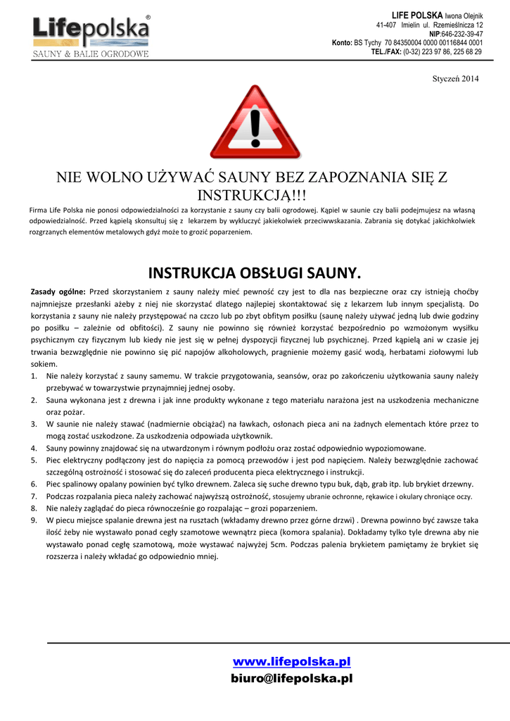 LIFE POLSKA Iwona Olejnik 41-407 Imielin ul. Rzemieślnicza 12 NIP:646-232-39-47 Konto: BS Tychy 70 84350004 0000 00116844 0001 TEL./FAX: (0-32) 223 97 86, 225 68 29 Styczeń 2014 NIE WOLNO UŻYWAĆ SAUNY BEZ ZAPOZNANIA SIĘ Z INSTRUKCJĄ!!! Firma Life Polska nie ponosi odpowiedzialności za korzystanie z sauny czy balii ogrodowej. Kąpiel w saunie czy balii podejmujesz na własną odpowiedzialność. Przed kąpielą skonsultuj się z lekarzem by wykluczyć jakiekolwiek przeciwwskazania. Zabrania się dotykać jakichkolwiek rozgrzanych elementów metalowych gdyż może to grozić poparzeniem. INSTRUKCJA OBSŁUGI SAUNY. Zasady ogólne: Przed skorzystaniem z sauny należy mieć pewność czy jest to dla nas bezpieczne oraz czy istnieją choćby najmniejsze przesłanki ażeby z niej nie skorzystać dlatego najlepiej skontaktować się z lekarzem lub innym specjalistą. Do korzystania z sauny nie należy przystępować na czczo lub po zbyt obfitym posiłku (saunę należy używać jedną lub dwie godziny po posiłku – zależnie od obfitości). Z sauny nie powinno się również korzystać bezpośrednio po wzmożonym wysiłku psychicznym czy fizycznym lub kiedy nie jest się w pełnej dyspozycji fizycznej lub psychicznej. Przed kąpielą ani w czasie jej trwania bezwzględnie nie powinno się pić napojów alkoholowych, pragnienie możemy gasić wodą, herbatami ziołowymi lub sokiem. 1. Nie należy korzystać z sauny samemu. W trakcie przygotowania, seansów, oraz po zakończeniu użytkowania sauny należy przebywać w towarzystwie przynajmniej jednej osoby. 2. Sauna wykonana jest z drewna i jak inne produkty wykonane z tego materiału narażona jest na uszkodzenia mechaniczne oraz pożar. 3. W saunie nie należy stawać (nadmiernie obciążać) na ławkach, osłonach pieca ani na żadnych elementach które przez to mogą zostać uszkodzone. Za uszkodzenia odpowiada użytkownik. 4. Sauny powinny znajdować się na utwardzonym i równym podłożu oraz zostać odpowiednio wypoziomowane. 5. Piec elektryczny podłączony jest do napięcia za pomocą przewodów i jest pod napięciem. Należy bezwzględnie zachować szczególną ostrożność i stosować się do zaleceń producenta pieca elektrycznego i instrukcji. 6. Piec spalinowy opalany powinien być tylko drewnem. Zaleca się suche drewno typu buk, dąb, grab itp. lub brykiet drzewny. 7. Podczas rozpalania pieca należy zachować najwyższą ostrożność, stosujemy ubranie ochronne, rękawice i okulary chroniące oczy. 8. Nie należy zaglądać do pieca równocześnie go rozpalając – grozi poparzeniem. 9. W piecu miejsce spalanie drewna jest na rusztach (wkładamy drewno przez górne drzwi) . Drewna powinno być zawsze taka ilość żeby nie wystawało ponad cegły szamotowe wewnątrz pieca (komora spalania). Dokładamy tylko tyle drewna aby nie wystawało ponad cegłę szamotową, może wystawać najwyżej 5cm. Podczas palenia brykietem pamiętamy że brykiet się rozszerza i należy wkładać go odpowiednio mniej. www.lifepolska.pl [email protected] LIFE POLSKA Iwona Olejnik 41-407 Imielin ul. Rzemieślnicza 12 NIP:646-232-39-47 Konto: BS Tychy 70 84350004 0000 00116844 0001 TEL./FAX: (0-32) 223 97 86, 225 68 29 10. Nie należy nadmiernie rozpalać pieca, a drzwiczki górne oraz popielnik powinny być zawsze zamknięte zgodnie z przeznaczeniem. 11. Temperaturę w piecu spalinowym reguluje się odpowiednim ustawieniem wlotu powietrza do pieca. W piecach elektrycznych zgodnie z instrukcją producenta. 12. Nie należy dotykać elementów pieca, mogą być one bardzo gorące !!! 13. W saunie za optymalną bezpieczną temperaturę dla użytkownika przyjmuje się 60 ÷110 °C przy wilgotności do 0-50%. Suma wskazań temperatury i wilgotności nie powinna przekraczać 110-120 Czas korzystania z sauny jest indywidualny dla każdego użytkownika lecz należy pamiętać żeby nie był zbyt długi. (może to być niebezpieczne dla zdrowia). 14. Podczas kąpieli w gorącej bali występuje bardzo duże parowanie i stężenie wilgotności, zatem spełnia ona również funkcje sauny i te kuracje nie powinny być łączone bezpośrednio. 15. Raz w roku lub częściej, w zależności od intensywności użytkowania, należy wnętrze sauny zabezpieczyć środkiem bakteriobójczym oraz olejem parafinowym. Do konserwacji zewnętrznej używa się impregnatów lub środków typu bejca z woskiem lub teflonem przeznaczonych do drewna. Można też zewnętrzną powierzchnie sauny pomalować odpowiednią farbą do drewna z przeznaczeniem zewnętrznym. 16. W saunie nie należy zbyt obficie polewać kamieni w piecu. 100 ml jednorazowo do całkowitego odparowania, polewamy tylko kamienie w pojemniku tak aby woda w nim pozostała. Polanie szyby w piecu spalinowym grozi jaj pęknięciem. 17. Nie należy zbyt mocno rozpalać pieca w saunie oraz pozostawiać go bez kontroli. Po zakończonym seansie należy sprawdzić czy piec wygasł oraz sprawdzić czy nie ma zagrożenia pożarem. W przypadku pieca elektrycznego należy wyłączyć go i sprawdzić czy przestał grzać oraz postępować zgodnie z instrukcją producenta. www.lifepolska.pl [email protected]