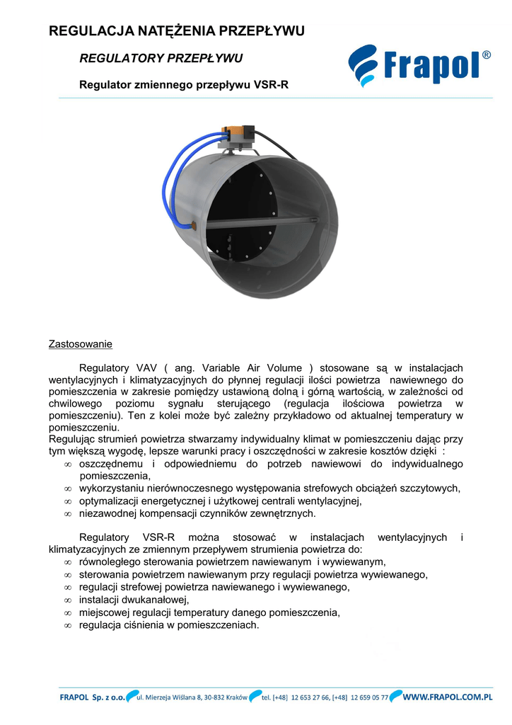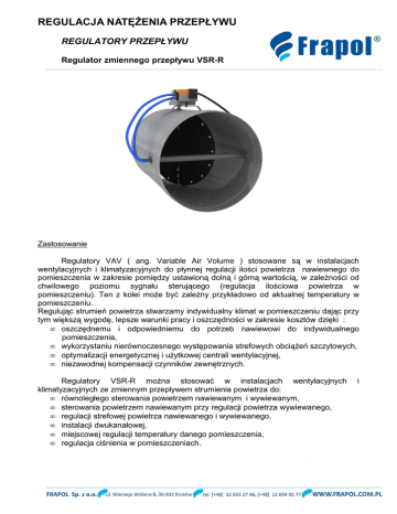 REGULACJA NATĘŻENIA PRZEPŁYWU REGULATORY PRZEPŁYWU Regulator zmiennego przepływu VSR-R Zastosowanie Regulatory VAV ( ang. Variable Air Volume ) stosowane są w instalacjach wentylacyjnych i klimatyzacyjnych do płynnej regulacji ilości powietrza nawiewnego do pomieszczenia w zakresie pomiędzy ustawioną dolną i górną wartością, w zależności od chwilowego poziomu sygnału sterującego (regulacja ilościowa powietrza w pomieszczeniu). Ten z kolei może być zależny przykładowo od aktualnej temperatury w pomieszczeniu. Regulując strumień powietrza stwarzamy indywidualny klimat w pomieszczeniu dając przy tym większą wygodę, lepsze warunki pracy i oszczędności w zakresie kosztów dzięki : • oszczędnemu i odpowiedniemu do potrzeb nawiewowi do indywidualnego pomieszczenia, • wykorzystaniu nierównoczesnego występowania strefowych obciążeń szczytowych, • optymalizacji energetycznej i użytkowej centrali wentylacyjnej, • niezawodnej kompensacji czynników zewnętrznych. Regulatory VSR-R można stosować w instalacjach wentylacyjnych klimatyzacyjnych ze zmiennym przepływem strumienia powietrza do: • równoległego sterowania powietrzem nawiewanym i wywiewanym, • sterowania powietrzem nawiewanym przy regulacji powietrza wywiewanego, • regulacji strefowej powietrza nawiewanego i wywiewanego, • instalacji dwukanałowej, • miejscowej regulacji temperatury danego pomieszczenia, • regulacja ciśnienia w pomieszczeniach. i REGULACJA NATĘŻENIA PRZEPŁYWU REGULATORY PRZEPŁYWU Regulator zmiennego przepływu VSR-R Sposób działania Zasada działania produkowanych przez Frapol regulatorów przepływu opiera się na pomiarze prędkości powietrza. Pomiar ten dokonywany jest za pomocą listwy pomiarowej, która umożliwia pomiar ciśnienia z obu jej stron, co prowadzi do bardzo dokładnego określenia różnicy ciśnień. Jest ona mierzona za pomocą dynamicznego czujnika ciśnienia, w którym wykorzystano precyzyjną termoanemometryczną zasadę pomiaru. Mierzone dzięki niej wartości zostają w elektronicznym regulatorze porównane z wartością zadaną. Jeżeli wartość mierzona jest inna niż zadana, siłownik przepustnicy regulacyjnej ustawia ją w takie położenie, aby nie występowała różnica pomiędzy wartością mierzoną a zadaną. Konstrukcja Korpus oraz przegroda regulatora o przekroju okrągłym VSR-R wykonane są ze stali ocynkowanej. Doszczelniona jest uszczelką gumową. Do pomiaru różnicy ciśnienia dynamicznego służą króćce umieszczone na stalowej listwie pomiarowej. Elementem sterującym jest siłownik Belimo w zależności od wariantu wykonania. Warianty wykonania Wykonanie standardowe: W wykonaniu standardowym regulator VSR-R wyposażony jest w siłownik VAV Compact, który umożliwia skuteczną regulację warunków w pomieszczeniu przy użyciu jednego urządzenia. Zestaw ten składa się z siłownika, regulatora oraz dynamicznego czujnika ciśnienia ( jako jedna zwarta jednostka typu LMV-D3-MP). Sposób sterowania regulatorem wyposażonym w siłownik VAV Compact: a) analogowe sterowanie ciągłe – siłownik reguluje przepływ powietrza w przedziale pomiędzy zadanymi nastawami VMIN … VMAX, według proporcjonalnej zależności ciągłego sygnału sterującego (2…10 V - standard, 0…10 V - opcja) do zaprogramowanego zakresu roboczego; możliwe są również niektóre wymuszone położenia b) analogowe sterowanie wymuszone (dostępne pozycje): • przepustnica w pozycji ,,ZAM’’ – zamknięcie przepustnic na doprowadzeniu i odprowadzeniu powietrza do nieużytkowych pomieszczeń pozwala na oszczędzanie energii. Ze względów technicznych sterowanie wymuszone do pozycji ,,ZAM’’ możliwe jest tylko w zakresie roboczym 2 …10V, ale generalnie tylko przy nastawie 0% VMIN. Jeżeli, przy zakresie roboczym 2… 10V – wejście ,,w’’ i przyłącze 1 zostaną zwarte, to siłownik steruje przepustnice do pozycji ,,ZAM’’. • przepustnica w pozycji ,,OTW’’ – wspomaganie oddymiania pomieszczeń albo jako pozycja bezpieczna. W tym przypadku następuje całkowite otwarcie przepustnicy. REGULACJA NATĘŻENIA PRZEPŁYWU REGULATORY PRZEPŁYWU Regulator zmiennego przepływu VSR-R • VMIN – minimalny przepływ objętościowy, w zależności od potrzeb, można przełączyć poszczególne strefy lub pomieszczenia w stan gotowości. Przy takiej pracy następuje tylko minimalne przewietrzanie pomieszczeń i znaczna redukcja energii. • VMAX – maksymalny przepływ objętościowy, pojedyncze pomieszczenia lub grupa pomieszczeń muszą być krótkotrwale zasilane maksymalnym strumieniem powietrza. W ten sposób możliwe jest przewietrzanie, wieczorne schładzanie lub poranne szybkie ogrzanie pomieszczenia. • VS – pozycja pośrednia, zarówno przy ręcznej jak i automatycznej wielostopniowej regulacji strumienia powietrza możliwe jest osiągnięcie-przy średniej wartości pomiędzy minimalną i maksymalna objętością przepływu, bardziej delikatnego stopniowania przepływu np.: przy sterowaniu w -zależności od jakości powietrza. c) cyfrowe sterowanie przy użyciu szyny Belimo MP-Bus, Regulatory VAV firmy Frapol mogą być również wykorzystywane do utrzymania stałego przepływu powietrza (praca jako CAV). Wszystkie regulatory VAV wyposażone są w szynę umożliwiającą komunikację cyfrową za pomocą protokołu MP-Bus. Możliwe jest łączenie regulatorów w grupy do 8 sztuk. Dostępne są regulatory dedykowane do (lub bramki umożliwiające standardowym regulatorom) komunikacji za pomocą protokołów: • regulatorem DDC z interfejsem szyny MP • systemami LonWorks • systemami EIB / Konnex • systemami Modbus RTU • systemami BACnet MS/TP Wykonanie specjalne : Regulatory VSR-R w wykonaniu specjalnym wymagają zastosowania układu sterującego typu VAV Universal – rozwiązania dostosowanego do zadania jakie ma spełnić regulator. Najczęściej stosowane regulatory w wykonaniu specjalnym umo