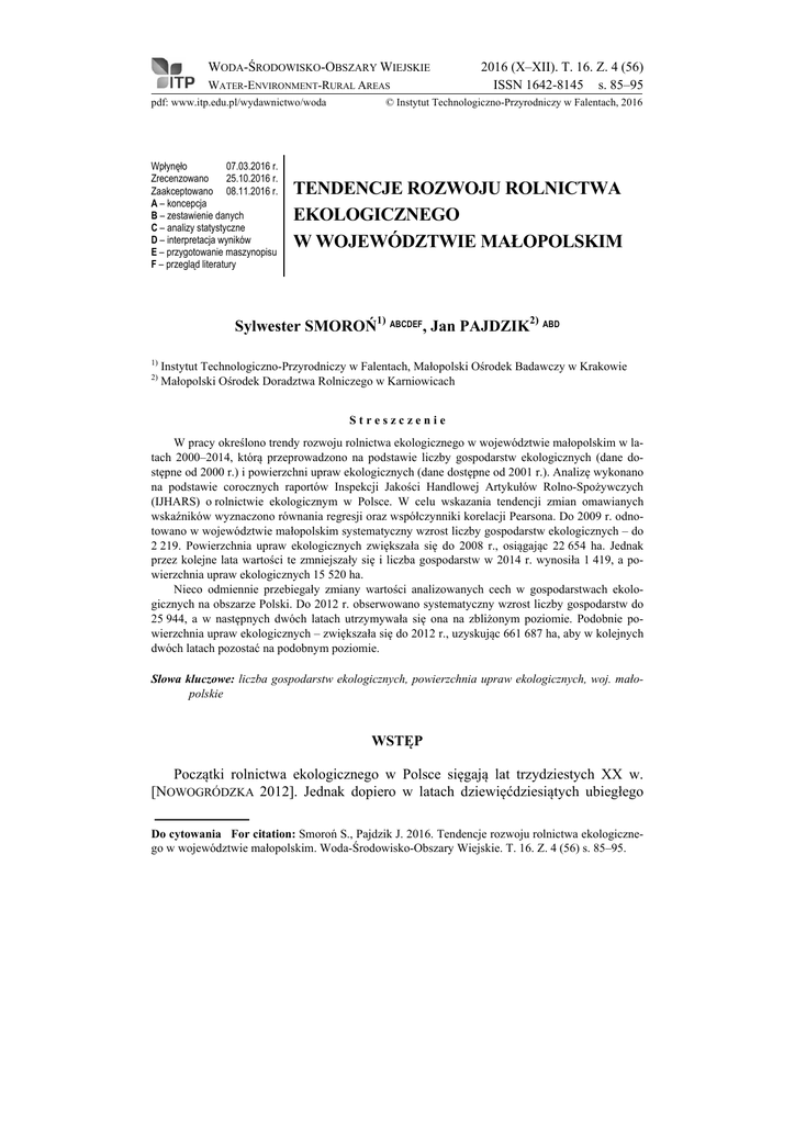 WODA-ŚRODOWISKO-OBSZARY WIEJSKIE WATER-ENVIRONMENT-RURAL AREAS pdf: www.itp.edu.pl/wydawnictwo/woda Wpłynęło 07.03.2016 r. Zrecenzowano 25.10.2016 r. Zaakceptowano 08.11.2016 r. A – koncepcja B – zestawienie danych C – analizy statystyczne D – interpretacja wyników E – przygotowanie maszynopisu F – przegląd literatury 2016 (X–XII). T. 16. Z. 4 (56) ISSN 1642-8145 s. 85–95 © Instytut Technologiczno-Przyrodniczy w Falentach, 2016 TENDENCJE ROZWOJU ROLNICTWA EKOLOGICZNEGO W WOJEWÓDZTWIE MAŁOPOLSKIM Sylwester SMOROŃ1) ABCDEF, Jan PAJDZIK2) ABD 1) 2) Instytut Technologiczno-Przyrodniczy w Falentach, Małopolski Ośrodek Badawczy w Krakowie Małopolski Ośrodek Doradztwa Rolniczego w Karniowicach Streszczenie W pracy określono trendy rozwoju rolnictwa ekologicznego w województwie małopolskim w latach 2000–2014, którą przeprowadzono na podstawie liczby gospodarstw ekologicznych (dane dostępne od 2000 r.) i powierzchni upraw ekologicznych (dane dostępne od 2001 r.). Analizę wykonano na podstawie corocznych raportów Inspekcji Jakości Handlowej Artykułów Rolno-Spożywczych (IJHARS) o rolnictwie ekologicznym w Polsce. W celu wskazania tendencji zmian omawianych wskaźników wyznaczono równania regresji oraz współczynniki korelacji Pearsona. Do 2009 r. odnotowano w województwie małopolskim systematyczny wzrost liczby gospodarstw ekologicznych – do 2 219. Powierzchnia upraw ekologicznych zwiększała się do 2008 r., osiągając 22 654 ha. Jednak przez kolejne lata wartości te zmniejszały się i liczba gospodarstw w 2014 r. wynosiła 1 419, a powierzchnia upraw ekologicznych 15 520 ha. Nieco odmiennie przebiegały zmiany wartości analizowanych cech w gospodarstwach ekologicznych na obszarze Polski. Do 2012 r. obserwowano systematyczny wzrost liczby gospodarstw do 25 944, a w następnych dwóch latach utrzymywała się ona na zbliżonym poziomie. Podobnie powierzchnia upraw ekologicznych – zwiększała się do 2012 r., uzyskując 661 687 ha, aby w kolejnych dwóch latach pozostać na podobnym poziomie. Słowa kluczowe: liczba gospodarstw ekologicznych, powierzchnia upraw ekologicznych, woj. małopolskie WSTĘP Początki rolnictwa ekologicznego w Polsce sięgają lat trzydziestych XX w. [NOWOGRÓDZKA 2012]. Jednak dopiero w latach dziewięćdziesiątych ubiegłego Do cytowania For citation: Smoroń S., Pajdzik J. 2016. Tendencje rozwoju rolnictwa ekologicznego w województwie małopolskim. Woda-Środowisko-Obszary Wiejskie. T. 16. Z. 4 (56) s. 85–95. 86 Woda-Środowisko-Obszary Wiejskie. T. 16. Z. 4 (56) wieku można zauważyć wzrost zainteresowania systemem produkcji żywności metodami ekologicznymi [KLIMA, SZAREK 2003]. W 1989 r., powstało Stowarzyszenie Producentów Żywności Metodami Ekologicznymi EKOLAND, skupiające grupę kilkudziesięciu rolników. Niemniej jednak zdecydowany rozwój rolnictwa ekologicznego nastąpił po 2000 r., wraz z wprowadzeniem krajowych dopłat do tego systemu produkcji [KOMOROWSKA 2006; PAWLEWICZ i in. 2010]. Zgodnie z ustawą o rolnictwie ekologicznym [Ustawa… 2009; 2014], ten system produkcji żywności i pasz łączy najkorzystniejsze dla środowiska praktyki, zachowanie różnorodności biologicznej, zasobów naturalnych oraz wysokich standardów dobrostanu zwierząt. Stosowanie substancji naturalnych w produkcji metodami ekologicznymi, zapewniających m.in. odpowiednią żyzność gleby, pozwala uzyskiwać dobrej jakości produkty pochodzenia roślinnego i zwierzęcego. W ekologicznym systemie produkcji minimalizowane są także nakłady energetyczne [KLIMA, SZAREK 2003]. Na obszarze województwa małopolskiego, zwłaszcza w regionie Przedgórza Karpackiego i Karpat, istnieją szczególnie sprzyjające warunki do rozwoju rolnictwa ekologicznego. Obecnie rolnictwo w tej części Polski charakteryzuje się małą intensyfikacją produkcji rolniczej (niskie nawożenie, z minimalnym stosowaniem środków ochrony roślin), co ułatwia konwersję na system ekologiczny [TWARDY i in. 2013]. Celem badań było określenie tendencji zmian rozwoju rolnictwa ekologicznego na obszarze województwa małopolskiego w latach 2000–2014. Analizę przeprowadzono na podstawie liczby gospodarstw i powierzchni upraw ekologicznych oraz powierzchni upraw ekologicznych przypadających na jedno gospodarstwo. Dodatkowo otrzymane wyniki porównano ze wskaźnikami dla obszaru całej Polski. METODY BADAŃ Analizę zmian zachodzących w liczbie gospodarstw i powierzchni upraw ekologicznych na obszarze województwa małopolskiego w latach 2000–2014 przeprowadzono na podstawie corocznych raportów IJHARS o rolnictwie ekologicznym w Polsce [IJHARS 2015]. Dane obejmujące liczbę gospodarstw ekologicznych były publikowane od 2000 r., a powierzchnię upraw ekologicznych od 2001 r. W pracy wykorzystano również dane Małopolskiego Ośrodka Doradztwa Rolniczego w Karniowicach obejmujące liczbę gospodarstw ekologicznych w poszczególnych powiatach za 2010 r. Na podstawie zgromadzonych danych przedstawiono w formie graficznej zmiany liczby gospodarstw ekologicznych, powierzchni upraw ekologicznych, a także powierzchni upraw ekologicznych przypadających na jedno gospodarstwo w rozpatrywanym okresie. Przeanalizowano również liczebność gospodarstw ekologicznych w poszczególnych powiatach województwa małopolskiego charakteryzujących się różną wartością wskaźnika waloryzacji rolniczej © ITP Woda Środ. Obsz. Wiej. 2016 (X–XII). T. 16. Z. 4 (56) 87 S. Smoroń, J. Pajdzik: Tendencje rozwoju rolnictwa ekologicznego… przestrzeni produkcyjnej (WRPP). Wskaźnik ten umożliwia ilościową i przestrzenną ocenę naturalnych czynników produkcji, decydujących o potencjalnej wydajności plonowania na poziomie lokalnym (gmin, powiatów, województw) [WITEK i in. 1993]. W celu wskazania tendencji zmian omawianych wskaźników wyznaczono równania regresji dla liczby gospodarstw ekologicznych w okresach 2000–2009 i 2010–2014, a d