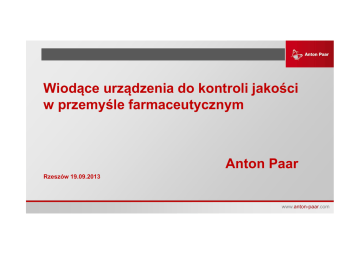 Wiodące urządzenia do kontroli jakości w przemyśle farmaceutycznym Anton Paar Rzeszów 19.09.2013 www.anton-paar.com 1. 2. 3. 4. 5. 6. 7. 8. 9. 10. 11. Kilka słów o nas Gęstościomierze Lepkościomierze Reometry Polarymetry Refraktometry Badania powierzchni materiałów: Pomiar potencjału Zeta Analiza nanostruktur (SAXS i WAXS) Reaktory do syntez i mineralizacja próbek Urządzenia procesowe Dokumentacja zgodna z wymogami Przemysłu Farmaceutycznego www.anton-paar.com Kilka słów o nas Utworzenie firmy 1922 Austria (Graz) Obecność na świecie 3 zakłady produkcyjne, oddziały w 17 krajach, dystrybutorzy w 68 krajach, 2 spółki joint venture Główne aplikacje pomiary gęstości oraz stężeń, analiza deformacji materiałów, badania właściwości płynięcia Inwestycje w R&D 20% rocznego obrotu System zarządzania jakością ISO 9001:2008 Anton Paar w Polsce Oddział Anton Paar Poland od ponad 20 lat poprzez kontakt dystrybutorski od 1 stycznia 2013 www.anton-paar.com Anton Paar na świecie Anton Paar GmbH 3 zakłady produkcyjne 17 oddziałów 68 dystrybutorów 2 spółki joint venture www.anton-paar.com www.anton-paar.com Pomiary gęstości i stężenia Zasada pomiaru Termometr platynowy: -umieszczony w celi gęstości -zapewnia najdokładniejszy odczyt i kontrolę temperatury www.anton-paar.com Pomiary gęstości i stężenia -pomiar gęstości oparty o oscylującą U-rurkę (metoda zgodna z Farmakopeą) -kontrola temperatury poprzez wydajny układ Peltiera -prosta procedura pomiarowa, mała objętość próbki , około 1ml -błędy podczas pomiaru są wykrywane automatycznie -kalibracja temperatury tylko w jednym punkcie pomiarowym -możliwość rozbudowywania o inne moduyły pomiarowe DMA 35 (gęstościomierz ręczny) DMA 500, DMA 4100M, DMA 4500 M, DMA 5000 M DSA 5000 M www.anton-paar.com Pomiary lepkości -niska objętość próbki , od 100 ul -kontrola temperatury poprzez wydajny układ Peltiera -wysoce precyzyjne pomiary -budowa modułowa -termostatowamie próbki w zakresie od +5 do 100 0C -zamknięty układ pomiarowy (w celu wyeliminowania zanieczyszczenia bądź parowania) -możliwość badania próbek nieprzezroczystych Lovis 2000 M Lovis 2000 ME www.anton-paar.com Pomiary reologiczne Badanie właściwości ciał lepkich, elastycznych i ciał o właściwościach wiskoelastycznych Wykorzystanie reologii w: -formulacji -symulacjach procesowych (jak produkt będzie sie zachowywał w trakcie procesu produkcyjnego) -badaniach właściwości powłok tabletek -konsystencji produktu końcowego -stabilności emlusji Nasze rozwiązania: Reometry serii RheolabQC (wykorzystywane głównie w działach Kontroli Jakości) Reometry serii MCR (dające większe możliwości pomiarowe, większa ilość akcesoriów) www.anton-paar.com Polarymetria Przykładowe wykorzystanie: badanie czystości enancjomeru po etapie oczyszczania (po rozdziale racematu na kolumnach chiralnych) -automatyczne dostosowanie metody pomiarowej do zastosowanej celi -pomiary dla kilku długości (opcja) -automatyczne procedury testów i kalibracji systemu -kontrola temperatury poprzez wydajny układ Peltiera -różnorodność cel pomiarowych (od objętości około 2ml) MCP 200 MCP 300 MCP 500 www.anton-paar.com Refraktometria -wykorzystanie do wszelkiego rodzaju próbek (przezroczyste, mętne, barwne w postaci stałej, toksyczne, trujące, nieprzezroczyste) -nie ma konieczności wczesniejszego przygotowywania próbek -szybka i wygodna analiza seryjna -różne cele pomiarowe w zależności od rodzaju próbki -urzadzenie może stanowić niezależny aparat lub stanowić część większego układu pomiarowego Abbemat 200, 300, 500 , 550 Abbemat HP (model o wysokiej precyzji) Abbemat HT (model do wysokich temperatur) Abbemat MW (model o kilku długościach fal) www.anton-paar.com Badanie potencjału Zeta Określenie zachowania się powierzchni dla aplikacji farmaceutycznych PRZYKŁAD 1: Badania: polimerów, powerzchni szklanych i metalowych np., wykorzystywanych w urządzeniach medycznych (przewody z tworzyw, membrany do dializ) Ważne jest aby okreslić czy składniki takie jak np. API, dodatki, białka adsorbują się na powierzchni materiałów PRZYKŁAD 2: Badanie powłok tabletek odpornych na wilgoć -zastosowanie do prawie wszystkich rodzajów powierzchni -dostępne różne cele pomiarowe dostosowane do różnych materiałów -określanie potencjału Zeta materiałów porowatych SurPASS www.anton-paar.com Badanie nanostruktur SAXSpace -wykorzystanie rozpraszania promieni rentgenowskich przy wąskim koncie (SAXS: small angle X-ray scattering) i przy szerokim kącie (WAXS: wide angle X-ray scattering) WAXS: badanie strukury cząstki SAXS: badanie nanostruktur -kompaktowa budowa i krótki czas pomiaru -pełna elastyczność podczas badań: duża komora na próbkę -bardzo niskie tło, co jest bardzo ważne przy analizie próbek, które lekko rozpraszają promienie X -płynne przejście między analizą WAXS i SAXS (WAXS+SAXS= SWAXS) -wysoka rozdzielczość w całym zakresie pomiarowym SAXSpace www.anton-paar.com Reaktory do syntez i mineralizacja próbek Reaktory do mineralizacji * Reaktory do syntez * -mineralizacja w układzie zamkniętym -temp. do 3000C przy mineralizacji HCl -minimalne zużycie odczynników -możliwość mineralizacji trudno rozkładających się próbek organicznych -mineralizacja do 48 próbek jednocześnie -prosta metoda transferu skali produkcji od mikro do produkcji w kilogramach Multiwave PRO High Pressure Asher HPA-S Monowave 300 Monowave PRO Monowave BTR *Dystrybutorem na terenie Polski jest firma COMEF -zmniejszony czas prowadzenia badań w działach R&D i syntez -szybkie i jednolite grzanie dla każdej skali produkcyjnej www.anton-paar.com Urządzenia procesowe- pomiary on-line Ponad 30 letnie doświadczenie w aplikacjach procesowych. Zaufały nam największe firmy m.in. z branży spożywczej, petrochemicznej DPRn- pomiar oparty o oscylującą U-rurkę SPRn – pomiar oparty o po