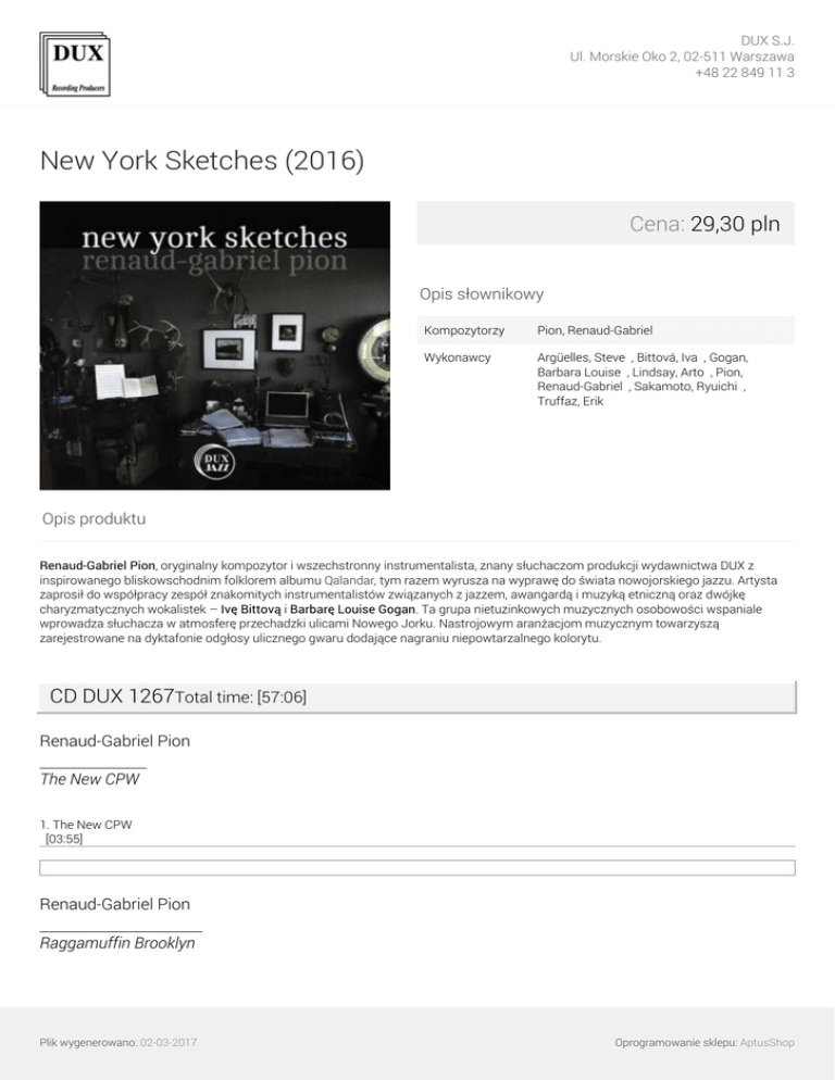 DUX S.J. Ul. Morskie Oko 2, 02-511 Warszawa +48 22 849 11 3 New York Sketches (2016) Cena: 29,30 pln Opis słownikowy Kompozytorzy Pion, Renaud-Gabriel ∎ Wykonawcy Argüelles, Steve ∎, Bittová, Iva ∎, Gogan, Barbara Louise ∎, Lindsay, Arto ∎, Pion, Renaud-Gabriel ∎, Sakamoto, Ryuichi ∎, Truffaz, Erik ∎ Opis produktu Renaud-Gabriel Pion, oryginalny kompozytor i wszechstronny instrumentalista, znany słuchaczom produkcji wydawnictwa DUX z inspirowanego bliskowschodnim folklorem albumu Qalandar, tym razem wyrusza na wyprawę do świata nowojorskiego jazzu. Artysta zaprosił do współpracy zespół znakomitych instrumentalistów związanych z jazzem, awangardą i muzyką etniczną oraz dwójkę charyzmatycznych wokalistek – Ivę Bittovą i Barbarę Louise Gogan. Ta grupa nietuzinkowych muzycznych osobowości wspaniale wprowadza słuchacza w atmosferę przechadzki ulicami Nowego Jorku. Nastrojowym aranżacjom muzycznym towarzyszą zarejestrowane na dyktafonie odgłosy ulicznego gwaru dodające nagraniu niepowtarzalnego kolorytu. CD DUX 1267Total time: [57:06] Renaud-Gabriel Pion The New CPW 1. The New CPW [03:55] Renaud-Gabriel Pion Raggamuffin Brooklyn Plik wygenerowano: 02-03-2017 Oprogramowanie sklepu: AptusShop DUX S.J. Ul. Morskie Oko 2, 02-511 Warszawa +48 22 849 11 3 2. Raggamuffin Brooklyn [02:45] Renaud-Gabriel Pion Sourceless Light 3. Sourceless Light (lyrics: Arto Lindsay) [03:33] Renaud-Gabriel Pion Punjab To NY 4. Punjab To NY [06:41] Renaud-Gabriel Pion Land 5. Land (lyrics: Barbara Louise Gogan) [05:30] Renaud-Gabriel Pion New Moon Over City Hall 6. New Moon Over City Hall [04:00] Renaud-Gabriel Pion Extérieur Nuit 2 7. Extérieur Nuit 2 [05:35] Plik wygenerowano: 02-03-2017 Oprogramowanie sklepu: AptusShop DUX S.J. Ul. Morskie Oko 2, 02-511 Warszawa +48 22 849 11 3 Renaud-Gabriel Pion Radio Audience (Twist) 8. Radio Audience (Twist) [04:10] Renaud-Gabriel Pion Traffic Jam! 9. Traffic Jam! [03:17] Renaud-Gabriel Pion Palestrina 10. Palestrina [04:44] Renaud-Gabriel Pion Fanfare In A Cab 11. Fanfare In A Cab [01:48] Renaud-Gabriel Pion B Train 12. B Train [01:46] Plik wygenerowano: 02-03-2017 Oprogramowanie sklepu: AptusShop DUX S.J. Ul. Morskie Oko 2, 02-511 Warszawa +48 22 849 11 3 Renaud-Gabriel Pion 2nd Opening Night 13. 2nd Opening Night [04:03] Renaud-Gabriel Pion Extérieur Nuit 1 14. Extérieur Nuit 1 [04:19] Renaud-Gabriel Pion Eternity Is A Long Time 15. Eternity Is A Long Time [04:43] Wykonawcy: Arto Lindsay /śpiew, gitara elektryczna/ Barbara Louise Gogan /śpiew/ Erik Truffaz /trąbka/ Iva Bittová /śpiew/ Renaud-Gabriel Pion /fortepian, instr. dęte drewniane/ Ryuichi Sakamoto /fortepian/ Steve Argüelles /dms i perkusja/ Plik wygenerowano: 02-03-2017 Powered by TCPDF (www.tcpdf.org) Oprogramowanie sklepu: AptusShop