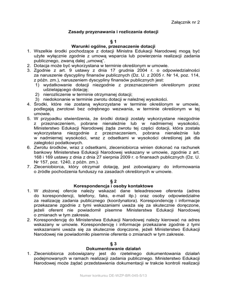 Załącznik nr 2 Zasady przyznawania i rozliczania dotacji 1. 2. 3. 4. 5. 6. 7. §1 Warunki ogólne, przeznaczenie dotacji Wszelkie środki pochodzące z dotacji Ministra Edukacji Narodowej mogą być użyte wyłącznie zgodnie z umową wsparcia lub powierzenia realizacji zadania publicznego, zwaną dalej „umową”. Dotacja może być wykorzystana w terminie określonym w umowie. Zgodnie z art. 9 ustawy z dnia 17 grudnia 2004 r. o odpowiedzialności za naruszenie dyscypliny finansów publicznych (Dz. U. z 2005 r. Nr 14, poz. 114, z późn. zm.), naruszeniem dyscypliny finansów publicznych jest: 1) wydatkowanie dotacji niezgodnie z przeznaczeniem określonym przez udzielającego dotację; 2) nierozliczenie w terminie otrzymanej dotacji; 3) niedokonanie w terminie zwrotu dotacji w należnej wysokości. Środki, które nie zostaną wykorzystane w terminie określonym w umowie, podlegają zwrotowi bez odrębnego wezwania, w terminie określonym w tej umowie. W przypadku stwierdzenia, że środki dotacji zostały wykorzystane niezgodnie z przeznaczeniem, pobrane nienależnie lub w nadmiernej wysokości, Ministerstwo Edukacji Narodowej żąda zwrotu tej części dotacji, która została wykorzystana niezgodnie z przeznaczeniem, pobrana nienależnie lub w nadmiernej wysokości, wraz z odsetkami w wysokości określonej jak dla zaległości podatkowych. Zwrotu środków, wraz z odsetkami, zleceniobiorca winien dokonać na rachunek bankowy Ministerstwa Edukacji Narodowej wskazany w umowie, zgodnie z art. 168 i 169 ustawy z dnia z dnia 27 sierpnia 2009 r. o finansach publicznych (Dz. U. Nr 157, poz. 1240, z późn. zm.). Zleceniobiorca, który otrzymał dotację, jest zobowiązany do informowania o źródle pochodzenia funduszy na zasadach określonych w umowie. §2 Korespondencja i osoby kontaktowe 1. W złożonej ofercie należy wskazać dane teleadresowe oferenta (adres do korespondencji, telefony, faks, e-mail itp.) oraz osoby odpowiedzialne za realizację zadania publicznego (koordynatora). Korespondencję i informacje przekazane zgodnie z tymi wskazaniami uważa się za skutecznie doręczone, jeżeli oferent nie powiadomił pisemne Ministerstwa Edukacji Narodowej o zmianach w tym zakresie. 2. Korespondencję do Ministerstwa Edukacji Narodowej należy kierować na adres wskazany w umowie. Korespondencję i informacje przekazane zgodnie z tymi wskazaniami uważa się za skutecznie doręczone, jeżeli Ministerstwo Edukacji Narodowej nie powiadomiło pisemnie oferenta o zmianach w tym zakresie. §3 Dokumentowanie działań 1. Zleceniobiorca zobowiązany jest do rzetelnego dokumentowania działań podejmowanych w ramach realizacji zadania publicznego. Ministerstwo Edukacji Narodowej może żądać przedstawienia dokumentacji w trakcie kontroli realizacji Numer konkursu DE-WZP-BR-045-5/13 zadania, a także w trakcie oceny sprawozdania końcowego lub częściowego z realizacji zadania. 2. Dokumentacja, o której mowa w ust. 1, musi zawierać w szczególności: 1) w przypadku warsztatów, seminariów, spotkań, konferencji, obozów, kolonii oraz szkoleń : a) listę uczestników zawierającą imię, nazwisko, miejsce zamieszkania, podpis uczestnika oraz, jeżeli dotyczy, nazwę organizacji/instytucji i funkcję uczestnika, b) listę podmiotów, z którymi zleceniobiorca zawarł umowy cywilnoprawne (trenerów, wykładowców, wychowawców), wraz z umowami, c) szczegółowy program, wraz z nazwiskami osób odpowiedzialnych za prowadzenie poszczególnych elementów, d) kopie materiałów rozdawanych uczestnikom, e) raporty, materiały wypracowane podczas warsztatów, f) kopie ankiet ewaluacyjnych, g) raport ewaluacyjny (lub inną formę oceny przewidzianej w zadaniu); 2) w przypadku staży i wizyt studyjnych: a) listę uczestników stażu/wizyty studyjnej, zawierającą imię, nazwisko, miejsce zamieszkania, nazwę organizacji/instytucji, funkcję uczestnika oraz podpis, b) szczegółowy program stażu/wizyty studyjnej, c) oryginały podpisanych indywidualnych ankiet ewaluacyjnych opisujących przebieg i oceniających wyniki stażu/wizyty studyjnej, d) listę podmiotów odpowiedzialnych za realizację staży/wizyt studyjnych (gospodarze wizyt, opiekunowie staży); 3) w przypadku zadań wydawniczych (w tym publikacji elektronicznych): a) po jednym egzemplarzu wszystkich opublikowanych materiałów, b) pliki elektroniczne zawierające opracowaną publikację utrwalone na powszechnie używanym nośniku takim jak: płyta CD, DVD, pendrive, itp. 1. 2. 3. 4. §4 Zasady dotyczące opracowania kalkulacji kosztów Kalkulację kosztów należy sporządzić w złotych polskich według tabeli w formularzu elektronicznym. Koszty i ich kategorie uwzględnione w kalkulacji zadania muszą mieć swoje odzwierciedlenie w szczegółowym opisie zadania. W ramach kalkulacji powinny być wyraźnie wydzielone poszczególne kategorie kosztów działania zaplanowane w ramach zadania i opisane w formularzu (np. w przypadku działania o nazwie „pięciodniowe warsztaty dla samorządu uczniowskiego” w kalkulacji wyróżniamy następujące kategorie: koszty wynagrodzenia trenerów, koszty udostępnienia sali, koszty zakwaterowania uczestników, zakup biletów na dojazdy na warsztaty itp.) Kalkulacja powinna w możliwie najlepszy sposób pokazywać sposób wyliczenia kosztów jak wskazano w formularzu elektronicznym, np.: Kategoria kosztów: koszty wynagrodzenia 2 trenerów w trakcie 5-dniowych warsztatów Koszt jednostkowy: 80 PLN Jednostka: osobo/dzień Liczba jednostek: 10 Koszt całkowity: 800 PLN Numer konkursu DE-WZP-BR-045-5/13 Dla dokładnego zobrazowania metody kalkulacji, zleceniobiorca może skorzystać z pola w formularzu „Uwagi mogące mieć znaczenie przy ocenie kosztorysu”. 5. Poszczególne rodzaje kosztów w kalkulacji należy umieścić w odpowiedniej części formularza elektronicznego: koszty merytoryczne, koszty obsługi, w tym koszty administracyjne, inne koszty, w tym koszty m.in. promocji. 6. Koszty