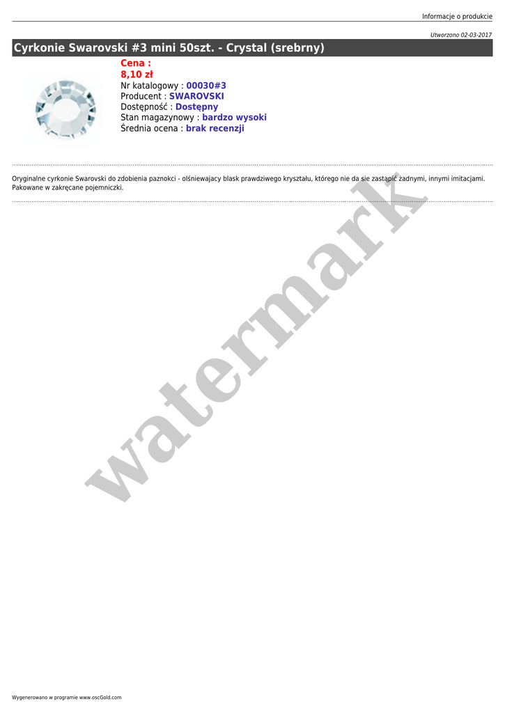 Informacje o produkcie Utworzono 02-03-2017 Cyrkonie Swarovski #3 mini 50szt. - Crystal (srebrny) Cena : 8,10 zł Nr katalogowy : 00030#3 Producent : SWAROVSKI Dostępność : Dostępny Stan magazynowy : bardzo wysoki Średnia ocena : brak recenzji w at er m ar k Oryginalne cyrkonie Swarovski do zdobienia paznokci - olśniewajacy blask prawdziwego kryształu, którego nie da sie zastąpić żadnymi, innymi imitacjami. Pakowane w zakręcane pojemniczki. Wygenerowano w programie www.oscGold.com
