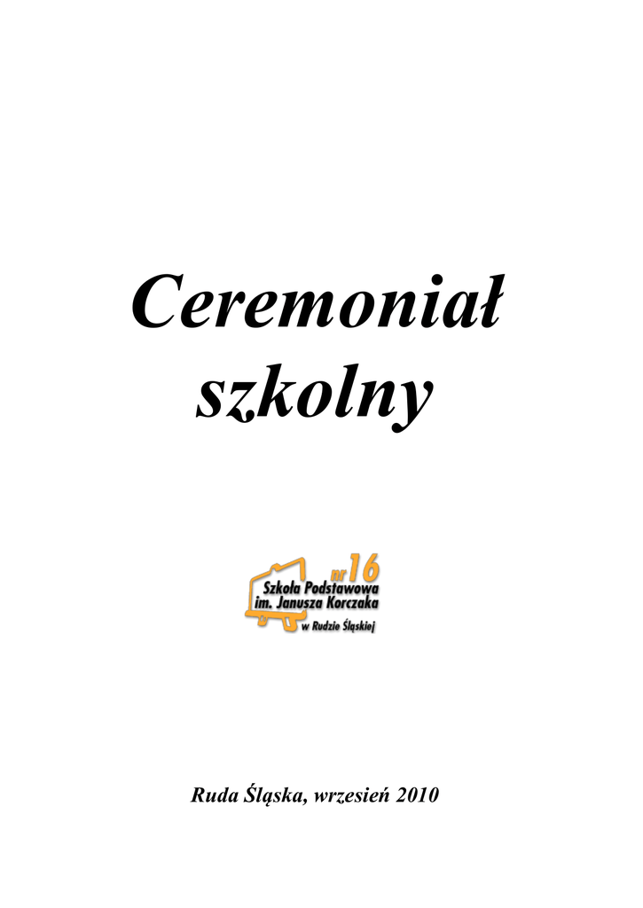 Ceremoniał szkolny Ruda Śląska, wrzesień 2010 Wstęp Zgodnie z zapisem znajdującym się we wstępie do Ustawy z dnia 7 września 1991 r. o systemie oświaty: „Kształcenie i wychowanie służy rozwijaniu u młodzieży poczucia odpowiedzialności, miłości ojczyzny oraz poszanowania dla polskiego dziedzictwa kulturowego, przy jednoczesnym otwarciu się na wartości kultur Europy i świata. Szkoła winna zapewnić każdemu uczniowi warunki niezbędne do jego rozwoju, przygotować go do wypełniania obowiązków rodzinnych i obywatelskich w oparciu o zasady solidarności, demokracji, tolerancji, sprawiedliwości i wolności” oraz artykułem 4 ustawy, gdzie czytamy: „Nauczyciel w swoich działaniach dydaktycznych, wychowawczych i opiekuńczych ma obowiązek kierowania się dobrem uczniów, troską o ich zdrowie, postawę moralną i obywatelską z poszanowaniem godności osobistej ucznia” opracowano ceremoniał szkolny w którym, zdefiniowano najważniejsze pojęcia, określono sposoby przeprowadzania najważniejszych uroczystości szkolnych oraz określono zasady zachowania się uczniów w trakcie tych uroczystości. Szkoła Podstawowa nr 16 w Rudzie Śląskiej posiada: 1. Patrona – Janusza Korczaka, 2. Sztandar, 3. Ceremoniał szkolny. Uroczystości szkolne. 1. Do najważniejszych uroczystości tworzących ceremoniał szkolny należą: a) rozpoczęcie i zakończenie roku szkolnego, b) uroczystość wręczenia szkole sztandaru, c) inne uroczystości szkolne odbywające się z udziałem sztandaru szkoły( pożegnanie nauczycieli-emerytów, wręczenie stypendiów Prezesa Rady Ministrów, pasowanie uczniów klas pierwszych, uroczystości związane z patronem, pożegnanie uczniów ostatnich klas), d) uroczystości nawiązujące do rocznic ważnych wydarzeń historycznych: 2 Maja(święto flagi), 3 Maja, 11 Listopada. Symbole narodowe. 1. Godło i flaga są symbolami państwa, do których należy odnosić się z należną czcią i szacunkiem. 2. Znaki państwowe maja pierwszeństwo przed każdym innym znakiem. 3. Godło państwowe umieszcza się w każdej sali lekcyjnej oraz pomieszczeniach administracyjnych w centralnym miejscu. 4. Polska flaga narodowa zachowuje proporcje płata 5 : 8 i składa się z dwóch poziomych stref biało-czerwonych. 5. Polską flagę narodową umieszcza się zawsze po lewej stronie (bramy, wejścia, mównicy, głównej dekoracji, innej flagi itd.). 6. Polska flaga narodowa wywieszona na drzewcu musi mieć białą część płata u góry, a wywieszona pod kątem (do 90°) również zachowuje ten układ. 7. Polska flaga narodowa wywieszona w układzie pionowym musi mieć białą część płata po lewej stronie lub od strony masztu. 8. Polska flaga narodowa udrapowana musi mieć białą cześć płata u góry. 9. W przypadku wywieszania kilku flag wywiesza się je zgodnie z hierarchią: a) 1 - polska flaga narodowa, b) 2 - flaga innego państwa, c) 3 - flaga organizacji międzynarodowych, w tym UE, d) 4 - flaga wojewódzka, e) 5 - flaga powiatu, f) 6 - flaga gminy, g) 7 - flaga służbowa, h) 8 - flaga instytucji lub organizacji lokalnej (branżowej), i) Wśród flag równorzędnych w hierarchii pierwszeństwo ma flaga gospodarza. 10. Jeżeli flaga państwowa jest eksponowana w jednej linii z innymi flagami (np. samorządowymi) lub flagami innych krajów, powinna zajmować pozycję uprzywilejowaną, tj. skrajną na prawo. 11. Flagi organizacji międzynarodowych (np. Unii Europejskiej) nie mają statusu flag państwowych i powinny zajmować drugie miejsce w stosunku do flagi państwowej, tj. po lewej stronie. Zasady oddawania honorów i okazywania czci symbolom narodowym i innym symbolom. 1. Członkowie społeczności szkolnej podczas uroczystości i w sytuacjach tego wymagających, okazują cześć i oddają honory symbolom narodowym i innym symbolom poprzez przyjęcie postawy zasadniczej i zwrócenie się twarzą w kierunku tych symboli. 2. Członkowie społeczności szkolnej podczas salutowania symbolom narodowym lub innym symbolom, przyjmują postawę zasadniczą i oddają im cześć poprzez zwrócenie się twarzą do danych symboli i pochylenie głowy. 3. Członkowie społeczności szkolnej, podczas śpiewania lub odtwarzania hymnu państwowego lub hymnów innych państw lub organizacji międzynarodowych zwracają się twarzą do sztandaru szkoły (symboli narodowych polskich: godła lub flagi, bądź w kierunku głównej dekoracji – zależnie od okoliczności), zdejmują nakrycie głowy i przyjmują postawę zasadniczą . 4. W szczególnie uroczystych okazjach, ale tylko wtedy, gdy okoliczności za tym przemawiają, przewiduje się okazywanie szacunku sztandarowi (fladze) poprzez ucałowanie jego dolnej, swobodnej krawędzi. W tym celu osoba (osoby) chcąca w ten sposób uczcić sztandar (flagę) podchodzi do pocztu sztandarowego krokiem marszowym, przyklęka na prawe kolano, prawą ręką chwyta za dolną swobodną krawędź sztandaru (flagi) i lekko pochylając głowę, podnosi ją na wysokość ust, ale nie dotyka go ustami – pocałunek ma wyłącznie wymiar symboliczny. Sztandar szkoły. 1. Szkoła posiada sztandar. 2. Sztandar szkoły jest głównym symbolem całej szkolnej społeczności. 3. Sztandar szkoły przechowywany jest w szkole, w miejscu do tego przeznaczonym. 4. Członkowie społeczności szkolnej winni okazywać szacunek sztandarowi szkoły. 5. W skład pocztu sztandarowego wchodzą wybrani uczniowie klas piątych i szóstych o nienagannej postawie i godni tego zaszczytu. 6. Kandydatury składu pocztu sztandarowego zgłaszane są przez wychowawców oraz nauczycieli uczących w klasach piątych i szóstych. 7. Decyzją rady pedagogicznej uczniowie mogą być odwołani ze składu pocztu sztandarowego. W takim wypadku dokonuje się kolejnego wyboru. 8. Kadencja pocztu trwa jeden rok – począwszy od ślubowania w dniu uroczystego zakończenia szkoły przez klasy szóste. Po skończeniu kadencji uczniowie otrzymują pamiątkowe dyp