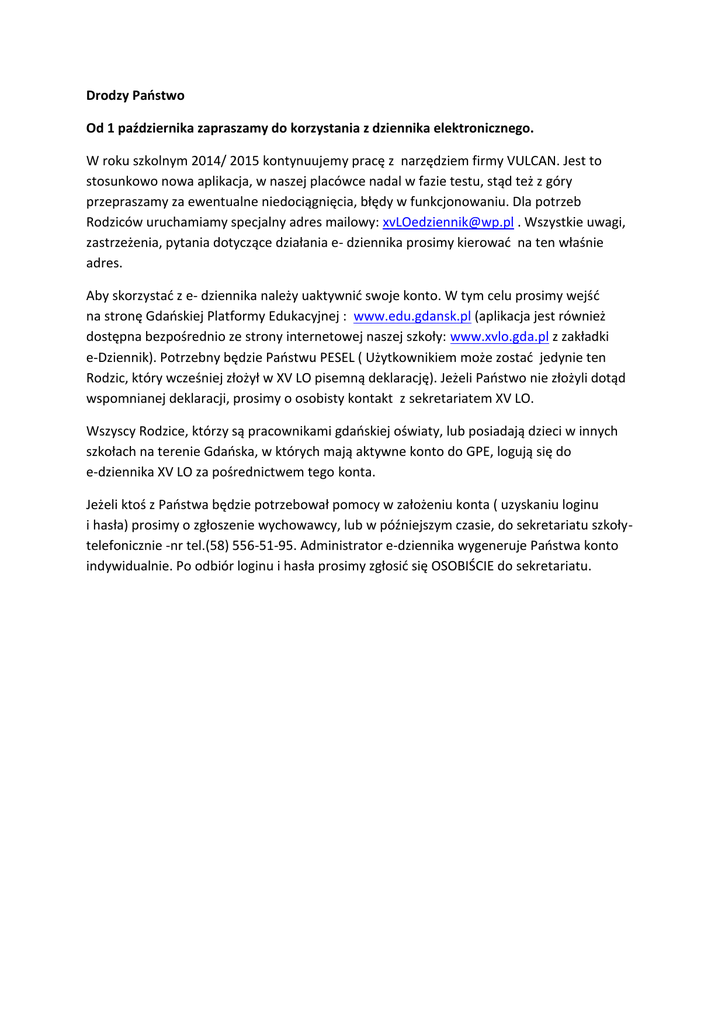 Drodzy Państwo Od 1 października zapraszamy do korzystania z dziennika elektronicznego. W roku szkolnym 2014/ 2015 kontynuujemy pracę z narzędziem firmy VULCAN. Jest to stosunkowo nowa aplikacja, w naszej placówce nadal w fazie testu, stąd też z góry przepraszamy za ewentualne niedociągnięcia, błędy w funkcjonowaniu. Dla potrzeb Rodziców uruchamiamy specjalny adres mailowy: [email protected] . Wszystkie uwagi, zastrzeżenia, pytania dotyczące działania e- dziennika prosimy kierować na ten właśnie adres. Aby skorzystać z e- dziennika należy uaktywnić swoje konto. W tym celu prosimy wejść na stronę Gdańskiej Platformy Edukacyjnej : www.edu.gdansk.pl (aplikacja jest również dostępna bezpośrednio ze strony internetowej naszej szkoły: www.xvlo.gda.pl z zakładki e-Dziennik). Potrzebny będzie Państwu PESEL ( Użytkownikiem może zostać jedynie ten Rodzic, który wcześniej złożył w XV LO pisemną deklarację). Jeżeli Państwo nie złożyli dotąd wspomnianej deklaracji, prosimy o osobisty kontakt z sekretariatem XV LO. Wszyscy Rodzice, którzy są pracownikami gdańskiej oświaty, lub posiadają dzieci w innych szkołach na terenie Gdańska, w których mają aktywne konto do GPE, logują się do e-dziennika XV LO za pośrednictwem tego konta. Jeżeli ktoś z Państwa będzie potrzebował pomocy w założeniu konta ( uzyskaniu loginu i hasła) prosimy o zgłoszenie wychowawcy, lub w późniejszym czasie, do sekretariatu szkołytelefonicznie -nr tel.(58) 556-51-95. Administrator e-dziennika wygeneruje Państwa konto indywidualnie. Po odbiór loginu i hasła prosimy zgłosić się OSOBIŚCIE do sekretariatu.