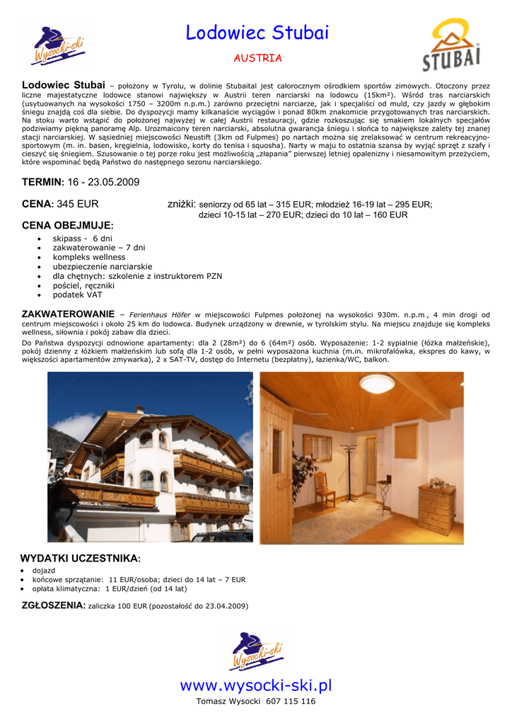 Lodowiec Stubai AUSTRIA Lodowiec Stubai – położony w Tyrolu, w dolinie Stubaital jest całorocznym ośrodkiem sportów zimowych. Otoczony przez liczne majestatyczne lodowce stanowi największy w Austrii teren narciarski na lodowcu (15km²). Wśród tras narciarskich (usytuowanych na wysokości 1750 – 3200m n.p.m.) zarówno przeciętni narciarze, jak i specjaliści od muld, czy jazdy w głębokim śniegu znajdą coś dla siebie. Do dyspozycji mamy kilkanaście wyciągów i ponad 80km znakomicie przygotowanych tras narciarskich. Na stoku warto wstąpić do położonej najwyżej w całej Austrii restauracji, gdzie rozkoszując się smakiem lokalnych specjałów podziwiamy piękną panoramę Alp. Urozmaicony teren narciarski, absolutna gwarancja śniegu i słońca to największe zalety tej znanej stacji narciarskiej. W sąsiedniej miejscowości Neustift (3km od Fulpmes) po nartach można się zrelaksować w centrum rekreacyjnosportowym (m. in. basen, kręgielnia, lodowisko, korty do tenisa i squosha). Narty w maju to ostatnia szansa by wyjąć sprzęt z szafy i cieszyć się śniegiem. Szusowanie o tej porze roku jest możliwością „złapania” pierwszej letniej opalenizny i niesamowitym przeżyciem, które wspominać będą Państwo do następnego sezonu narciarskiego. TERMIN: 16 - 23.05.2009 CENA: 345 EUR zniżki: seniorzy od 65 lat – 315 EUR; młodzież 16-19 lat – 295 EUR; dzieci 10-15 lat – 270 EUR; dzieci do 10 lat – 160 EUR CENA OBEJMUJE: • • • • • • • skipass - 6 dni zakwaterowanie – 7 dni kompleks wellness ubezpieczenie narciarskie dla chętnych: szkolenie z instruktorem PZN pościel, ręczniki podatek VAT ZAKWATEROWANIE – Ferienhaus Höfer w miejscowości Fulpmes położonej na wysokości 930m. n.p.m., 4 min drogi od centrum miejscowości i około 25 km do lodowca. Budynek urządzony w drewnie, w tyrolskim stylu. Na miejscu znajduje się kompleks wellness, siłownia i pokój zabaw dla dzieci. Do Państwa dyspozycji odnowione apartamenty: dla 2 (28m²) do 6 (64m²) osób. Wyposażenie: 1-2 sypialnie (łóżka małżeńskie), pokój dzienny z łóżkiem małżeńskim lub sofą dla 1-2 osób, w pełni wyposażona kuchnia (m.in. mikrofalówka, ekspres do kawy, w większości apartamentów zmywarka), 2 x SAT-TV, dostęp do Internetu (bezpłatny), łazienka/WC, balkon. WYDATKI UCZESTNIKA: • • • dojazd końcowe sprzątanie: 11 EUR/osoba; dzieci do 14 lat – 7 EUR opłata klimatyczna: 1 EUR/dzień (od 14 lat) ZGŁOSZENIA: zaliczka 100 EUR (pozostałość do 23.04.2009) www.wysocki-ski.pl Tomasz Wysocki 607 115 116