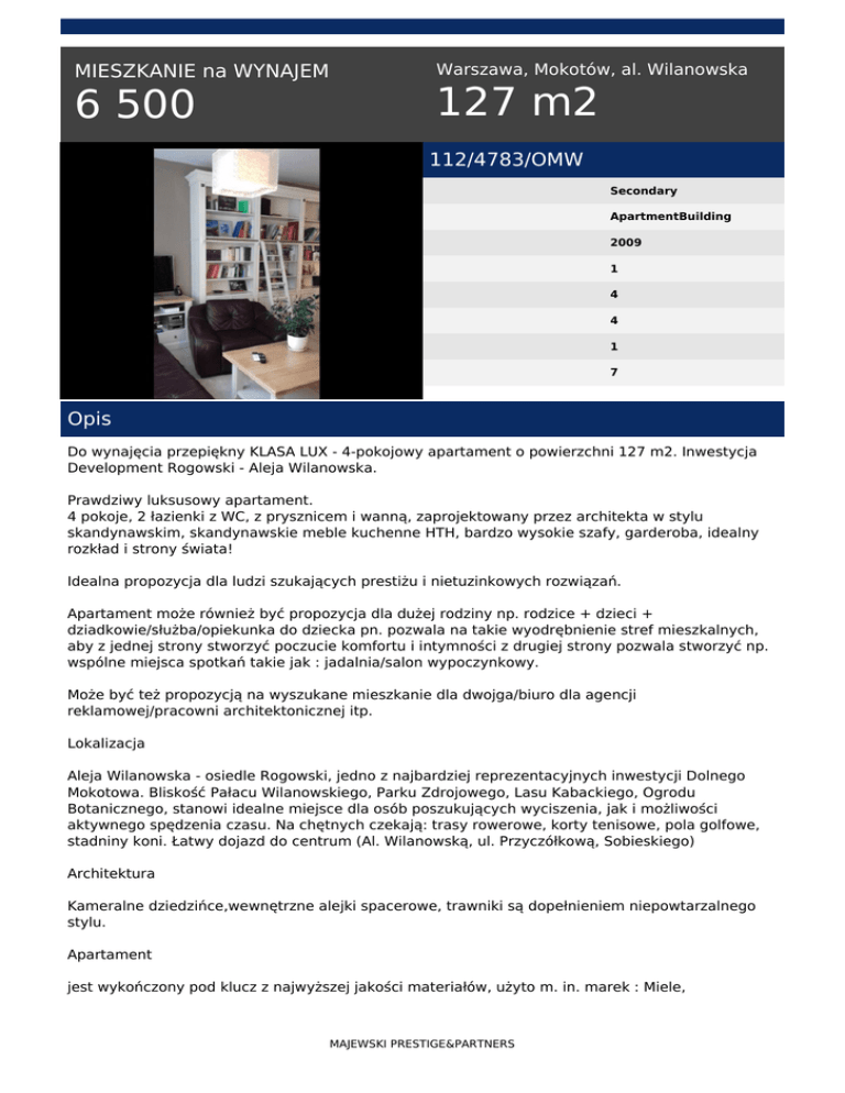 MIESZKANIE na WYNAJEM 6 500 Warszawa, Mokotów, al. Wilanowska 127 m2 112/4783/OMW Secondary ApartmentBuilding 2009 1 4 4 1 7 Opis Do wynajęcia przepiękny KLASA LUX - 4-pokojowy apartament o powierzchni 127 m2. Inwestycja Development Rogowski - Aleja Wilanowska. Prawdziwy luksusowy apartament. 4 pokoje, 2 łazienki z WC, z prysznicem i wanną, zaprojektowany przez architekta w stylu skandynawskim, skandynawskie meble kuchenne HTH, bardzo wysokie szafy, garderoba, idealny rozkład i strony świata! Idealna propozycja dla ludzi szukających prestiżu i nietuzinkowych rozwiązań. Apartament może również być propozycja dla dużej rodziny np. rodzice + dzieci + dziadkowie/służba/opiekunka do dziecka pn. pozwala na takie wyodrębnienie stref mieszkalnych, aby z jednej strony stworzyć poczucie komfortu i intymności z drugiej strony pozwala stworzyć np. wspólne miejsca spotkań takie jak : jadalnia/salon wypoczynkowy. Może być też propozycją na wyszukane mieszkanie dla dwojga/biuro dla agencji reklamowej/pracowni architektonicznej itp. Lokalizacja Aleja Wilanowska - osiedle Rogowski, jedno z najbardziej reprezentacyjnych inwestycji Dolnego Mokotowa. Bliskość Pałacu Wilanowskiego, Parku Zdrojowego, Lasu Kabackiego, Ogrodu Botanicznego, stanowi idealne miejsce dla osób poszukujących wyciszenia, jak i możliwości aktywnego spędzenia czasu. Na chętnych czekają: trasy rowerowe, korty tenisowe, pola golfowe, stadniny koni. Łatwy dojazd do centrum (Al. Wilanowską, ul. Przyczółkową, Sobieskiego) Architektura Kameralne dziedzińce,wewnętrzne alejki spacerowe, trawniki są dopełnieniem niepowtarzalnego stylu. Apartament jest wykończony pod klucz z najwyższej jakości materiałów, użyto m. in. marek : Miele, MAJEWSKI PRESTIGE&PARTNERS Vileroy&Boch, Axor Hans Grohe, Almi Decor. Bezpieczeństwo: System monitoringu, kamery, kontrola dostępu, recepcje na parterach. Parter z 4, strona świata połudn/zachód 1 garaż. Na parterze jest recepcja. W cenie dostępne miejsce garażowe oraz komórka lokatorska. Opłaty: - kwota najmu 6500 zł miesięcznie + czynsz administracyjny 1000zł, który obejmuje wszystkie opłaty: woda, ogrzewanie, energia elektryczna, internet. Możliwość najmu na krótkie okresy - uzgodnienia indywidualne... Wymagana kaucja - 8000 zl. Polecamy, Artur Majewski, tel. 792 929 235, e-mail: [email protected] Marlena Okonkowska, tel. 570 58 59 58, e-mail: [email protected] Artur Sebastian Majewski tel. 792929235 tel. 501585958 email: [email protected] MAJEWSKI PRESTIGE&PARTNERS Powered by TCPDF (www.tcpdf.org)