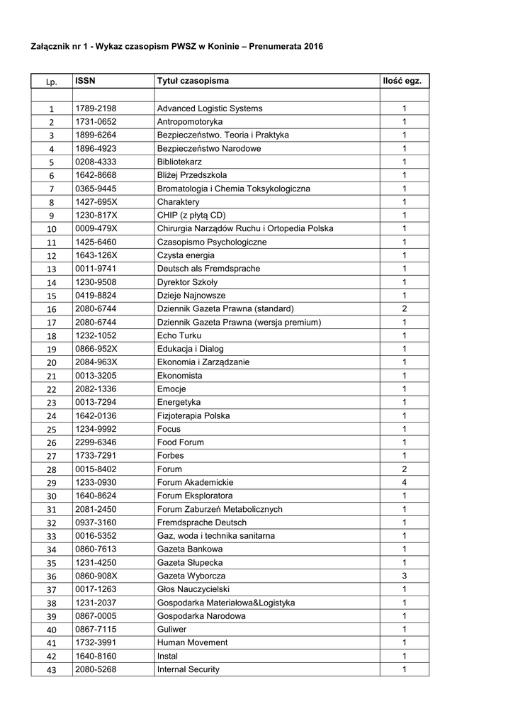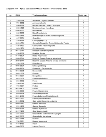 Załącznik nr 1 - Wykaz czasopism PWSZ w Koninie – Prenumerata 2016 Lp. ISSN Tytuł czasopisma Ilość egz. 1 2 3 4 5 6 7 8 9 10 11 12 13 14 15 16 17 18 19 20 21 22 23 24 25 26 27 28 29 30 31 32 33 34 35 36 37 38 39 40 41 42 43 1789-2198 Advanced Logistic Systems 1 1731-0652 Antropomotoryka 1 1899-6264 Bezpieczeństwo. Teoria i Praktyka 1 1896-4923 Bezpieczeństwo Narodowe 1 0208-4333 Bibliotekarz 1 1642-8668 Bliżej Przedszkola 1 0365-9445 Bromatologia i Chemia Toksykologiczna 1 1427-695X Charaktery 1 1230-817X CHIP (z płytą CD) 1 0009-479X Chirurgia Narządów Ruchu i Ortopedia Polska 1 1425-6460 Czasopismo Psychologiczne 1 1643-126X Czysta energia 1 0011-9741 Deutsch als Fremdsprache 1 1230-9508 Dyrektor Szkoły 1 0419-8824 Dzieje Najnowsze 1 2080-6744 Dziennik Gazeta Prawna (standard) 2 2080-6744 Dziennik Gazeta Prawna (wersja premium) 1 1232-1052 Echo Turku 1 0866-952X Edukacja i Dialog 1 2084-963X Ekonomia i Zarządzanie 1 0013-3205 Ekonomista 1 2082-1336 Emocje 1 0013-7294 Energetyka 1 1642-0136 Fizjoterapia Polska 1 1234-9992 Focus 1 2299-6346 Food Forum 1 1733-7291 Forbes 1 0015-8402 Forum 2 1233-0930 Forum Akademickie 4 1640-8624 Forum Eksploratora 1 2081-2450 Forum Zaburzeń Metabolicznych 1 0937-3160 Fremdsprache Deutsch 1 0016-5352 Gaz, woda i technika sanitarna 1 0860-7613 Gazeta Bankowa 1 1231-4250 Gazeta Słupecka 1 0860-908X Gazeta Wyborcza 3 0017-1263 Głos Nauczycielski 1 1231-2037 Gospodarka Materiałowa&Logistyka 1 0867-0005 Gospodarka Narodowa 1 0867-7115 Guliwer 1 1732-3991 Human Movement 1 1640-8160 Instal 1 2080-5268 Internal Security 1 44 45 46 47 48 49 50 51 52 53 54 55 56 57 58 59 60 61 62 63 64 65 66 67 68 69 70 71 72 73 74 75 76 77 78 79 80 81 82 83 84 85 86 87 88 89 90 91 92 1732-3428 International Journal of Logistic and Supply Chain Management Perspectives Inżynier Budownictwa 1 1934-2014 Inżynieria i Budownictwo 1 0208-6247 Inżynieria Materiałowa 1 2083-9588 IT Professional 1 1896-5849 Język niemiecki 1 2300-6471 Konteksty Pedagogiczne 1 0023-5172 Kultura i Społeczeństwo 1 0023-5938 Kwartalnik Pedagogiczny 1 1231-5478 Logistyka 1 1734-2015 Logistics and Transport 1 2083-6422 Logistyka Odzysku 1 1505-8336 Magazyn Instalatora 1 2081-8939 Magazyn Lekkoatletyczny 1 1425-831S Marketing w Praktyce 1 0137-2971 Materiały budowlane 1 0025-6552 Mechanik 1 1640-0143 Medicina Sportiva 1 0239-6866 Murator 1 1507-5966 National Geographic Polska 1 0239-7579 Nauczanie początkowe 1 2080-6000 Nauki o Zarządzaniu 1 2052-1081 Neewsweek (wersja ang.) 2 1642-5685 Neewsweek Polska 2 1642-1981 Niepełnosprawność i Rehabilitacja 1 1230-0624 Notes Wydawniczy 1 2084-1108 Nowe Horyzonty Edukacji 1 0137-8562 Nowe Książki 1 0029-537X Nowa Szkoła 1 1234-5684 Nowe Życie Gospodarcze 1 0137-3676 Ciepłownictwo, ogrzewnictwo, wentylacja 1 1230-0861 Opieka Wychowanie Terapia 1 1509-3492 Ortopedia Traumatologia Rehabilitacja 1 1640-7776 PC Format 1 1232-3004 PC Word z Dvd 1 1642-672X Pedagogika Społeczna 1 1427-3543 Perspektywy 1 0033-2674 Psychiatria Polska 1 1732-5382 Pływanie 1 2319-9032 1 978-83-89113-19-8 Polish Journal of Social Science 1 0032-3500 Polityka 3 1429-6675 Polityka Energetyczna 1 2300-1569 Polityka i Bezpieczeństwo 1 0137-4729 Polityka Społeczna 1 2353-6179 Polska Głos Wielkopolski 2 0032-4752 Poradnik Bibliotekarza 1 1230-2813 Postępy Psychiatrii i Neurologii 1 0860-6161 Postępy Rehabilitacji 1 0032-6186 Praca i Zabezpieczenie Społeczne 1 93 94 95 96 97 98 99 100 101 102 103 104 105 106 107 108 109 110 111 112 113 114 115 116 117 118 119 120 121 122 123 124 125 126 127 128 129 130 131 132 133 134 135 136 137 138 139 0860-3480 Praca Socjalna 1 2081-187X Praktyczna Fizjoterapia i Rehabilitacja 1 0137-8651 Problemy Jakości 1 0552-2188 Problemy Opiekuńczo - Wychowawcze 1 1640-1808 Problemy Polityki Społecznej 1 1644-9584 Problemy Zarządzania 1 0033-202X Przegląd Biblioteczny 1 0033-2038 Przegląd Budowlany 1 0033-2178 Przegląd Historyczno – Oświatowy 1 1506-8420 Przegląd Kolski 1 1232-9126 Przegląd Komunalny 1 0138-0893 Przegląd Koniński 6 0033-2259 Przegląd Mechaniczny 1 0137-7221 Przegląd Organizacji 1 0033-2356 Przegląd Socjologiczny 1 0860-7540 Przegląd Wielkopolski 1 0033-2674 Psychiatria Polska 1 1731-836X Psychologia w Szkole 1 0137-8783 Przegląd Techniczny 1 0481-5475 Rachunkowość 1 1427-9622 Rehabilitacja Medyczna 1 1895-4146 Rehabilitacja w Praktyce 1 2083-4942 Research In Logistics & Production 1 0208-9130 Rzeczpospolita 2 0208-9130 Rzeczpospolita Plus 1 0867-4973 Samorząd Terytorialny 1 0039-1239 Stern 1 0137-818X Szkoła Specjalna 1 2080-1467 Technologia wody 1 0928-8430 Time (wersja angielska) 1 1732-5153 Transport Miejski i Regionalny 1 1731-724X Wodociągi - Kanalizacja 1 0209-1747 Wprost 2 1506-3690 Wspólne Tematy 1 0860-8075 Wychowanie Fizyczne i Zdrowotne 1 0512-4255 Wychowanie Muzyczne w Szkole 1 1230-7785 Wychowanie na co Dzień 1 0137-8082 Wychowanie w Przedszkolu 1 Wydawca (miesięcznik) 1 0137-5474 Zagadnienia Eksploatacji Maszyn 1 0324-8194 Zagadnienia Informacji Naukowej 1 1734-3534 Zarządzanie Jakością 1 1643-4773 Zarządzanie Przedsiębiorstwem 1 1641-0874 Zarządzanie Zasobami Ludzkimi 1 0137-7310 Życie Szkoły 1 0514-0994 Zwierciadło 1 1425-6959 Żywność - Nauka Technologia Jakość 1