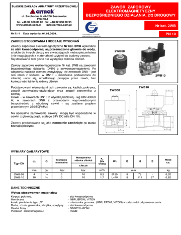 L SKIE ZAKŁADY ARMATURY PRZEMYSŁOWEJ ZAWÓR ZAPOROWY ELEKTROMAGNETYCZNY BEZPO REDNIEGO DZIAŁANIA, 2/2 DROGOWY ul. Swobodna 9, 41-200 Sosnowiec POLSKA tel. +48 32 368 00 00 fax. +48 32 368 00 95 www.armak.com.pl [email protected] Nr II/14 Nr kat. 2WB Data wydania: 04.08.2009. PN 10 CERTYFIKAT SYSTEMU ZARZ DZANIA JAKO CI ZAKRES STOSOWANIA I RODZAJE WYKONA Zawory zaporowe elektromagnetyczne Nr kat. 2WB wykonane ze stali kwasoodpornej s przeznaczone głównie do wody, a tak e do innych cieczy nie stwarzaj cych niebezpiecze stwa i nie reaguj cych z materiałami u ytymi do budowy zaworu. S stosowane tam gdzie nie wyst puje ró nica ci nie . 2WB08 Zawory zaporowe elektromagnetyczne Nr kat. 2WB s zaworami bezpo redniego działania (DN10 z serwowspomaganiem). Po wł czeniu napi cia element zamykaj cy (w zaworach DN8 – jest nim rdze z korkiem; w DN10 – membrana podwieszona do rdzenia) unosi si , umo liwiaj c przepływ przez zawór, bez konieczno ci istnienia ró nicy ci nie . 2WB10 Podstawowymi elementami tych zaworów s : kadłub, pokrywa, zespół zamykaj co-otwieraj cy oraz zespół sterownika z cewk . Cewki – w zaworach DN10 z wtyczk kablow - wg DIN 43650 A; w zaworach DN8 z przewodami wyprowadzonymi bezpo rednio z obudowy cewki - s zasilane pr dem przemiennym 230/50[V/Hz]. 2WB10 2WB08 Na specjalne zamówienie zawory mog by wyposa one w cewki z głowic pr du stałego 24V DC (dla DN 10). Zawory produkowane s jako normalnie zamkni te (w stanie beznapi ciowym). WYMIARY GABARYTOWE Typ -DN 2WB-08 2WB-10 do G Ci nienie minimalne Maksymalna ró nica ci nie ciecze Kv [dla wody] Ø/L B Ø 35 L=70 8 8 3 mm cal bar bar m /h 4 10 ¼ 0 0 10 10 0,3 1,7 H S 79 111 27 mm Wykaz stosowanych materiałów yny: ca. kg DANE TECHNICZNE Korpus, pokrywa, Membrana korek, pier cienie typu „O” Rurka, rdze , głowiczka, wkr tka, spr Cewka firmy : Pier cie elektromagnesu: Masa - stal kwasoodporna - NBR, EPDM, VITON - mieszanka gumowa (NBR, EPDM, VITON) w zale no ci od przeznaczenia - stal kwasoodporna - NAGOYO JAPAN - mied 0,32 0,82 Charakterystyka techniczna Zakres ci nie : 0 ÷ 10 bar 2 Maksymalna lepko : 20mm /s [cSt] o o o o Temperatura medium: od -10 C do +90 C (NBR), od -10 C do +140 C (EPDM, VITON) Tolerancja napi cia: zmiennego ± 5%, stałego ± 5%, Temperatura otoczenia: max. + 50ºC Materiałobudowy cewki: ywica epoksydowa Wszystkie cewki s przeznaczone do pracy ci głej. Napi cie Typ Wielko AC 230V DC 24V AC 230V DC 24V Klasa izolacji termicznej o F C 155 DN Stopie ochrony 08 Moc podtrzymania IP65 10 Pozorna Czynna Pozorna Czynna 20VA 12W 26VA 17W - - - 23W Typ cewki YNJ12 NJ17 - NJ23 UWAGI − − − − zawory nie s przeznaczone dla czynników wybuchowych i nie mog pracowa w atmosferze wybuchowej, zawory nie s przeznaczone dla czynników łatwozapalnych i zapalnych (gdy dopuszczalna temperatura robocza jest wy sza od temperatury zapłonu), oraz czynników toksycznych i utleniaj cych, zawory musz by montowane na instalacjach poziomych – cewk do góry 2 w przypadku czynników zanieczyszczonych, przed zaworem nale y stosowa filtr siatkowy o co najmniej 40 oczkach/cm wszystkie podane ci nienia nale y rozumie jako nadci nienie. SPOSÓB ZAMAWIANIA W zamówieniu nale y poda : numer katalogowy, typ - DN, wymiar przył cza „G”, ci nienie robocze i temperatur czynnika. Na specjalne zamówienie zawory mog by wykonane z przył czem kołnierzowym. Producent zastrzega sobie prawo wprowadzania zmian technicznych. Zmiany te nie mog by podstaw do ewentualnych reklamacji