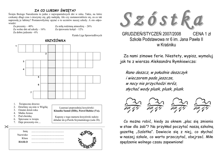 ZA CO LUBIMY ŚWIĘTA? Święta Bożego Narodzenia to jedne z najwspanialszych dni w roku. Takie, na które czekamy długi czas i cieszymy się, gdy nadejdą. Ale czy zastanawialiście się, za co tak naprawdę je lubimy? Postanowiłyśmy spytać o to uczniów naszej szkoły. A oto odpowiedzi: Za prezenty – 40% Za miłą rodzinną atmosferę – 26% Za wolne dni od szkoły – 16% Za śpiewanie kolęd – 12% Za dobre jedzenie - 6% Pytała Liga Sprawiedliwych KRZYŻÓWKA 1 Szóstka GRUDZIEŃ/STYCZEŃ 2007/2008 CENA 1 zł Szkoła Podstawowa nr 6 im. Jana Pawła II w Kraśniku Za nami zimowe ferie. Niestety, wypisz, wymaluj jak te z wiersza Aleksandra Rymkiewicza: 2 3 4 Rano deszcz, w południe deszczyk i wieczorem pada jeszcze, w nocy nie przychodzi mróz, słychać wody plusk, plusk, plusk. 5 6 7 1. 2. 3. 4. 5. 6. 7. Świąteczne drzewo Dzielimy się nim w Wigilię Ostatni dzień roku Matka Jezusa Pod choinką Śpiewane w święta Daje przezenty-św.... Laureaci poprzedniej krzyżówki: Klaudia Samol (IIIb), Paweł Babisz (Va). Kupony z tego numeru krzyżówki należy składać do p.Pawła Szymańskiego (sala 28). Imię Nazwisko Klasa HASŁO ................................................. ................................................. ................................................. ................................................. Co można robić, kiedy za oknem „plac się zmienia w staw dla żab”? Na przykład poczytać naszą szkolną gazetkę „Szóstka”. Dowiecie się z niej, co słychać w naszej szkole, co warto przeczytać, obejrzeć. Miłe spędzenie wolnego czasu zapewnione! ABY WSZYSTKIE DZIECI SIĘ MOGŁY UŚMIECHNĄĆ... TEGO WARTO POSŁUCHAĆ Dnia 12 grudnia odbyła się coroczna akcja ,,Uśmiech Dziecka”. Wzięły w niej udział dwie klasy: Vc i VIb oraz kilkoro uczniów z VIa, którzy zostali podzieleni na dwie grupy. Opiekunami pierwszej grupy były p. Barbara Szymańska oraz p. Danuta Niezgoda, natomiast drugiej p. Monika Kuśmierz oraz p. Paweł Szymański. Wszystkie uczniowskie pary otrzymały puszki, identyfikatory oraz cukierki, którymi mieliśmy częstować ludzi. Ze szkoły wyruszyliśmy w swoich przebraniach o godzinie 10:00, kierując się w stronę ,,Groszka”. Następnie udaliśmy się pod liceum i o 12:30 wróciliśmy do szkoły na obiad. Po godzinnym odpoczynku wymaszerowaliśmy pod fabrykę. Przybyliśmy tam około 14:00, więc mieliśmy dużo czasu na zbieranie datków w obrębie FŁT. O godzinie 15:30, zmęczeni i trochę zmarznięci powróciliśmy do szkoły. Na drugi dzień pojawiły się wynik zbiórki. Zebraliśmy w sumie ponad trzy tysiące złotych! Pojawiła się również lista 10 ,,najbogatszych puszek”. Pierwsze miejsce zajęły Katarzyna Dąbrowska i Agata Szymańska z klasy Vc, które zebrały 316,80zł. Za zebrane pieniądze zakupione zostały dla Domu Dziecka najnowocześniejsze odkurzacze piorące. Agata z Vc Oto mój zestaw najciekawszych ostatnio piosenek, których warto posłuchać. A wiec słuchawki na uszy i jazda! „Crazy loop” – Crazy Loop „People of the night” – Favretto „Tam gdzie nie ma dróg” – Ewa Farna „All black” – Good Charlotte „Lucky” – Lucky Twice „Apologize” – Timbaland „Round and Round” – Defrikz ,,Sound of disco” – Moreno ,,Sleeping with ghosts” – Placebo ,,Let me think about it” – Ida Corr ,,Le disko” – Shiny Toy Guns ,,Bring the noise” – Benny Benassi Edyta z IV B ;) SEKCJE SAMORZĄDU UCZNIOWSKIEGO Sekcje i ich opiekunowie Pani Barbara Szymańska – sekcja rozrywkowa Pani Monika Kuśmierz – sekcja językowa Pan Wojciech Stopa – sekcja sportowa Pani Joanna Cybulak, Pan Paweł Szymański – sekcja medialna Pani Iwona Tomala – sekcja informatyczna Pani Monika Żuber- sekcja plastyczna Pani Danuta Niezgoda – opiekun samorządu uczniowskiego Liga Sprawiedliwych Kolegium redakcyjne: Kilka fajnych osób z klas IVb, VIa, VIb, Va, Vb i Vc Pan Paweł Szymański (opieka literacka) Pani Joanna Cybulak (opieka graficzno–techniczna) WARTO PRZECZYTAĆ! Nowa książka o przygodach Mikołajka i jego szkolnych kolegów to bez wątpienia najważniejsze wydarzenie na rynku książki dziecięcej w ubiegłym roku. Tom zawiera osiemdziesiąt niepublikowanych dotąd historyjek ilustrowanych zabawną i niezapomnianą kreską Sempégo. Ta książka zaprasza nas na spotkanie z Mikołajkiem, Rufusem, Alcestem i ich kolegami, których perypetie rozśmieszają kolejne już pokolenie czytelników. Mikołajek jest książką zarówno dla dorosłych, jak i dla dzieci. Ciekawe, śmieszne i krótkie rozdziały potrafią rozbawić do łez. Polecam gorąco!!!! Kasia H. SNOWBOARD NASZ ULUBIONY Są różne sporty zimowe, ale nie wszyscy lubią te same dyscypliny. Zrobiliśmy wiec sondę wśród naszych uczniów – jaka dyscyplina jest najpopularniejsza? Wygrała ta, która wymaga najwęcej odwagi – snowboard, czyli jazda po śniegu na jednej desce. Wynika z tego, że lubicie sporty ekstremalne. Najważniejsze jednak, żeby nie siedzieć całymi dniami w domu przed komputerem albo telewizorem, ale zażywać ruchu na świeżym powietrzu. Wyniki sondy: Snowboard- wybrało 69osób Łyżwiarstwo- 25osób Narciarstwo- 10osób Saneczkarstwo- 10osób Mateusz O. Skorpion Drogie Skorpionki, dla Was ten rok będzie po prostu magiczny! Inni ludzie nareszcie zauważą, jak bardzo jesteście wyjątkowi i przestaną zawracać Wam głowę niepotrzebnymi sprawami. Wreszcie będziecie mogły zgłębiać wszystkie tajemnice, które do tej pory tak Was fascynowały. Wasze odkrycia będą tak niesamowite, że aż trudno będzie w nie uwierzyć! Innymi słowy, czeka Was prawdziwy sukces! Strzelec Przed Wami rok pełen nieustającej zabawy i przyjemności! Przyjaciele, radość i śmiech będą Wam towarzyszyć na każdym kroku - a wszystko, co wymyślicie, przyciągnie do Was jeszcze więcej uciech i ciekawych ludzi! Szykuje się Wam dwanaście miesięcy przygód, fascynujących po