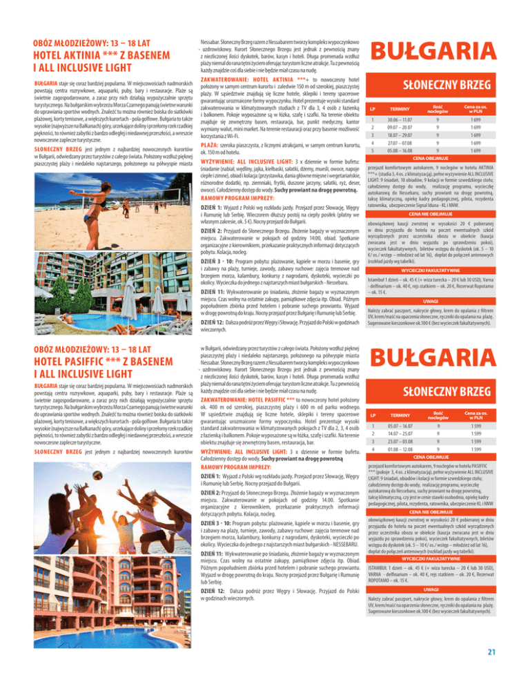 OBÓZ MŁODZIEŻOWY: 13 – 18 LAT HOTEL AKTINIA *** Z BASENEM I ALL INCLUSIVE LIGHT BUŁGARIA staje się coraz bardziej popularna. W miejscowościach nadmorskich powstają centra rozrywkowe, aquaparki, puby, bary i restauracje. Plaże są świetnie zagospodarowane, a zaraz przy nich działają wypożyczalnie sprzętu turystycznego. Na bułgarskim wybrzeżu Morza Czarnego panują świetne warunki do uprawiania sportów wodnych. Znaleźć tu można również boiska do siatkówki plażowej, korty tenisowe, a większych kurortach - pola golfowe. Bułgaria to także wysokie (najwyższe na Bałkanach) góry, urzekające doliny i przełomy rzek rzadkiej piękności, to również zabytki z bardzo odległej i niedawnej przeszłości, a wreszcie nowoczesne zaplecze turystyczne. SŁONECZNY BRZEG jest jednym z najbardziej nowoczesnych kurortów w Bułgarii, odwiedzany przez turystów z całego świata. Położony wzdłuż pięknej piaszczystej plaży i niedaleko najstarszego, położonego na półwyspie miasta OBÓZ MŁODZIEŻOWY: 13 – 18 LAT HOTEL PASIFFIC *** Z BASENEM I ALL INCLUSIVE LIGHT BUŁGARIA staje się coraz bardziej popularna. W miejscowościach nadmorskich powstają centra rozrywkowe, aquaparki, puby, bary i restauracje. Plaże są świetnie zagospodarowane, a zaraz przy nich działają wypożyczalnie sprzętu turystycznego. Na bułgarskim wybrzeżu Morza Czarnego panują świetne warunki do uprawiania sportów wodnych. Znaleźć tu można również boiska do siatkówki plażowej, korty tenisowe, a większych kurortach - pola golfowe. Bułgaria to także wysokie (najwyższe na Bałkanach) góry, urzekające doliny i przełomy rzek rzadkiej piękności, to również zabytki z bardzo odległej i niedawnej przeszłości, a wreszcie nowoczesne zaplecze turystyczne. SŁONECZNY BRZEG jest jednym z najbardziej nowoczesnych kurortów Nessabar. Słoneczny Brzeg razem z Nessabarem tworzy kompleks wypoczynkowo - uzdrowiskowy. Kurort Słonecznego Brzegu jest jednak z pewnością znany z niezliczonej ilości dyskotek, barów, kasyn i hoteli. Długa promenada wzdłuż plaży niemal do rana tętni życiem oferując turystom liczne atrakcje. Tu z pewnością każdy znajdzie coś dla siebie i nie będzie miał czasu na nudę. ZAKWATEROWANIE: HOTEL AKTINIA ***+ to nowoczesny hotel położony w samym centrum kurortu i zaledwie 150 m od szerokiej, piaszczystej plaży. W sąsiedztwie znajdują się liczne hotele, sklepiki i tereny spacerowe gwarantując urozmaicone formy wypoczynku. Hotel prezentuje wysoki standard zakwaterowania w klimatyzowanych studiach z TV dla 3, 4 osób z łazienką i balkonem. Pokoje wyposażone są w łóżka, szafę i szafki. Na terenie obiektu znajduje się zewnętrzny basen, restauracja, bar, punkt medyczny, kantor wymiany walut, mini market. Na terenie restauracji oraz przy basenie możliwość korzystania z Wi-Fi. PLAŻA: szeroka piaszczysta, z licznymi atrakcjami, w samym centrum kurortu, ok. 150 m od hotelu. WYŻYWIENIE: ALL INCLUSIVE LIGHT: 3 x dziennie w formie bufetu: śniadanie (nabiał, wędliny, jajka, kiełbaski, sałatki, dżemy, muesli, owoce, napoje ciepłe i zimne), obiad i kolacja (przystawka, dania główne mięsne i wegetariańskie, różnorodne dodatki, np. ziemniaki, frytki, duszone jarzyny, sałatki, ryż, deser, owoce). Całodzienny dostęp do wody. Suchy prowiant na drogę powrotną. RAMOWY PROGRAM IMPREZY: DZIEŃ 1: Wyjazd z Polski wg rozkładu jazdy. Przejazd przez Słowację, Węgry i Rumunię lub Serbię. Wieczorem dłuższy postój na ciepły posiłek (płatny we własnym zakresie, ok. 5 €). Nocny przejazd do Bułgarii. DZIEŃ 2: Przyjazd do Słonecznego Brzegu. Złożenie bagaży w wyznaczonym miejscu. Zakwaterowanie w pokojach od godziny 14:00, obiad. Spotkanie organizacyjne z kierownikiem, przekazanie praktycznych informacji dotyczących pobytu. Kolacja, nocleg. DZIEŃ 3 - 10: Program pobytu: plażowanie, kąpiele w morzu i basenie, gry i zabawy na plaży, turnieje, zawody, zabawy ruchowe: zajęcia terenowe nad brzegiem morza, kalambury, konkursy z nagrodami, dyskoteki, wycieczki po okolicy. Wycieczka do jednego z najstarszych miast bułgarskich - Nessebaru. DZIEŃ 11: Wykwaterowanie po śniadaniu, złożenie bagaży w wyznaczonym miejscu. Czas wolny na ostatnie zakupy, pamiątkowe zdjęcia itp. Obiad. Późnym popołudniem zbiórka przed hotelem i pobranie suchego prowiantu. Wyjazd w drogę powrotną do kraju. Nocny przejazd przez Bułgarię i Rumunię lub Serbię. DZIEŃ 12: Dalsza podróż przez Węgry i Słowację. Przyjazd do Polski w godzinach wieczornych. w Bułgarii, odwiedzany przez turystów z całego świata. Położony wzdłuż pięknej piaszczystej plaży i niedaleko najstarszego, położonego na półwyspie miasta Nessabar. Słoneczny Brzeg razem z Nessabarem tworzy kompleks wypoczynkowo - uzdrowiskowy. Kurort Słonecznego Brzegu jest jednak z pewnością znany z niezliczonej ilości dyskotek, barów, kasyn i hoteli. Długa promenada wzdłuż plaży niemal do rana tętni życiem oferując turystom liczne atrakcje. Tu z pewnością każdy znajdzie coś dla siebie i nie będzie miał czasu na nudę. ZAKWATEROWANIE: HOTEL PASIFFIC *** to nowoczesny hotel położony ok. 400 m od szerokiej, piaszczystej plaży i 600 m od parku wodnego. W sąsiedztwie znajdują się liczne hotele, sklepiki i tereny spacerowe gwarantując urozmaicone formy wypoczynku. Hotel prezentuje wysoki standard zakwaterowania w klimatyzowanych pokojach z TV dla 2, 3, 4 osób z łazienką i balkonem. Pokoje wyposażone są w łóżka, szafę i szafki. Na terenie obiektu znajduje się zewnętrzny basen, restauracja, bar. WYŻYWIENIE: ALL INCLUSIVE LIGHT: 3 x dziennie w formie bufetu. Całodzienny dostęp do wody. Suchy prowiant na drogę powrotną RAMOWY PROGRAM IMPREZY: DZIEŃ 1: Wyjazd z Polski wg rozkładu jazdy. Przejazd przez Słowację, Węgry i Rumunię lub Serbię. Nocny przejazd do Bułgarii. DZIEŃ 2: Przyjazd do Słonecznego Brzegu. Złożenie bagaży w wy