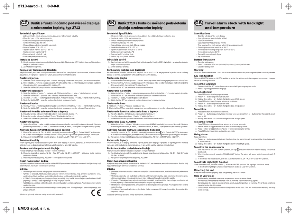 2713-navod - 1 0-0-0-K CZ Budík s funkcí nočního podsvícení displeje a zobrazením teploty, typ 2713 SK Budík 2713 s funkciou nočného podsvietenia displeja a zobrazením teploty GB Travel alarm clock with backlight and temperature Technická specifikace Technická špecifikácia Specifications Instalace baterií Inštalácia batérií Battery instalation Funkce key lock (zámek tlačítek) Funkcia key lock (zámok tlačidiel) Warning Nastavení jazyka Nastavenie jazyka - Zobrazení hodin, minut, sekund, měsíce, data, dne v týdnu, teploty a budíku Přepínání mezi 12/24 hod. zobrazením Funkce nočního podsvícení displeje (bílé) Kmitočet krystalu: 32 768 kHz Přesnost času: průměrně okolo 60 s za měsíc Provozní teplota: 0 °C – 50 °C Teplotní rozsah měření: -9,9 °C – 50 °C Rozlišení měření teploty: 0,1 °C Životnost baterií: přibližně 1 rok Funkce Key lock (zámek tlačítek) 1. Otevřte prostor pro baterie ve spodní části přístroje a vložte 3 baterie AAA 1,5 V (tužka) – jsou součást dodávky. Dbejte na správnou polaritu. 2. Zavřete bateriový prostor. Přepínač UNLOCK/KEY LOCK slouží pro zablokování všech tlačítek. Je-li přepínač v pozici UNLOCK, všechna tlačítka jsou aktivní. Je-li přepínač v pozici KEY LOCK, jsou všechna tlačítka blokována. 1. Stiskněte a držte tlačítko SET po dobu 2 sekund. Na displeji začne blikat volba jazyka pro zkratku dne v týdnu. 2. Pomocí tlačítka „-“ vyberte požadovaný jazyk. Při volbě jazyka máte na výběr následující možnosti: angličtina (EN), němčina (DE), francouzština (FR), italština (IT). 3. Stiskněte tlačítko SET pro potvrzení a nastavení kalendáře. Nastavení kalendáře 1. 2. 3. 4. Stiskněte tlačítko „+“ nebo „-“ – nastavíte rok. Přidržením tlačítka „+“ nebo „-“ měníte hodnoty rychleji. Stiskněte tlačítko SET – potvrdíte rok a následný přejdete k nastavení data. Tlačítkem „+“ nebo „-“ nastavte požadované datum. Přidržením tlačítka „+“ nebo „-“ měníte hodnoty rychleji. Stiskněte tlačítko SET – potvrdíte nastavení a přejdete k nastavení hodin. - Zobrazenie hodín, minút, sekúnd, mesiaca, dátum, dňa v týždni, teploty a budiaceho času Prepínanie medzi 12/24 hod. zobrazením Funkcia nočného podsvietenia displeja (bielo) Kmitočet kryštálu: 32 768 kHz Presnosť času: priemerne okolo 60 s za mesiac Prevádzková teplota od 0 °C – 50 °C Teplotný rozsah meraní od -9,9 °C až 50 °C Rozlíšenie meraní teploty 0,1 °C Životnosť batérií: približne 1 rok Funkcia Key lock (zámok tlačítok) 1. Otvorte priestor pre batérie v spodnej časti prístroja a vložte 3 batérie AAA 1,5 V (tužka) – sú súčasťou dodávky. Dbajte na správnu polaritu. 2. Zavrite batériový priestor. Pre zablokovanie všetkých tlačidiel slúži prepínač UNLOCK/KEY LOCK. Ak je prepínač v pozícií UNLOCK všetky tlačítka sú aktívne. V prípade KEY LOCK sú blokované všetky tlačítka. 1. Stlačte a držte tlačítko SET po dobu 2 sekúnd. Na displeji začne blikať voľba jazyka pre skratku dňa v týždni. 2. Pomocou tlačítka „-“ vyberte požadovaný jazyk. Pri voľbe jazyka máte na výber nasledujúce možnosti: angličtina (EN), nemčina (DE), francúzština (FR), taliančina (IT). 3. Stlačte tlačítko SET pre potvrdenie a nastavenie kalendára. Nastavenie kalendára 1. 2. 3. 4. Stlačením tlačítka „+“ alebo „-“ vykonáte nastavenie roku. Pridržaním tlačítok „+“ „-“ meníte hodnoty rýchlejšie. Stlačte tlačítko SET pre potvrdenie a následný prechod k nastaveniu dátumu. Tlačítkom „+“ alebo „-“ nastavte požadovaný dátum. Stlačte tlačítko SET pre potvrdenie nastavenia a prechod k nastaveniu času. Nastavení hodin Nastavenie času Nastavení formátu zobrazení času a teploty Nastavenie formátu zobrazenia času a teploty Nastavení budíku Nastavenie času ALARMU Aktivace funkce SNOOZE (opakované buzení) Aktivácia funkcie SNOOZE (opakované budenie) 1. Tlačítky „+“ nebo „-“ nastavte požadovaný údaj hodin. Přidržením tlačítka „+“ nebo „-“ měníte hodnoty rychleji. 2. Stiskněte tlačítko SET – potvrdíte nastavení a přejdete k nastavení formátu zobrazení času a teploty. 1. Pro volbu formátu zobrazení hodin (12 nebo 24 hod.) stiskněte tlačítko „+“. 2. Pro volbu formátu zobrazení teploty (°C nebo °F) stiskněte tlačítko „-“. 3. Stisknutím tlačítka SET potvrdíte a současně ukončíte nastavení budíku. 1. Stisknutím tlačítka „+“ nebo „-“ dojde k zobrazení nastavení budíku; na displeji je zobrazen ikonou AL. Nastavte požadovaný čas tlačítky „+“ nebo „-“. Přidržením tlačítka „+“ nebo „-“ zvyšujete a snižujete hodnoty rychleji. 1. Přepínač je v poloze „NL ON + ALM ON“, na displeji je zobrazena ikona a Zz. Funkce SNOOZE je aktivována. 2. Po zaznění budícího signálu stiskněte tlačítko SNOOZE/LIGHT. Signál bude opět aktivován po 5 minutách. 3. Pro vypnutí funkce SNOOZE posuňte přepínač do polohy „NL ON + ALM OFF“ nebo „ALL OFF“. 1. Tlačítkami „+“ alebo „-“ nastavte požadovaný čas. 2. Stlačte tlačítko SET pre potvrdenie nastavenie a prechod k nastaveniu formátu zobrazenia času a teploty. 1. Pre voľbu 12 alebo 24 hodinového režimu stlačte tlačítko „+“. 2. Pre voľbu zobrazenia teploty v °C alebo °F stlačte tlačítko „-“. 3. Stlačením tlačítka SET potvrdíte nastavenie a ukončíte nastavenie budíka. 1. Stlačením tlačítka „+“ alebo „-“ dôjde k zobrazeniu času ALARMU, na displeji je zobrazený ikonou AL. Nastavte požadovaný čas tlačítkami „+“ alebo „-“. Pridŕžanie tlačítka „+“ alebo „-“ zvyšujete a znižujete hodnoty rýchlejšie. 1. Prepínač je v polohe „NL ON + ALM ON“, na displeji je zobr