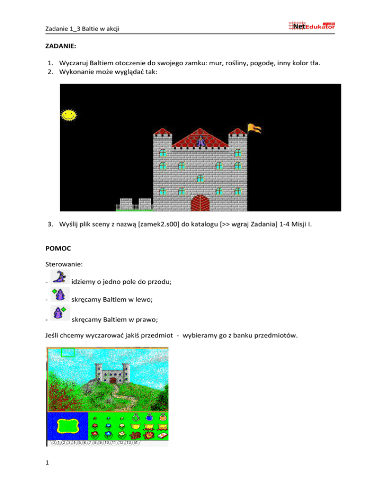 Zadanie 1_3 Baltie w akcji ZADANIE: 1. Wyczaruj Baltiem otoczenie do swojego zamku: mur, rośliny, pogodę, inny kolor tła. 2. Wykonanie może wyglądać tak: 3. Wyślij plik sceny z nazwą [zamek2.s00] do katalogu [>> wgraj Zadania] 1-4 Misji I. POMOC Sterowanie: - idziemy o jedno pole do przodu; - skręcamy Baltiem w lewo; - skręcamy Baltiem w prawo; Jeśli chcemy wyczarować jakiś przedmiot - wybieramy go z banku przedmiotów. 1 Zadanie 1_3 Baltie w akcji Aby ponownie wyczarować przedmiot można kliknąć na jego obrazek, który pojawił się jako ostatnio wybrany obok ikonki banku przedmiotów. 2