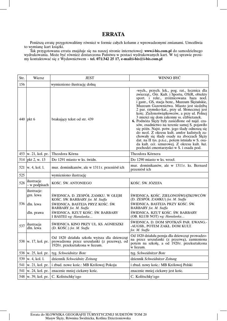 ERRATA Poniższą erratę przygotowaliśmy również w formie całych kolumn z wprowadzonymi zmianami. Umożliwia to wymianę kart książki. Tak przygotowana errata znajduje się na naszej stronie internetowej: www.i-bis.com.pl do samodzielnego wydrukowania. Może być również dostarczona Państwu w postaci wydrukowanych kart. W tej sprawie prosimy kontaktować się z Wydawnictwem – tel. 071/342 25 17, e-mail:[email protected] Str. Wiersz 156 JEST WINNO BYĆ wymieniono ilustrację dolną 440 pkt 6 brakujący tekst od str. 439 -wych., przych. lek., pog. rat., lecznica dla zwierząt., Ośr. Kult. i Sportu, OSiR, obiekty sport. i rekr., zróżnicowana baza nocl. i gastr., GS, stacja benz., Muzeum Ślężańskie, Muzeum Gazownictwa. Miasto jest siedzibą 2 par. rzymsko-kat., przy ul. Słonecznej jest kośc. Zielonoświątkowców, a przy ul. Polnej 3 mieści się dom zakonny ss. elżbietanek. 6. Podnóża Ślęży były zasiedlone od najd. czasów, osadnictwo na terenie samej S. pojawiło się późn. Najst. potw. jego ślady odnoszą się do neol. Z okresu kult. amfor kulistych zachowały się ślady osady na zboczach Ślęży dat. na II tys. p.n.e., potem istniała w S. osada kult. cer. sznurowej. Z okresu kult. łuż. pochodzi cmentarzysko w S. i osada pod. 453 w. 21, kol. pr. Theodora Körna Theodora Körnera 514 pkt 2, w. 13 Do 1291 miasto w ks. świdn. Do 1290 miasto w ks. wrocł. 521 w. 4, kol. l. mur. dominikanów, ale w 1311 r. przeniósł ich mur. dominikanów, ale w 1311 r. ks. Bernard przeniósł ich 525 wymieniono ilustrację 528 ilustracje KOŚC. ŚW. ANTONIEGO – w podpisach ilustracje: grn. lewa 536 dln. lewa dln. prawa 537 ilustracja dln. lewa KOŚC. ŚW. JÓZEFA ŚWIDNICA. D. ZESPÓŁ ZAMKU. W GŁĘBI KOŚC. SW. BARBARY fot. M. Staffa ŚWIDNICA. BASTEJA PRYZ KOŚC. ŚW. BARBARY fot. M. Staffa ŚWIDNICA. RZUT KOŚC. ŚW. BARBARY I BASTEI wg: Hanulanka… ŚWIDNICA. KOŚC. ZIELONOŚWIĄTKOWCÓW (D. ZESPÓŁ ZAMKU) fot. M. Staffa ŚWIDNICA. BASTEJA PRZY KOŚC. ŚW. BARBARY fot. M. Staffa ŚWIDNICA. RZUT KOŚC. ŚW. BARBARY (OB. KLUB NOT) wg: Hanulanka… ŚWIDNICA. KINO PRZY UL. KS. AGNIESZKI (D. KOŚC.) fot. M. Staffa ŚWIDNICA. D. DOM SPOTKAŃ PAR. EWANG.-AUGSB., POTEM ZAKŁ. DOM KULT. fot. M. Staffa Od 1820 działała pensja dla dziewcząt prowadzoOd 1820 działała szkoła wyższa dla dziewcząt na przez urszulanki (z przerwą), zamieniona 538 w. 17, kol. pr. prowadzona przez urszulanki (z przerwą), od potem na szkołę, a od 1920 r. przekształcona 1920 r. przekształcona w liceum. w liceum. 538 w. 25, kol. pr. tyg. Schweidnitze Bote tyg. Schweidnitzer Bote 539 w. 4, kol. l. dziennik Schweidnitzer Zeitung dziennik Schweidnitz Zeitung 541 w. 21, kol. pr. i zbud. nowe kośc.: MB Królowej Pokoju i zbud. nowy kośc.: MB Królowej Polski 541 w. 24, kol. pr. znacznie mniej ciekawy kośc. znacznie mniej ciekawy jest kośc. 548 w. 39, kol. pr. C. Kolistschky’ego C. Kolitschky’ego Errata do SŁOWNIKA GEOGRAFII TURYSTYCZNEJ SUDETÓW TOM 20 Masyw Ślęży, Równina Świdnicka, Kotlina Dzierżoniowska 550 w. 9, kol. pr. kośc. św. Antoniego kośc. NMP Niepok. Pocz. 550 w. 18, kol. pr. przejął go Kośc. Polsko-Kat. przejął go Kośc. Polsko-Kat., nadając wezw. św. Antoniego. 551 w. 3, kol. l. dom kult. z salą widowiskowo-kinową. dom kult. z salą widowiskowo-kinową i dom spotkań par. ewang.-augsb. 551 w. 22, kol. l. fragm. muru przy ul. Zamkowej (koło bastei). fragm. muru u zbiegu ul. Muzealnej i Basztowej (koło bastei). 552 w. 24, kol. pr. zespół koszarowy z XIX/XX w. ilustracja grn. lewa zespół pokoszarowy z XIX/XX w. ŚWIDNICA. WIEZA WIDOKOWA W PARKU MŁODZIEŻOWYM fot. M. Staffa ŚWIDNICA. FONTANNA U STÓP WIEŻY WIDOKOWEJ fot. M. Staffa ŚWIDNICA. ALTANA W PARKU MŁODZIEŻOWYM fot. M. Staffa ŚWIDNICA. FONTANNA U STÓP ALTANY fot. M. Staffa 553 w. 27, kol. l. – bud. adm. przy Al. Niepodległości 11/13 – bud. przy Al. Niepodległości 11/13 554 w. 9, kol. l. – LO przy ul. Budowlanej 7 – Zespół Szkół Zawodowych przy ul. Budo wlanej 7 553 grn. prawa 554 w. 22, kol. pr. – zespół 10 obiektów zakł. ELMOT – zespół obiektów zakł. ELMOT ilustracja 559 dln. lewa ŚWIDNICA. NAROŻNIK UL. TRAUGUTTA I WAŁBRZYSKIEJ fot. M. Staffa ŚWIDNICA. NAROŻNIK UL. LELEWELA I WAŁBRZYSKIEJ fot. M. Staffa ŚWIDNICA. APTEKA „POD WOŁAMI” PRZY PL. WOLNOŚCI fot. M. Staffa ŚWIDNICA. APTEKA „POD BYKAMI” PRZY PL. WOLNOŚCI fot. M. Staffa 562 ilustracja grn. prawa Errata do SŁOWNIKA GEOGRAFII TURYSTYCZNEJ SUDETÓW TOM 20 Masyw Ślęży, Równina Świdnicka, Kotlina Dzierżoniowska Dzierżoniów 155 DZIERŻONIÓW. WIDOK MIASTA Z 1798 R. min. odsetek ludn. zawodowo czynnej, gł. na dalekich peryferiach, rozwija się natomiast ogrodnic two i prod. specj. D. ma natomiast zaplecze techn. dla prod. rolnej, m.in. GS, Handl. RSP „Rolnik”, młyn i wytw. pasz. D. stanowi ważny węzeł komunikacji drogowej. Krzyżują się tu szosy: Nr 384 z → Łagiewnik do Nowej Rudy i Nr 382 ze Świdnicy do Ząbkowic Śl. oraz wychodzi szosa Nr 382 do Wałbrzycha, a także lokalne szosy do Niemczy, → Mościska, → Kieł czyna, → Lutomi przez → Piskorzów i Jugowa przez Pieszyce. D. był także węzłem kol., ale po likw. linii przez Bielawę i Pieszyce pozostała tylko linia ze Świdnicy do Ząbkowic Śl. W mieście jest dworzec kol. i autobusowy, a był jeszcze przystanek D. Dln. Na terenie D. jest też przystanek Piława Dln. Miasto ma rozwiniętą sieć miejskich linii autobusowych, które obsługują całą aglomerację, docierając nawet do Niemczy. Miasto jest ośr. adm.-usł., siedzibą starostwa, Urzę du Miejskiego i Urzędu Gminy oraz związanych z nimi instytucji i organizacji. Bogato rozbud. jest sieć handl.-usł. oraz infrastruktura komunalna i społ. Są m.in.: poczty, straż poż., policja, straż miejska, szpital, pog. rat., przych. lek, ośr. zdr., lecznice zwierząt, żłobki, apteki, biblioteki, Dzierż. Ośr. Kult., kino, Pow. Centrum Kult.