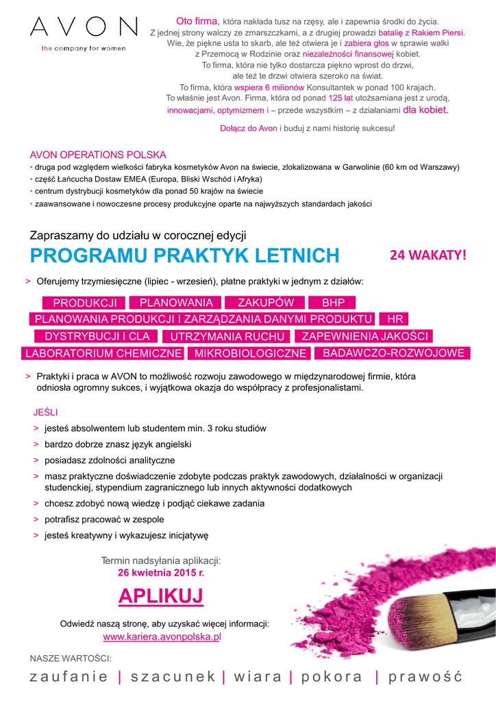 Oto firma, która nakłada tusz na rzęsy, ale i zapewnia środki do życia. Z jednej strony walczy ze zmarszczkami, a z drugiej prowadzi batalię z Rakiem Piersi. Wie, że piękne usta to skarb, ale też otwiera je i zabiera głos w sprawie walki z Przemocą w Rodzinie oraz niezależności finansowej kobiet. To firma, która nie tylko dostarcza piękno wprost do drzwi, ale też te drzwi otwiera szeroko na świat. To firma, która wspiera 6 milionów Konsultantek w ponad 100 krajach. To właśnie jest Avon. Firma, która od ponad 125 lat utożsamiana jest z urodą, innowacjami, optymizmem i – przede wszystkim – z działaniami dla kobiet. Dołącz do Avon i buduj z nami historię sukcesu! AVON OPERATIONS POLSKA • druga pod względem wielkości fabryka kosmetyków Avon na świecie, zlokalizowana w Garwolinie (60 km od Warszawy) • część Łańcucha Dostaw EMEA (Europa, Bliski Wschód i Afryka) • centrum dystrybucji kosmetyków dla ponad 50 krajów na świecie • zaawansowane i nowoczesne procesy produkcyjne oparte na najwyższych standardach jakości Zapraszamy do udziału w corocznej edycji PROGRAMU PRAKTYK LETNICH 24 WAKATY! > Oferujemy trzymiesięczne (lipiec - wrzesień), płatne praktyki w jednym z działów: BHP ZAKUPÓW PLANOWANIA PRODUKCJI PLANOWANIA PRODUKCJI I ZARZĄDZANIA DANYMI PRODUKTU DYSTRYBUCJI I CLA UTRZYMANIA RUCHU LABORATORIUM CHEMICZNE HR ZAPEWNIENIA JAKOŚCI MIKROBIOLOGICZNE BADAWCZO-ROZWOJOWE > Praktyki i praca w AVON to możliwość rozwoju zawodowego w międzynarodowej firmie, która odniosła ogromny sukces, i wyjątkowa okazja do współpracy z profesjonalistami. JEŚLI > jesteś absolwentem lub studentem min. 3 roku studiów > bardzo dobrze znasz język angielski > posiadasz zdolności analityczne > masz praktyczne doświadczenie zdobyte podczas praktyk zawodowych, działalności w organizacji studenckiej, stypendium zagranicznego lub innych aktywności dodatkowych > chcesz zdobyć nową wiedzę i podjąć ciekawe zadania > potrafisz pracować w zespole > jesteś kreatywny i wykazujesz inicjatywę Termin nadsyłania aplikacji: 26 kwietnia 2015 r. APLIKUJ Odwiedź naszą stronę, aby uzyskać więcej informacji: www.kariera.avonpolska.pl NASZE WARTOŚCI: zaufanie | szacunek | wiara | pokora | prawość