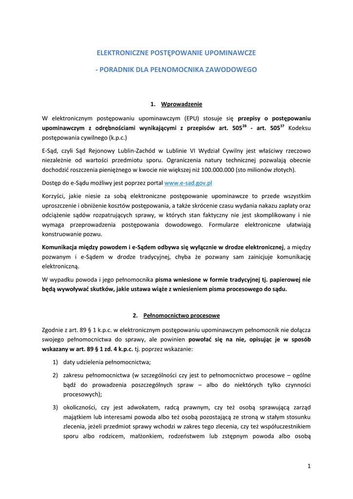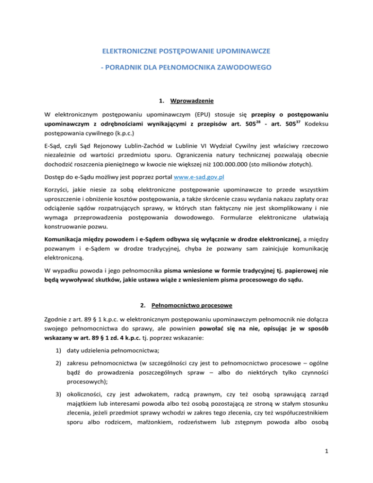 ELEKTRONICZNE POSTĘPOWANIE UPOMINAWCZE - PORADNIK DLA PEŁNOMOCNIKA ZAWODOWEGO 1. Wprowadzenie W elektronicznym postępowaniu upominawczym (EPU) stosuje się przepisy o postępowaniu upominawczym z odrębnościami wynikającymi z przepisów art. 50528 - art. 50537 Kodeksu postępowania cywilnego (k.p.c.) E-Sąd, czyli Sąd Rejonowy Lublin-Zachód w Lublinie VI Wydział Cywilny jest właściwy rzeczowo niezależnie od wartości przedmiotu sporu. Ograniczenia natury technicznej pozwalają obecnie dochodzić roszczenia pieniężnego w kwocie nie większej niż 100.000.000 (sto milionów złotych). Dostęp do e-Sądu możliwy jest poprzez portal www.e-sad.gov.pl Korzyści, jakie niesie za sobą elektroniczne postępowanie upominawcze to przede wszystkim uproszczenie i obniżenie kosztów postępowania, a także skrócenie czasu wydania nakazu zapłaty oraz odciążenie sądów rozpatrujących sprawy, w których stan faktyczny nie jest skomplikowany i nie wymaga przeprowadzenia postępowania dowodowego. Formularze elektroniczne ułatwiają konstruowanie pozwu. Komunikacja między powodem i e-Sądem odbywa się wyłącznie w drodze elektronicznej, a między pozwanym i e-Sądem w drodze tradycyjnej, chyba że pozwany sam zainicjuje komunikację elektroniczną. W wypadku powoda i jego pełnomocnika pisma wniesione w formie tradycyjnej tj. papierowej nie będą wywoływać skutków, jakie ustawa wiąże z wniesieniem pisma procesowego do sądu. 2. Pełnomocnictwo procesowe Zgodnie z art. 89 § 1 k.p.c. w elektronicznym postępowaniu upominawczym pełnomocnik nie dołącza swojego pełnomocnictwa do sprawy, ale powinien powołać się na nie, opisując je w sposób wskazany w art. 89 § 1 zd. 4 k.p.c. tj. poprzez wskazanie: 1) daty udzielenia pełnomocnictwa; 2) zakresu pełnomocnictwa (w szczególności czy jest to pełnomocnictwo procesowe – ogólne bądź do prowadzenia poszczególnych spraw – albo do niektórych tylko czynności procesowych); 3) okoliczności, czy jest adwokatem, radcą prawnym, czy też osobą sprawującą zarząd majątkiem lub interesami powoda albo też osobą pozostającą ze stroną w stałym stosunku zlecenia, jeżeli przedmiot sprawy wchodzi w zakres tego zlecenia, czy też współuczestnikiem sporu albo rodzicem, małżonkiem, rodzeństwem lub zstępnym powoda albo osobą 1 pozostające z powodem w stosunku przysposobienia, pracownikiem powoda będącego osobą prawną lub przedsiębiorcą. W wypadku, gdy pełnomocnictwo nie zostanie należycie opisane, e-Sąd wzywa pełnomocnika powoda do uzupełnienia braków formalnych pozwu. W takim wypadku należy pamiętać, że zgodnie z art. 50531 § 1 k.p.c. wszelkie pisma procesowe należy składać w postaci elektronicznej za pośrednictwem portalu e-Sądu. Jeśli brak nie zostanie uzupełniony w terminie tygodniowym, e-Sąd wyda zarządzenie o zwrocie pozwu. Konsekwencją braku wymogu przedłożenia pełnomocnictwa, jest brak obowiązku uiszczenia opłaty skarbowej od pełnomocnictwa. 3. Założenie konta w e-Sądzie Aby skorzystać z elektronicznego postępowania upominawczego (EPU) należy założyć konto w systemie teleinformatycznym e-Sądu i uzyskać certyfikat służący składaniu elektronicznego podpisu – z Centrum Certyfikacji EPU. W celu założenia konta należy wejść na stronę internetową: www.e-sad.gov.pl i wybrać zakładkę „Zarejestruj konto”. Następnie należy postępować zgodnie z pojawiającymi się na ekranie wskazówkami kreatora konta w EPU, wybierając na początku opcję „konto podstawowe”. Następnie należy podać dane: imiona i nazwisko, numer PESEL, numer dokumentu tożsamości, miejsce urodzenia, adres poczty elektronicznej, adres do korespondencji. Użytkownik musi również wskazać nazwę i hasło do bezpiecznego logowania. Ciąży na nim także obowiązek aktualizowania powyższych danych. Zawodowi pełnomocnicy wybierają dodatkowo opcję „profil pełnomocnika zawodowego” i wypełniają dane w formularzu, który pojawia się wówczas na ekranie: funkcja/stanowisko, numer wpisu na listę, W celu potwierdzenia uprawnień pełnomocnika zawodowego niezbędne jest następnie przesłanie pocztą wydruku składanego elektronicznie wniosku do Prezesa Sądu Rejonowego Lublin-Zachód za pośrednictwem właściwego organu samorządu radcowskiego lub adwokackiego (okręgowej izby radów prawnych lub okręgowej rady adwokackiej) - w trybie art. 229 ustawy o radcach prawnych lub art. 37b ustawy - Prawo o adwokaturze. Wniosek taki, już zaopatrzony w potwierdzenie o przynależności pełnomocnika do właściwego samorządu (adwokatów, radców prawnych), po akceptacji przez Prezesa Sądu Rejonowego Lublin-Zachód, skutkuje aktywacją konta pełnomocnika zawodowego. 2 Problematykę zakładania kont w e-Sądzie szczegółowo reguluje rozporządzenie Ministra Sprawiedliwości z 28 grudnia 2009 r. w sprawie trybu zakładania konta oraz sposobu posługiwania się podpisem elektronicznym w elektronicznym postępowaniu upominawczym (Dz. U. nr 226, poz. 1830). 4. Certyfikat w EPU (podpis elektroniczny) Niezbędne do prawidłowego wniesienia pozwu w elektronicznym postępowaniu upominawczym jest podpisanie pozwu. W EPU zarówno powód jak i jego pełnomocnik posługują się wyłącznie podpisem elektronicznym. Podpis ten służy do podpisywania pozwów oraz wszelkich innych pism procesowych, a także wniosków egzekucyjnych. W postępowaniu przed e-Sądem można posługiwać się zwykłym podpisem elektronicznym, uzyskiwanym poprzez portal e-Sądu, po założeniu konta i złożeniu stosownego wniosku o wydanie certyfikatu przez Centrum Certyfikacji Elektronicznego Postępowania Upominawczego. Okres ważności otrzymanego certyfikatu wynosi jeden rok. Oprócz zwykłego podpisu elektronicznego, o którym mowa wyżej, możliwe jest posługiwanie się bezpiecznym podpisem elektronicznym, weryfikowanym za pomocą ważnego kwalifikowanego certyfikatu, w rozumieniu art. 3 pkt 2 ustawy z dnia 1