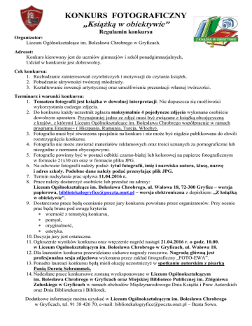 KONKURS FOTOGRAFICZNY „Książką w obiektywie” Regulamin konkursu Organizator: Liceum Ogólnokształcące im. Bolesława Chrobrego w Gryficach. Adresat: Konkurs kierowany jest do uczniów gimnazjów i szkół ponadgimnazjalnych, Udział w konkursie jest dobrowolny. Cek konkursu: 1. Rozbudzanie zainteresowań czytelniczych i motywacji do czytania książek. 2. Pobudzanie aktywności twórczej młodzieży. 3. Kształtowanie inwencji artystycznej oraz umożliwienie prezentacji własnej twórczości. Terminarz i warunki konkursu: 1. Tematem fotografii jest książka w dowolnej interpretacji. Nie dopuszcza się możliwości wykorzystania cudzego zdjęcia. 2. Do konkursu każdy uczestnik zgłasza maksymalnie 4 pojedyncze zdjęcia wykonane osobiście dowolnym aparatem. Przynajmniej jedno ze zdjęć musi być związane z książką obcojęzyczną z krajów, z którymi Liceum Ogólnokształcące im. Bolesława Chrobrego współpracuje w ramach programu Erasmus+ ( Hiszpania, Rumunia, Turcja, Włochy). 3. Fotografia musi być stworzona specjalnie na konkurs i nie może być nigdzie publikowana do chwili rozstrzygnięcia konkursu. 4. Fotografia nie może zawierać materiałów reklamowych oraz treści uznanych za pornograficzne lub niezgodne z normami obyczajowymi. 5. Fotografie powinny być w postaci odbitki czarno-białej lub kolorowej na papierze fotograficznym w formacie 21x30 cm oraz w formacie pliku JPG. 6. Na odwrocie fotografii należy podać: tytuł fotografii, imię i nazwisko autora, klasę, nazwę i adres szkoły. Podobne dane należy podać przesyłając plik JPG. 7. Termin nadsyłania prac upływa 11.04.2016 r. 8. Prace należy dostarczyć osobiście lub przesłać na adresy: Liceum Ogólnokształcące im. Bolesława Chrobrego, ul. Wałowa 18, 72-300 Gryfice – wersja papierowa, [email protected] – wersja elektroniczna z dopiskiem: „Z książką w obiektywie”. 9. Dostarczone prace będą ocenianie przez jury konkursu powołane przez organizatorów. Przy ocenie prac będą brane pod uwagę kryteria: wierność z tematyką konkursu, pomysł, oryginalność, estetyka. 10. Decyzja jury jest ostateczna. 11. Ogłoszenie wyników konkursu oraz wręczenie nagród nastąpi 21.04.2016 r. o godz. 10.00. w Liceum Ogólnokształcącym im. Bolesława Chrobrego w Gryficach, ul. Wałowa 18. 12. Dla laureatów konkursu przewidziano ciekawe nagrody rzeczowe. Nagrodą główną jest profesjonalna sesja zdjęciowa wykonana przez zakład fotograficzny „FOTO-EWA”. 13. Ponadto laureaci konkursu będą mieli okazję uczestniczyć w spotkaniu autorskim z pisarką Panią Dorotą Schrammek. 14. Nadesłane prace konkursowe zostaną wyeksponowane w Liceum Ogólnokształcącym im. Bolesława Chrobrego w Gryficach oraz Miejskiej Bibliotece Publicznej im. Zbigniewa Załuskiego w Gryficach w ramach obchodów Międzynarodowego Dnia Książki i Praw Autorskich oraz Dnia Bibliotekarza i Bibliotek. Dodatkowe informacje można uzyskać w Liceum Ogólnokształcącym im. Bolesława Chrobrego w Gryficach, tel. 91 38 426 70, e-mail: [email protected] – Beata Sowa.