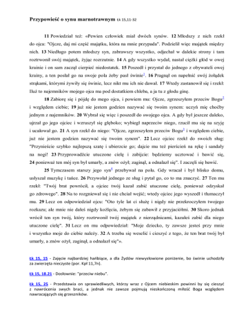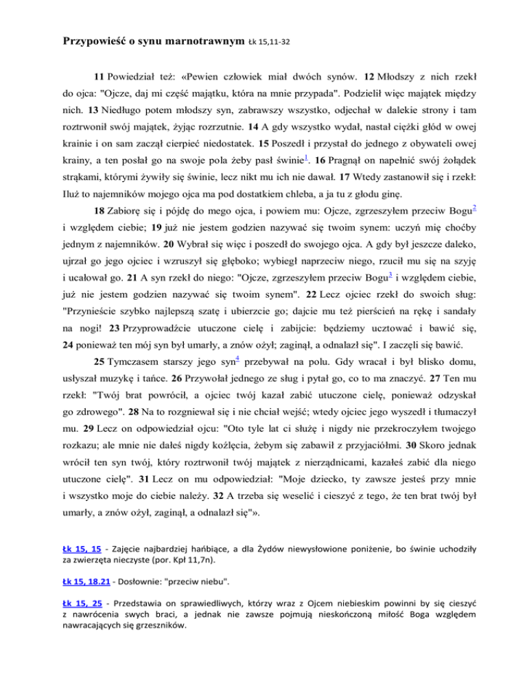 Przypowieść o synu marnotrawnym Łk 15,11-32 11 Powiedział też: «Pewien człowiek miał dwóch synów. 12 Młodszy z nich rzekł do ojca: "Ojcze, daj mi część majątku, która na mnie przypada". Podzielił więc majątek między nich. 13 Niedługo potem młodszy syn, zabrawszy wszystko, odjechał w dalekie strony i tam roztrwonił swój majątek, żyjąc rozrzutnie. 14 A gdy wszystko wydał, nastał ciężki głód w owej krainie i on sam zaczął cierpieć niedostatek. 15 Poszedł i przystał do jednego z obywateli owej krainy, a ten posłał go na swoje pola żeby pasł świnie1. 16 Pragnął on napełnić swój żołądek strąkami, którymi żywiły się świnie, lecz nikt mu ich nie dawał. 17 Wtedy zastanowił się i rzekł: Iluż to najemników mojego ojca ma pod dostatkiem chleba, a ja tu z głodu ginę. 18 Zabiorę się i pójdę do mego ojca, i powiem mu: Ojcze, zgrzeszyłem przeciw Bogu 2 i względem ciebie; 19 już nie jestem godzien nazywać się twoim synem: uczyń mię choćby jednym z najemników. 20 Wybrał się więc i poszedł do swojego ojca. A gdy był jeszcze daleko, ujrzał go jego ojciec i wzruszył się głęboko; wybiegł naprzeciw niego, rzucił mu się na szyję i ucałował go. 21 A syn rzekł do niego: "Ojcze, zgrzeszyłem przeciw Bogu 3 i względem ciebie, już nie jestem godzien nazywać się twoim synem". 22 Lecz ojciec rzekł do swoich sług: "Przynieście szybko najlepszą szatę i ubierzcie go; dajcie mu też pierścień na rękę i sandały na nogi! 23 Przyprowadźcie utuczone cielę i zabijcie: będziemy ucztować i bawić się, 24 ponieważ ten mój syn był umarły, a znów ożył; zaginął, a odnalazł się". I zaczęli się bawić. 25 Tymczasem starszy jego syn4 przebywał na polu. Gdy wracał i był blisko domu, usłyszał muzykę i tańce. 26 Przywołał jednego ze sług i pytał go, co to ma znaczyć. 27 Ten mu rzekł: "Twój brat powrócił, a ojciec twój kazał zabić utuczone cielę, ponieważ odzyskał go zdrowego". 28 Na to rozgniewał się i nie chciał wejść; wtedy ojciec jego wyszedł i tłumaczył mu. 29 Lecz on odpowiedział ojcu: "Oto tyle lat ci służę i nigdy nie przekroczyłem twojego rozkazu; ale mnie nie dałeś nigdy koźlęcia, żebym się zabawił z przyjaciółmi. 30 Skoro jednak wrócił ten syn twój, który roztrwonił twój majątek z nierządnicami, kazałeś zabić dla niego utuczone cielę". 31 Lecz on mu odpowiedział: "Moje dziecko, ty zawsze jesteś przy mnie i wszystko moje do ciebie należy. 32 A trzeba się weselić i cieszyć z tego, że ten brat twój był umarły, a znów ożył, zaginął, a odnalazł się"». Łk 15, 15 - Zajęcie najbardziej hańbiące, a dla Żydów niewysłowione poniżenie, bo świnie uchodziły za zwierzęta nieczyste (por. Kpł 11,7n). Łk 15, 18.21 - Dosłownie: "przeciw niebu". Łk 15, 25 - Przedstawia on sprawiedliwych, którzy wraz z Ojcem niebieskim powinni by się cieszyć z nawrócenia swych braci, a jednak nie zawsze pojmują nieskończoną miłość Boga względem nawracających się grzeszników.