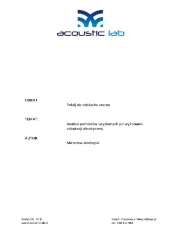 OBIEKT: Pokój do odsłuchu stereo TEMAT: Analiza pomiarów uzyskanych po wykonaniu adaptacji akustycznej AUTOR: Mirosław Andrejuk Białystok, 2011 www.acousticlab.pl email: [email protected] tel. 790 417 963 Spis treści: Wprowadzenie ...................................................................................................................................3 1. Porównanie czasów pogłosu ......................................................................................................3 2. Porównanie charakterystyk częstotliwości .................................................................................4 Wnioski ..............................................................................................................................................8 2 www.acousticlab.pl Wprowadzenie Niniejszy dokument jest analizą warunków akustycznych uzyskanych po wykonaniu adaptacji akustycznej wykonanej zgodnie z projektem adaptacji akustycznej dedykowanego pomieszczenia w domu jednorodzinnym opracowanego wcześniej. Zawiera się w dwóch punktach porównując zarówno charakterystykę częstotliwości mówiącą o tym jak głośne są poszczególne tony podczas odtwarzania ich na tym samym poziomie głośności, jak i czas pogłosu czyli jak szybko zanikają poszczególne tony w pomieszczeniu po zaprzestaniu ich generowania. 1. Porównanie czasów pogłosu Pomiar czasu pogłosu w pomieszczeniu przed adaptacją prezentował się następująco: Rysunek 1 – Charakterystyka czasu pogłosu (pomieszczenie przed adaptacją) Minimum wypadało przy 62Hz i wynosiło 0,33 sekundy, a maksimum 0,56 s przy 500Hz. Poniżej częstotliwości 500Hz widad mocne obniżenie czasu pogłosu do poziomu średnio 0,36 s, zaś powyżej 500Hz średni poziom czasu pogłosu wynosił 0,52 s. Te obniżenie było spowodowane niedbałym montażem płyty GK która drgając pochłaniała fale średnich tonów. Zaś niskie częstotliwości z 3 www.acousticlab.pl łatwością opuszały pomieszczenie przechodząc przez 12,5 milimetrową przeszkodę w postaci płyty GK. Po wykonaniu adaptacji, a w szczególności wypełnieniu pustek w ścianach wewnętrznych domu, wykonaniu pełnego deskowania i położeniu płyt GK o zwiększonej gęstości, które zostały przykręcone w odstępach 30-35cm efekt obniżenia czasu pogłosu przy niskich częstotliwościach został usunięty. Prezentuje to poniższy wykres: Rysunek 2 – Charakterystyka czasu pogłosu (pomieszczenie po adaptacji) Średni czas pogłosu w paśmie do 1,5kHz wynosi 0,44 s, natomiast w paśmie powyżej 1,5kHz wynosi 0,38 sekundy. Niskie częstotliwości nie zanikają już tak szybko, a średnie i wysokie dzięki dyfuzorom zanikają szybciej przez co cała charakterystyka czasu pogłosu jest równiejsza. Co najważniejsze zwiększenie zanikania niskich częstotliwości nie odbyło się kosztem jakichkolwiek podbid niskich częstotliwości co będzie widoczne przy porównywaniu charakterystyk częstotliwości z okresu przed i po wykonaniu adaptacji akustycznej. Po wykonaniu brakujących pochłaniaczy na suficie wyrównaniu ulegnie podbicie w paśmie 400-600Hz. 2. Porównanie charakterystyk częstotliwości Pomiar charakterystyki częstotliwości wykonany w punkcie odsłuchu umieszczonym 2,7m od ściany tylnej i 1,98m od ściany lewej w pomieszczeniu przed wykonaniem adaptacji prezentuje się następująco: 4 www.acousticlab.pl Rysunek 3 – Charakterystyka częstotliwości 25Hz-15kHz (pomieszczenie przed adaptacją) Wykres ten został skomentowany w projekcie adaptacji pomieszczenia odsłuchowego w punkcie 2.7. Przybliżenie niskich częstotliwości prezentuje poniższy wykres: Rysunek 4 – Charakterystyka częstotliwości 25-125Hz (pomieszczenie przed adaptacją) Najważniejszym aspektem adaptacji akustycznej było wyrównanie charakterystyki przez usunięcie zjawiska nakładania się na siebie fal, które powodowało tak mocne obniżenie charakterystyki w okolicy 38Hz. Kolejnymi aspektami na których się skupiłem było wyrównanie podbid pasma w okolicy 70Hz i 120Hz. W tym celu wykonałem dwie duże pułapki basowe i trzy mniejsze (ich opis znajduje się 5 www.acousticlab.pl w punkcie 3 opracowania adaptacji akustycznej). Wykonanie wszystkich rozwiązao akustycznych opisanych w punkcie 3 projektu adaptacji (oprócz pochłaniacza na suficie) dało następujący rezultat: Rysunek 5 – Charakterystyka częstotliwości 25Hz - 15kHz (linia niebieska – przed adaptacją, czerwona po adaptacji) Linia niebieska na powyższym wykresie prezentuje charakterystykę częstotliwości w miejscu odsłuchu zmierzoną mikrofonem na statywie przed wykonaniem adaptacji akustycznej. Linia czerwona prezentuje charakterystykę częstotliwości zmierzoną w miejscu odsłuchu po wykonaniu adaptacji akustycznej. Pomiar przed adaptacją wykonałem mikrofonem zamontowanym na statywie, który stał na podłodze. Pomiar po wykonaniu adaptacji również wykonałem w miejscu odsłuchu, jednak już nie ze statywu ustawionego na podłodze tylko na kanapie na wysokości uszu. Dzięki temu czerwona linia na wykresie prezentuje nie zakłamaną charakterystyką, którą słyszy osoba siedząca w środku miejsca odsłuchowego, tzw. sweet spot. Po wykresach widad, że pułapki basowe dodały basu. Nastąpiło znaczne wyrównanie całego pasma, nie ma już tak mocnego dołka w paśmie przy 38Hz. Przed adaptacją minimum głośności na wykresie wypadało przy 37Hz i wynosiło 50dB. Maksimum miało wartośd 103dB przy 121Hz. Amplituda głośności wynosiła (103-50=) 53dB. Po adaptacji minimum wynosi 59dB przy 30Hz, a maksimum 86dB przy 102Hz. Amplituda głośności poszczególnych częstotliwości przed wykonaniem adaptacji wynosiła (103-50=) 53dB. Obecnie jest to (86–59=) 27dB. Są to rzeczywiste wartości podawane dla wykresów prezentowanych bez żadnego ich łagodzenia w paśmie niskich i średnich częstotliwości. Łagodzenie w pasmach 1/48 oktawy jest wymagane, aby dało s