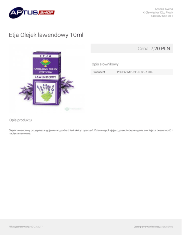 Apteka Avena Królewiecka 12c, Płock +48 502 666 011 Etja Olejek lawendowy 10ml Cena: 7,20 PLN Opis słownikowy Producent PROFARM P.P.F.K. SP. Z O.O. Opis produktu Olejek lawendowy przyspiesza gojenie ran, podrażnień skóry i oparzeń. Działa uspokajająco, przeciwdepresyjnie, zmniejsza bezsenność i napięcia nerwowe. Plik wygenerowano: 02-03-2017 Powered by TCPDF (www.tcpdf.org) Oprogramowanie sklepu: AptusShop