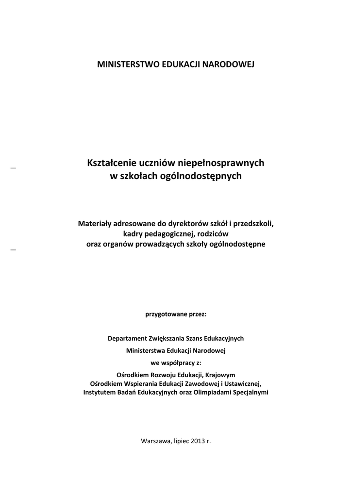 MINISTERSTWO EDUKACJI NARODOWEJ Kształcenie uczniów niepełnosprawnych w szkołach ogólnodostępnych Materiały adresowane do dyrektorów szkół i przedszkoli, kadry pedagogicznej, rodziców oraz organów prowadzących szkoły ogólnodostępne przygotowane przez: Departament Zwiększania Szans Edukacyjnych Ministerstwa Edukacji Narodowej we współpracy z: Ośrodkiem Rozwoju Edukacji, Krajowym Ośrodkiem Wspierania Edukacji Zawodowej i Ustawicznej, Instytutem Badań Edukacyjnych oraz Olimpiadami Specjalnymi Warszawa, lipiec 2013 r. Oświata w Rzeczypospolitej Polskiej stanowi wspólne dobro całego społeczeństwa; kieruje się zasadami zawartymi w Konstytucji Rzeczypospolitej Polskiej, a także wskazaniami zawartymi w Powszechnej Deklaracji Praw Człowieka, Międzynarodowym Pakcie Praw Obywatelskich i Politycznych oraz Konwencji o Prawach Dziecka.1 Polityka oświatowa realizuje również postanowienia Konwencji Praw Osób Niepełnosprawnych, w szczególności w odniesieniu do artykułu 24 Konwencji, który zobowiązuje państwa ratyfikujące Konwencję do zapewnienia edukacji włączającej na wszystkich szczeblach kształcenia.2. Kształcenie uczniów niepełnosprawnych w szkołach ogólnodostępnych należy do jednego z głównych kierunków polityki oświatowej państwa w roku szkolnym 2012/2013. Włączanie uczniów niepełnosprawnych do kształcenia we wszystkich typach szkół i placówek, w tym szkołach ogólnodostępnych i integracyjnych, umożliwia elastyczny system kształcenia w Polsce. Kształcenie uczniów niepełnosprawnych może się bowiem odbywać w szkołach ogólnodostępnych, szkołach lub oddziałach integracyjnych, szkołach lub oddziałach specjalnych oraz ośrodkach. Dzieci i młodzież z upośledzeniem umysłowym w stopniu głębokim obowiązek szkolny i obowiązek nauki spełniają poprzez udział w zajęciach rewalidacyjno-wychowawczych, organizowanych na podstawie orzeczenia o potrzebie zajęć rewalidacyjno-wychowawczych. Oceny poziomu funkcjonowania ucznia niepełnosprawnego dokonują specjaliści w poradni psychologiczno-pedagogicznej, którzy wskazując w orzeczeniu o potrzebie kształcenia specjalnego zalecane formy kształcenia, wspierają rodziców w wyborze szkoły najbardziej odpowiedniej dla ich dziecka. Natomiast decyzję o wyborze formy i miejsca kształcenia podejmują rodzice (opiekunowie prawni) dziecka, którzy zgodnie z Konstytucją Rzeczpospolitej Polskiej, mają wyłączne prawo do decydowania o swoim dziecku, o ile prawo to nie zostanie im ograniczone lub nie zostaną go pozbawieni. Szeroko rozumiana idea włączania uczniów niepełnosprawnych do kształcenia w szkołach ogólnodostępnych zawiera się we wprowadzanych zmianach w zakresie organizacji pomocy psychologiczno–pedagogicznej i kształcenia specjalnego, których wdrażanie rozpoczęło się 1 września 2011 r. w przedszkolach, oddziałach przedszkolnych w szkołach podstawowych, gimnazjach i szkołach specjalnych wszystkich typów. Od 1 września 2012 r. zmiany te obowiązują również w szkołach podstawowych i ponadgimnazjalnych ogólnodostępnych i integracyjnych. Niniejszy materiał informacyjny ma stanowić pomoc i inspirację dla dyrektorów szkół, kadry nauczycieli i specjalistów, pracowników kuratoriów oświaty, organów prowadzących, jak również rodziców dzieci i młodzieży niepełnosprawnych, w zakresie organizacji efektywnego kształcenia uczniów niepełnosprawnych w szkołach ogólnodostępnych i zapewnienia im wsparcia odpowiedniego do rozpoznanych potrzeb. 1 Preambuła ustawy o systemie oświaty z dnia 7 września 1991 r. (Dz. U. z 2004 r. Nr 256, poz. 2572, z późn. zm.) 2 ustawa o ratyfikacji Konwencji o prawach osób niepełnosprawnych, sporządzonej w Nowym Jorku dnia 13 grudnia 2006 r. (Dz. U. poz.882) 2 Materiał został przygotowany przez Ministerstwo Edukacji Narodowej we współpracy z Ośrodkiem Rozwoju Edukacji (ORE), Krajowym Ośrodkiem Wspierania Edukacji Zawodowej i Ustawicznej (KOWEZiU), Instytutem Badań Edukacyjnych (IBE) oraz Olimpiadami Specjalnymi. Zostały tu umieszczone linki do przykładów dobrych praktyk, ciekawych materiałów i wyników badań, które mogą stanowić wsparcie w realizacji zadań wynikających z przepisów prawa i inspirację do podejmowania wspólnych działań na rzecz uczniów niepełnosprawnych przez nauczycieli, dyrektorów szkół, pracowników poradni psychologiczno-pedagogicznych, rodziców, organów prowadzących oraz pracowników kuratoriów oświaty, organizacje i instytucje działające na rzecz dziecka i rodziny, a także wykaz aktów prawnych dotyczących edukacji uczniów niepełnosprawnych. 3 Obowiązki organów prowadzących szkoły, do których uczęszczają uczniowie niepełnosprawni Zgodnie z art. 71b ust. 5, 5a i 5b ustawy o systemie oświaty za zapewnienie kształcenia specjalnego ucznia niepełnosprawnego odpowiedzialna jest właściwa jednostka samorządu terytorialnego, do której zadań należy prowadzenie odpowiednio przedszkoli lub szkół danego typu i rodzaju. Zgodnie z przepisami art. 5 ust. 7 ww. ustawy organ prowadzący szkołę odpowiada za jej działalność i do jego zadań należy w szczególności: zapewnienie warunków działania szkoły lub placówki, w tym bezpiecznych i higienicznych warunków nauki, wychowania i opieki, wykonywanie remontów obiektów szkolnych oraz zadań inwestycyjnych w tym zakresie, zapewnienie obsługi administracyjnej, finansowej, w tym w zakresie wykonywania czynności, o których mowa w art. 4 ust. 3 pkt 2-6 ustawy z dnia 29 września 1994 r. o rachunkowości, i organizacyjnej szkoły lub placówki, wyposażenie szkoły lub placówki w pomoce dydaktyczne i sprzęt niezbędny do pełnej realizacji programów nauczania, programów wychowawczych, przeprowadzania sprawdzianów i egzaminów oraz wykonywania innych zadań statutowych. Należy zaznaczyć, że z ogólnej kwoty części oświatowej subwencji ogólnej wyodrębnia się zgodnie z a