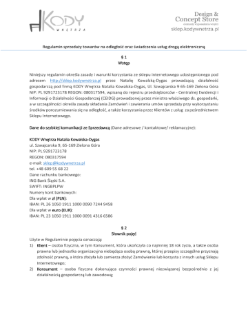 Regulamin sprzedaży towarów na odległość oraz świadczenia usług drogą elektroniczną §1 Wstęp Niniejszy regulamin określa zasady i warunki korzystania ze sklepu internetowego udostępnionego pod adresem http://sklep.kodywnetrza.pl przez Natalię Kowalską-Dygas prowadzącą działalność gospodarczą pod firmą KODY Wnętrza Natalia Kowalska-Dygas, Ul. Szwajcarska 9 65-169 Zielona Góra NIP: PL 9291723178 REGON: 080317594, wpisaną do rejestru przedsiębiorców - Centralnej Ewidencji i Informacji o Działalności Gospodarczej (CEIDG) prowadzonej przez ministra właściwego ds. gospodarki, a w szczególności określa zasady składania Zamówień i zawierania umów sprzedaży przy wykorzystaniu środków porozumiewania się na odległość, a także korzystania przez Klientów z usług za pośrednictwem Sklepu Internetowego. Dane do szybkiej komunikacji ze Sprzedawcą (Dane adresowe / kontaktowe/ reklamacyjne): KODY Wnętrza Natalia Kowalska-Dygas ul. Szwajcarska 9, 65-169 Zielona Góra NIP: PL 9291723178 REGON: 080317594 e-mail: [email protected] tel. +48 609 55 68 22 Dane rachunku bankowego: ING Bank Śląski S.A. SWIFT: INGBPLPW Numery kont bankowych: Dla wpłat w zł (PLN): IBAN: PL 26 1050 1911 1000 0090 7244 9458 Dla wpłat w euro (EUR): IBAN: PL 23 1050 1911 1000 0091 4316 6586 §2 Słownik pojęć Użyte w Regulaminie pojęcia oznaczają: 1) Klient – osoba fizyczna, w tym Konsument, która ukończyła co najmniej 18 rok życia, a także osoba prawna lub jednostka organizacyjna niebędąca osobą prawną, której przepisy szczególne przyznają zdolność prawną, a która złożyła lub zamierza złożyć Zamówienie lub korzysta z innych usług Sklepu Internetowego; 2) Konsument – osoba fizyczna dokonująca czynności prawnej niezwiązanej bezpośrednio z jej działalnością gospodarczą lub zawodową; Regulamin sprzedaży towarów na odległość oraz świadczenia usług drogą elektroniczną 3) Konto (Konto Klienta) – podstrona Sklepu, w ramach której Klient ma możliwość m.in. zarządzać danymi osobowymi, zarządzać stanem złożonych przez niego Zamówień, a także składać Zamówienia po zalogowaniu bez konieczności podawania swoich danych osobowych; 4) Regulamin – niniejszy Regulamin sprzedaży przy wykorzystaniu środków porozumiewania się na odległość oraz świadczenia usług drogą elektroniczną. W zakresie usług świadczonych drogą elektroniczną Regulamin jest regulaminem, o którym mowa w art. 8 ustawy z dnia 18 lipca 2002 r. o świadczeniu usług drogą elektroniczną; 5) Rejestracja – jednorazowa dowolna i bezpłatna czynność, polegająca na założeniu przez Klienta Konta Klienta, dokonana z wykorzystaniem panelu administracyjnego udostępnionego przez Usługodawcę na stronie Sklepu; 6) Sklep Internetowy (dalej także jako „Sklep”) – serwis internetowy dostępny pod adresem http://sklep.kodywnetrza.pl za pośrednictwem którego Klient może składać Zamówienia, a także korzystać z pozostałych Usług Sklepu; 7) Strona – Usługodawca lub Klient; 8) Towar – rzecz ruchoma będąca przedmiotem Umowy sprzedaży; 9) Umowa sprzedaży – umowa sprzedaży w rozumieniu ustawy Kodeks cywilny, zawierana pomiędzy Usługodawcą a Klientem z wykorzystaniem środków porozumiewania się na odległość za pośrednictwem Sklepu, której przedmiotem są Towary; 10) Usługa (Usługi) – usługa świadczona przez Usługodawcę drogą elektroniczną na zasadach określonych w Regulaminie za pośrednictwem Sklepu; 11) Usługodawca (także „Sprzedawca”) – Natalia Kowalska-Dygas prowadząca działalność gospodarczą pod firmą KODY Wnętrza Natalia Kowalska-Dygas, ul. Szwajcarska 9 65-169 Zielona Góra NIP: PL 9291723178 REGON: 080317594; 12) Ustawa – ustawa z dnia 30 maja 2014 roku o prawach konsumenta (Dz.U. 2014, poz. 827); 13) Zamówienie – oświadczenie woli Klienta stanowiące ofertę zawarcia Umowy sprzedaży z Usługodawcą, zmierzające bezpośrednio do zawarcia Umowy sprzedaży na odległość za pośrednictwem Sklepu Internetowego określające rodzaj i liczbę Towarów będących przedmiotem Umowy sprzedaży. §3 Obowiązki Stron 1. Klient zobowiązany jest do korzystania z Usług oferowanych przez Usługodawcę w sposób zgodny z przepisami obowiązującego na terytorium Rzeczypospolitej Polskiej prawa, postanowieniami Regulaminu, a także do niedostarczania treści zabronionych przez powszechnie obowiązujące przepisy prawa. 2. Sprzedawca jest zobowiązany do dostarczenia Towaru wolnego od wad. 3. Jeżeli kupującym jest Konsument, Sprzedawca obowiązany jest niezwłocznie wydać rzecz kupującemu, nie później niż trzydzieści dni od dnia zawarcia Umowy sprzedaży, chyba że Umowa sprzedaży stanowi inaczej (np. w opisie Towaru wskazany jest inny termin dostarczenia Towaru). Regulamin sprzedaży towarów na odległość oraz świadczenia usług drogą elektroniczną 1. 2. 3. 4. 5. 6. 7. 8. 9. 1. 2. 3. §4 Zamówienia Klient może składać Zamówienia za pośrednictwem Sklepu Internetowego 7 dni w tygodniu, 24 godziny na dobę. Do złożenia Zamówienia nie jest konieczna Rejestracja. W celu zawarcia Umowy sprzedaży Towaru na odległość poprzez Sklep Internetowy należy dokonać wyboru Towaru, zalogować się na Konto Klienta albo podać niezbędne dane wymagane przez Sprzedawcę podczas procesu składania Zamówienia oraz ostatecznie złożyć Zamówienie podejmując kolejne czynności w oparciu o wyświetlane Klientowi informacje. Zamówienie zostaje złożone z chwilą naciśnięcia przez Klienta przycisku „Zamawiam”. W trakcie całego procesu składania Zamówienia, aż do momentu naciśnięcia przycisku „Zamawiam” – Klient ma możliwość modyfikacji składanego Zamówienia. Warunkiem złożenia skutecznego Zamówienia jest zapoznanie się i zaakceptowanie przez Klienta Regulaminu. Złożenie Zamówienia stanowi ofertę zawarcia Umowy sprzedaży Towarów, w rozumieniu Kodeksu cywilne