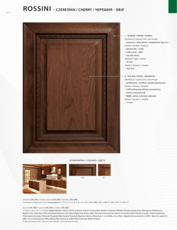 K 11 Rossini – czereśnia / cherry / Черешня – XBJF 1. Ramiak / frame / Рамка: konstrukcja / construction / конструкция – uciosowa / mitre joints / соединение под «ус» materiał / material / материал – drewno lite – olcha – solid wood – alder – массив ольха szerokość / width / ширина – 70 mm grubość / thickness / толщина – 19,5 mm 2. Płycina / panel / филенка: konstrukcja / construction / конструкция – profilowana / profiled / профилированная materiał / material / материал – mdf fornirowany okleiną czereśniową – cherry veneered mdf – МДФ с натур. шпоном черешни grubość / thickness / толщина – 11 mm Wybarwienia / Colours / Цветa witraże do 5.3 5.1 DR, DRG / stained glass for DR, DRG / витражи к DR, DRG: / stained glass type / тип витража: F-1, G-1, I-1, J-1, O-1, N-1, P-1, R-1, PA-1, PB-1, PC-1, PD-1**, PE-1, PF-1**, PG-1** typ witraży DR, DRG / glass for DR, DRG / стекло к DR, DRG: / glass type / тип стекла: Faggio Wanilia, Colmo Czarne, Satinato, Antisol, Satyna Brąz, Warkocz Satinato, Warkocz Przezroczyste, Róża, Winogrono, Bezbarwne, Master Care, Duże Karo Clear, Porcelana Brązowa, Porcelana Niebieska, Wrzos, Maki, Winorośl, Pomarańcze, Kamienie, Kaczki, Kwiat Tłoczony, Kostki, Tribal (rzeźbiony), Tribal (grawerowany), Dzbanek, Kryształy Biała Satyna, Kryształy Brązowa Satyna, Abstrakcja 1, Linie Białe, Linie Złote, Ogigole (nie stosowane w DRG / does not apply for DRG / не используется в DRG), Bukiet Róż Czerwony, Bukiet Róż Fioletowy, Bukiet Maków. ** (nie stosowane w drg / does not apply for drg / не используется в drg) szkło do typ szkła