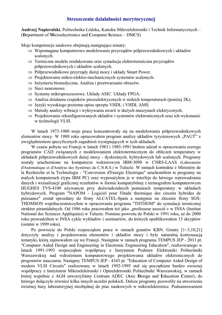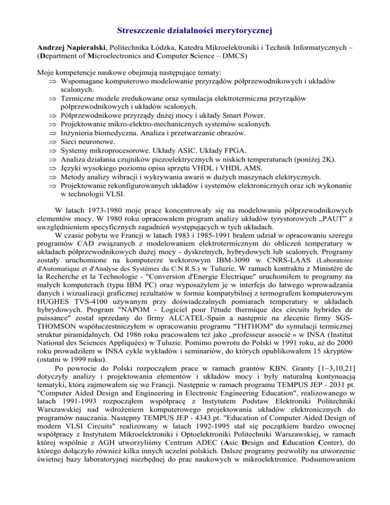 Streszczenie działalności merytorycznej Andrzej Napieralski, Politechnika Łódzka, Katedra Mikroelektroniki i Technik Informatycznych – (Department of Microelectronics and Computer Science – DMCS) Moje kompetencje naukowe obejmują następujące tematy: ⇒ Wspomagane komputerowo modelowanie przyrządów półprzewodnikowych i układów scalonych. ⇒ Termiczne modele zredukowane oraz symulacja elektrotermiczna przyrządów półprzewodnikowych i układów scalonych. ⇒ Półprzewodnikowe przyrządy dużej mocy i układy Smart Power. ⇒ Projektowanie mikro-elektro-mechanicznych systemów scalonych. ⇒ Inżynieria biomedyczna. Analiza i przetwarzanie obrazów. ⇒ Sieci neuronowe. ⇒ Systemy mikroprocesorowe. Układy ASIC. Układy FPGA. ⇒ Analiza działania czujników piezoelektrycznych w niskich temperaturach (poniżej 2K). ⇒ Języki wysokiego poziomu opisu sprzętu VHDL i VHDL AMS. ⇒ Metody analizy wibracji i wykrywania awarii w dużych maszynach elektrycznych. ⇒ Projektowanie rekonfigurowanych układów i systemów elektronicznych oraz ich wykonanie w technologii VLSI. W latach 1973-1980 moje prace koncentrowały się na modelowaniu półprzewodnikowych elementów mocy. W 1980 roku opracowałem program analizy układów tyrystorowych „PAUT” z uwzględnieniem specyficznych zagadnień występujących w tych układach. W czasie pobytu we Francji w latach 1983 i 1985-1991 brałem udział w opracowaniu szeregu programów CAD związanych z modelowaniem elektrotermicznym do obliczeń temperatury w układach półprzewodnikowych dużej mocy - dyskretnych, hybrydowych lub scalonych. Programy zostały uruchomione na komputerze wektorowym IBM-3090 w CNRS-LAAS (Laboratoire d'Automatique et d'Analyse des Systèmes du C.N.R.S.) w Tuluzie. W ramach kontraktu z Ministère de la Recherche et la Technologie - "Conversion d'Energie Electrique" uruchomiłem te programy na małych komputerach (typu IBM PC) oraz wyposażyłem je w interfejs do łatwego wprowadzania danych i wizualizacji graficznej rezultatów w formie kompatybilnej z termografem komputerowym HUGHES TVS-4100 używanym przy doświadczalnych pomiarach temperatury w układach hybrydowych. Program "NAPOM - Logiciel pour l'étude thermique des circuits hybrides de puissance" został sprzedany do firmy ALCATEL-Spain a następnie na zlecenie firmy SGSTHOMSON współuczestniczyłem w opracowaniu programu "THTHOM" do symulacji termicznej struktur piramidalnych. Od 1986 roku pracowałem też jako „professeur associé » w INSA (Institut National des Sciences Appliquées) w Tuluzie. Pomimo powrotu do Polski w 1991 roku, aż do 2000 roku prowadziłem w INSA cykle wykładów i seminariów, do których opublikowałem 15 skryptów (ostatni w 1999 roku). Po powrocie do Polski rozpocząłem prace w ramach grantów KBN. Granty [1−3,10,21] dotyczyły analizy i projektowania elementów i układów mocy i były naturalną kontynuacją tematyki, którą zajmowałem się we Francji. Następnie w ramach programu TEMPUS JEP - 2031 pt. "Computer Aided Design and Engineering in Electronic Engineering Education", realizowanego w latach 1991-1993 rozpocząłem współpracę z Instytutem Podstaw Elektroniki Politechniki Warszawskiej nad wdrożeniem komputerowego projektowania układów elektronicznych do programów nauczania. Następny TEMPUS JEP - 4343 pt. "Education of Computer Aided Design of modern VLSI Circuits" realizowany w latach 1992-1995 stał się początkiem bardzo owocnej współpracy z Instytutem Mikroelektroniki i Optoelektroniki Politechniki Warszawskiej, w ramach której wspólnie z AGH utworzyliśmy Centrum ADEC (Asic Design and Education Center), do którego dołączyło również kilka innych uczelni polskich. Dalsze programy pozwoliły na utworzenie świetnej bazy laboratoryjnej niezbędnej do prac naukowych w mikroelektronice. Podsumowaniem tych prac było otrzymanie projektu REASON (Research and Training Action for System on Chip Design) w ramach V Programu Ramowego UE. Następne granty KBN [4-9] stanowiły kontynuację rozpoczętych prac w ramach programów TEMPUS. W 1994 roku zostałem zaproszony do uczestnictwa w programie ESPRIT (European Strategic Programme for Research and Development in Information Technology - CEC- 8173 BARMINT (Basic Research for Microsystems Integration)). W ciągu 3 lat pracy udało się nam zaprojektować i wyprodukować termiczną mikropompę krzemową, będącą częścią mikrosystemu scalonego, służącą do wstrzykiwania leku „on line” do ciała pacjenta oraz wyprodukować pierwszy europejski mikrosilnik krzemowy. Dużym sukcesem był też pierwszy w historii MPW (Multi Project Wafer) w technologii ES2 1.0μm MEMS-CMOS, zawierający projekty kilkunastu mikrosystemów krzemowych nadesłanych przez wiodące ośrodki naukowo-badawcze z Europy i USA. (w tym opracowany przy moim udziale projekt DMCS). Projekt nasz zawierał czujniki promieniowania podczerwonego, przetworniki elektrotermiczne, czujniki przepływu gazu i czujniki przyśpieszenia. Aktualnie w ramach CMP (Circuits Multi Project) czy też Europractice układy mikromaszynowe są już się standardem. Projekt BARMINT wykazał ogromną rolę symulacji VHDL-A w projektowaniu mikrosystemów krzemowych. Granty KBN [11,12,16,20,29,34] były bezpośrednią kontynuacją tej tematyki. Następne prace dotyczyły metod projektowania i realizacji analogowych układów VLSI dla zakresu wysokich częstotliwości [13] oraz komputerowej analizy układów elektronicznych z zastosowaniem wielowymiarowych modeli fizycznych przyrządów półprzewodnikowych mocy [14] i elektrotermicznej symulacji układów VLSI ze szczególnym uwzględnieniem integracji w środowisku CADENCE [15]. Naturalnym połączeniem tematyki dotyczącej elementów mocy i układów VLSI było rozpoczęcie prac nad układami Smart Power [24,25] Inny wątek kierowanych przeze mnie prac to projektowanie sieci neuronowych i ich realizacja fizyczna w postaci układów scalonych VL
