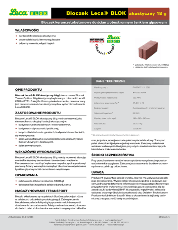 Bloczek_Leca®_BLOK akustyczny 18 g Bloczek keramzytobetonowy do ścian z obustronnym tynkiem gipsowym WŁAŚCIWOŚCI • bardzo dobra izolacja akustyczna • dobre właściwości termoregulacyjne • odporny na mróz, wilgoć i ogień • paleta ok. 40 elementów (ok. 1040 kg) • dokładna ilość zależy od producenta DANE TECHNICZNE Opis produktu Bloczek Leca® BLOK akustyczny 18 g (dawna nazwa Bloczek Termo Optiroc 18 g Akustyczny) wykonany z mieszanki Leca® KERAMZYTU frakcji 0-10 mm, piasku i cementu, przeznaczony jest do wznoszenia ścian akustycznych w systemie budowania Leca® BLOK. Zastosowanie produktu Bloczek Leca® BLOK akustyczny 18 g można stosować jako element konstrukcyjny i izolacji akustycznej w: budynkach jednorodzinnych i wielorodzinnych, • • budynkach użyteczności publicznej, • innych obiektach m.in. garażach, budynkach inwentarskich, do wykonywania: ścian wewnętrznych o wysokiej izolacyjności akustycznej (konstrukcyjnych i działowych), • • ścian zewnętrznych. Wskazówki wykonawcze Bloczek Leca® BLOK akustyczny 18 g należy murować stosując murarskie zaprawy cementowe i cementowo-wapienne. Murowanie ścian musi być wykonane na pełną spoinę poziomą i pionową. Ściany wewnątrz muszą być obustronnie otynkowane tynkiem gipsowym, lub cementowo-wapiennym. Opakowania • paleta około 40 elementów (ok. 1040 kg) • dokładna ilość na palecie zależy od producenta Magazynowanie i transport Bloczki składowane są na paletach (ilość na palecie jest różna w zależności od zakładu produkcyjnego). Zabezpieczenie bloczków na palecie folią od góry pozwala na ich transport i składowanie bez zadaszenia. Palety można składować pionowo do dwóch palet z bloczkami w warunkach magazynów i składów Wyrób zgodny z: PN-EN 771-3 : 2011 Współczynnik przewodzenia ciepła: λ = 0,493 W/mK Wytrzymałość na ściskanie: 12,5 MPa Izolacyjność akustyczna Rw:* 57 dB (-1; -5) Reakcja na ogień: Euroklasa klasa A1 (materiał niepalny) Odporność ogniowa:* REI 240 Wymiary (szer. x dł. x wys.): 180 x 380 x 240 mm Masa bloczka: 25,5-27 kg Zużycie: 11 szt./m2 * dla ściany obustronnie otynkowanej tynkiem gipsowym oraz jedynie w jednej warstwie palet na placach budowy. Transport palet z bloczkami jedynie w jednej warstwie. Zalecany rozładunek wózkami widłowymi i dźwigiem przy użyciu zawiesi nieniszczących bloczków w trakcie rozładunku. Środki bezpieczeństwa Przy przecinaniu elementów keramzytobetonowych może powstawać niewielkie zapylenie. Zalecane jest stosowanie środków ochronnych na oczy i drogi oddechowe. Uwaga Producent gwarantuje jakość wyrobu, lecz nie ma wpływu na sposób jego zastosowania. Wyrób należy stosować zgodnie z podanym opisem, jednak przedstawione informacje nie mogą zastąpić fachowego przygotowania wykonawcy i nie zwalniają go ze stosowania się do zasad sztuki budowlanej i BHP. W przypadku wątpliwości zaleca się wykonać własne próby lub skontaktować się z Działem Technicznym Producenta lub Weber Leca®. Wraz z ukazaniem się tej karty technicznej tracą ważność karty wcześniejsze. Aktualizacja: 21.04.2015 Strona 1/1 Saint-Gobain Construction Products Polska sp. z o.o. • marka Weber Leca® Zakład Produkcji Keramzytu • ul. Krasickiego 9 • 83-140 Gniew • tel. 58 772 24 10-11 [email protected] • www.lecablok.pl • www.netweber.pl