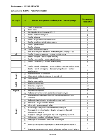 Znak sprawy: AI 261-03/JA/16 Załacznik nr 2 do SIWZ - PODZIAŁ NA CZĘŚCI Część 2 Część 1 Nr części LP 1 2 3 4 5 6 7 8 9 10 11 12 13 14 15 16 33 34 35 36 Przyrząd do higieny intymnej/podcierak z długim uchwytem Część 3 Część 4 18 19 20 21 22 23 24 25 26 27 Część 6 Szafa przeszklona Szafa pełna Nadstawka do szaf (z pozycji 1 i 2) Szafka pod zlewozmywak Szafka wisząca Szafka przyścienna dwukomorowa Szafka przyścienna jednokomorowa Szafka podblatowa Szafka wisząca Szafka pod zlewozmywak Blat monolityczny do szafek podblatowych z pozycji 8 i 10 Szafka zlewozmywakowa – zestaw pediatryczny Szafka wisząca – zestaw pediatryczny Szafka z umywalką – zestaw pediatryczny Szafka z wanienką – zestaw pediatryczny Szafka – stolik zabiegowy z materacykiem – zestaw pediatryczny Szafka – stolik zabiegowy z dołączonymi półkami – zestaw pediatryczny Łóżko domowe ze stelażem Materac do łóżka domowego (z pozycji 18) Stolik nocny Biurko nauczyciela Krzesło nauczyciela Krzesło z pulpitem Krzesło do poczekalni Myjnia chirurgiczna Taboret prysznicowy dla osób niepełnosprawnych Podpórka czterokołowa dla osób niepełnosprawnych typu ambona Balkonik dwufunkcyjny składany krocząco-stały Chwytak z przyssawkami - krótki Chwytak z przyssawkami - długi Czwórnóg/uchwyt dla osób niepełnosprawnych Przyrząd do mycia włosów z długim uchwytem dla osób niepełnosprawnych Grzebień z długim uchwytem dla osób niepełnosprawnych Uchwyt/przyrząd do zakładania skarpet Przyrząd do zakładania pończoch uciskowych 17 Część 5 Nazwa asortymentu nadana przez Zamawiajacego 28 29 30 31 32 37 Pneumatyczny zestaw do mycia włosów u osób w pozycji leżącej Strona 1 Zamawiana ilość sztuk 5 6 11 2 2 1 1 6 8 2 2 1 1 1 1 1 1 1 1 1 5 5 50 10 1 1 1 1 1 1 2 2 2 2 2 2 5 Część 7 38 39 Część 8 40 Część 9 41 Część 10 42 43 44 45 46 47 Część 13 Część 12 Część 11 Część 15 Część 14 Część 16 48 49 50 51 52 53 54 55 56 57 58 59 60 61 62 63 64 65 66 67 68 69 Część 17 70 71 72 73 74 75 76 77 78 79 80 81 82 83 Wózek inwalidzki z urządzeniem sanitarnym Wózek inwalidzki Wózek transportowo-kąpielowy w pozycji leżącej z regulacją wysokości Podnośnik transportowy – kąpielowy elektryczny Mobilny wózek na odpady lub brudną bieliznę - potrójny stelaż na worki Stolik zabiegowy Parawan lekarski Stojak dla kroplówek Wózek do rozwożenia leków Mobilny wózek na odpady lub brudną bieliznę - pojedynczy stelaż na worki Stół do transportu chorych w pozycji leżącej Nosze do karetki, samojezdne z oparciem Elektroniczna waga kolumnowa Waga osobowa ze wzrostomierzem elektronicznym Stadiometr Waga do ważenia noworodków i niemowląt Stolik do badania i pielęgnacji niemowląt z szafką Łóżko noworodkowe z materacykiem Łóżko dziecięce z materacykiem - szpitalne Lampa bakteriobójcza Lampa SOLLUX na statywie Apteczka ścienna z wyposażeniem Zestaw do zdejmowania szwów Zestaw do zakładania szwów Ciśnieniomierz zegarowy dla dzieci - manualny Stetoskop neonatologiczny Termometr pediatryczny dotykowy Termometr pediatryczny bezdotykowy - pistoletowy Szafka przyłóżkowa Stolik przyłóżkowy –do szafki trzyłóżkowej z pozycji 66 Model do badania fizykalnego (osłuchowy trenażer serca i płuc) – tors Model do badania piersi, na szelkach Model do badania piersi na podstawce - pierś zdrowa i min. 2 przykłady chorobowe Symulator odczuć starczych Model do badania jąder Symulator do badania prostaty Zestaw do pozoracji urazów Tors do intubacji Model do nauki opatrywania – tors żeński Zestaw szkoleniowy BLS/AED (3 fantomy) Geriatryczny manekin dwupłciowy – dorosły człowiek Model ręki do iniekcji dożylnych Ramię do wstrzyknięć Symulator iniekcji śródskórnych Symulator iniekcji domięśniowych i śródskórnych z sygnalizacją dźwiękową – prawe ramię człowieka Symulator iniekcji domięśniowych z sygnalizacją świetlną i dźwiękową – prawy pośladek Strona 2 1 2 1 1 7 22 8 5 6 3 4 1 3 4 1 1 3 3 3 1 1 5 10 10 5 5 5 5 4 4 2 2 2 1 1 1 1 1 1 2 1 4 4 6 4 2 118 119 120 121 122 123 124 125 126 127 Symulator do iniekcji domięśniowych – brzuch, pośladki Symulator do cewnikowania pęcherza - pełne męskie podbrzusze z narządem płciowym Symulator do cewnikowania pęcherza - pełne żeńskie podbrzusze z narządem płciowym Model zmian odleżynowych - pośladki Model do pielęgnacji stomii Model do nauki kaniulacji żył centralnych - tors Model główki noworodka do kaniulacji naczyń żylnych Fantom wcześniaka Symulator (fantom) do iniekcji niemowląt Fantom (model) do nauki czynności pielęgnacyjnych dziecka w wieku 5 lat Symulator do badania oczu - manekin Symulator do badania uszu - manekin Ręka do zakładania szwów Manekin do resuscytacji krążeniowo-oddechowej i defibrylacji – cała postać – osoba dorosła Manekin do resuscytacji krążeniowo-oddechowej i defibrylacji – cała postać – dziecko Szpitalny manekin pielęgnacyjny naturalnych rozmiarów osoba dorosła Model noworodka do pielęgnacji i kąpania Fantom (model) niemowlęcia do pielęgnacji – płeć żeńska Fantom (model) niemowlęcia do pielęgnacji – płeć męska Pulsoksymetr stacjonarny Pulsoksymetr przenośny na palec Pulsoksymetr przenośny nadgarstkowy Kardiomonitor przenośny Aparat EKG Defibrylator szkoleniowy Kamerton widełkowy bez ciężarków Otoskop kieszonkowy Oftalmoskop kieszonkowy Latarka laryngologiczna Stetoskop uniwersalny Ciśnieniomierz zegarowy - manualny Lusterko laryngologiczne Glukometr z wyposażeniem Urządzenie do pomiarów 3 w 1 : glukoza, cholesterol i trójglicerydy Młotek neurologiczny Taylora Młotek neurologiczny DEJERINE’a Ciśnieniomierz elektroniczny - naramienny Laryngoskop z oświetleniem i łyżkami ALKOgogle - model dzienny ALKOgogle - model nocny Analizator tkanki tłuszczowej Elektroniczna tablica okulistyczna Tablice Ishihary Tablica okulistyczna Snellena do bliży 1