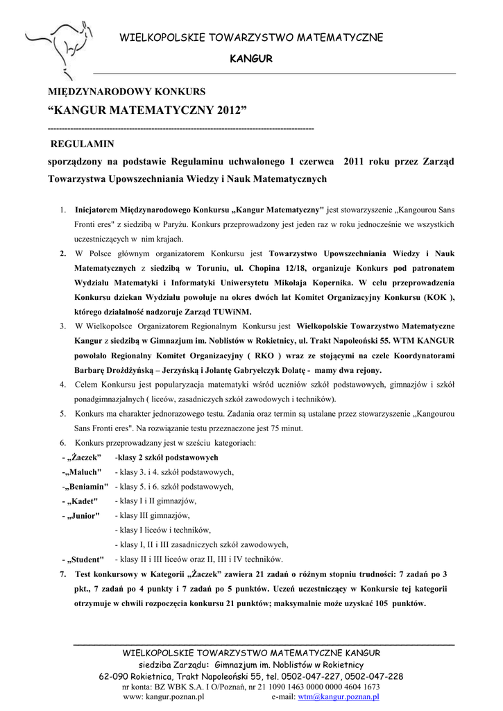 WIELKOPOLSKIE TOWARZYSTWO MATEMATYCZNE KANGUR MIĘDZYNARODOWY KONKURS “KANGUR MATEMATYCZNY 2012” ----------------------------------------------------------------------------------------------- REGULAMIN sporządzony na podstawie Regulaminu uchwalonego 1 czerwca 2011 roku przez Zarząd Towarzystwa Upowszechniania Wiedzy i Nauk Matematycznych 1. Inicjatorem Międzynarodowego Konkursu „Kangur Matematyczny" jest stowarzyszenie „Kangourou Sans Fronti eres" z siedzibą w Paryżu. Konkurs przeprowadzony jest jeden raz w roku jednocześnie we wszystkich uczestniczących w nim krajach. 2. W Polsce głównym organizatorem Konkursu jest Towarzystwo Upowszechniania Wiedzy i Nauk Matematycznych z siedzibą w Toruniu, ul. Chopina 12/18, organizuje Konkurs pod patronatem Wydziału Matematyki i Informatyki Uniwersytetu Mikołaja Kopernika. W celu przeprowadzenia Konkursu dziekan Wydziału powołuje na okres dwóch lat Komitet Organizacyjny Konkursu (KOK ), którego działalność nadzoruje Zarząd TUWiNM. 3. W Wielkopolsce Organizatorem Regionalnym Konkursu jest Wielkopolskie Towarzystwo Matematyczne Kangur z siedzibą w Gimnazjum im. Noblistów w Rokietnicy, ul. Trakt Napoleoński 55. WTM KANGUR powołało Regionalny Komitet Organizacyjny ( RKO ) wraz ze stojącymi na czele Koordynatorami Barbarę Drożdżyńską – Jerzyńską i Jolantę Gabryelczyk Dolatę - mamy dwa rejony. 4. Celem Konkursu jest popularyzacja matematyki wśród uczniów szkół podstawowych, gimnazjów i szkół ponadgimnazjalnych ( liceów, zasadniczych szkół zawodowych i techników). 5. Konkurs ma charakter jednorazowego testu. Zadania oraz termin są ustalane przez stowarzyszenie „Kangourou Sans Fronti eres". Na rozwiązanie testu przeznaczone jest 75 minut. 6. Konkurs przeprowadzany jest w sześciu kategoriach: - „Żaczek” -klasy 2 szkół podstawowych -„Maluch" - klasy 3. i 4. szkół podstawowych, -„Beniamin" - klasy 5. i 6. szkół podstawowych, - „Kadet" - klasy I i II gimnazjów, - „Junior" - klasy III gimnazjów, - klasy I liceów i techników, - klasy I, II i III zasadniczych szkół zawodowych, - „Student" 7. - klasy II i III liceów oraz II, III i IV techników. Test konkursowy w Kategorii „Żaczek” zawiera 21 zadań o różnym stopniu trudności: 7 zadań po 3 pkt., 7 zadań po 4 punkty i 7 zadań po 5 punktów. Uczeń uczestniczący w Konkursie tej kategorii otrzymuje w chwili rozpoczęcia konkursu 21 punktów; maksymalnie może uzyskać 105 punktów. ________________________________________________________________________ WIELKOPOLSKIE TOWARZYSTWO MATEMATYCZNE KANGUR siedziba Zarządu: Gimnazjum im. Noblistów w Rokietnicy 62-090 Rokietnica, Trakt Napoleoński 55, tel. 0502-047-227, 0502-047-228 nr konta: BZ WBK S.A. I O/Poznań, nr 21 1090 1463 0000 0000 4604 1673 www: kangur.poznan.pl e-mail: [email protected] WIELKOPOLSKIE TOWARZYSTWO MATEMATYCZNE KANGUR Test konkursowy w kategorii „Maluch" zawiera 24 zadania o różnym stopniu trudności (8 zadań po 3 punkty, 8 zadań, po 4 punkty i 8 zadań po 5 punktów). Uczeń uczestniczący w Konkursie w tej kategorii otrzymuje w chwili rozpoczęcia Konkursu 24 punkty; maksymalnie może więc uzyskać 120 punktów. Testy pozostałych kategorii zawierają po 30 pytań o różnym stopniu trudności (10 zadań po 3 punkty, 10 zadań po 4 punkty i 10 zadań po 5 pkt.). Uczeń uczestniczący w Konkursie w każdej z tych kategorii otrzymuje w chwili rozpoczęcia Konkursu 30 punktów, maksymalnie może więc uzyskać 150 punktów. Do każdego zadania dołączonych jest 5 odpowiedzi oznaczonych literami A, B, C, D, E, z których dokładnie jedna jest poprawna. Za brak odpowiedzi uczestnik Konkursu otrzymuje zero punktów, natomiast za odpowiedź błędną lub zaznaczenie więcej niż jednej odpowiedzi otrzymuje punkty ujemne w liczbie 25% przewidzianych za dane zadanie. 8. Zarząd TUWiNM ustala corocznie zasady rozdziału opłat wnoszonych za udział w Konkursie na następujące cele:  Nagrody przyznawane przez organizatorów regionalnych i koszty organizacyjne ponoszone przez organizatorów regionalnych;  Koszty działalności organizacyjnej Komitetu Organizacyjnego Konkursu i koszty na gród fundowanych przez TUWiNM 9. W roku 2012 konkurs odbędzie się dnia 15 marca od godziny 9:00. 10. Do zadań Komitetu Organizacyjnego w Toruniu należy:  Przygotowanie w uzgodnieniu ze stowarzyszeniem „„Kangourou Sans Fronti eres" testów konkursowych oraz przygotowanie kart pytań i kart odpowiedzi;  Opracowanie wyników konkursu;  Udostępnienie Regionalnym Komitetom O rganizacyjnym ( RKO ) wyników Konkursu uczniów regionu;  Udostępnienie szkołom wyników Konkursu ich uczniów;  Ustalanie zasad przyznawania nagród uczestnikom Konkursu;  Ustalanie rodzaje nagród fundowanych przez TUWiNM ( wymiana międzynarodowa i nagroda dla uczestników z wynikiem wyróżniającym ) 11. TUWiNM zawarło porozumienie z WTM KANGUR o organizacji w roku szkolnym 2011/2012 Międzynarodowego Konkursu „Kangur Matematyczny” zwanego dalej Konkursem na obszarze obejmującym powiaty:  Chodzież, Czarnków, Grodzisk Wielkopolski, Oborniki Wielkopolskie, Miasto Poznań, Wolsztyn, Września, Złotów – koordynatorem jest J. Gabryelczy Dolata;  Gostyń, Gniezno, Jarocin, Kalisz, Kępno, Krotoszyn, Kościan, Leszno, Międzychód, Nowy Tomyśl, , Ostrów Wielkopolski,, Ostrzeszów, Piła, Pleszew, „Poznański Ziemski”, Rawicz, Szamotuły, Śrem, Środa Wielkopolska, Wągrowiec - koordynatorem jest B. Drożdżyńska – Jerzyńska. Obszar ten nosi nazwę REGION POZNAŃSKI. ________________________________________________________________________ WIELKOPOLSKIE TOWARZYSTWO MATEMATYCZNE KANGUR siedziba Zarządu: Gimnazjum im. Noblistów w Rokietnicy 62-090 Rokietnica, Trakt Napoleoński 55, tel. 0502-047-227, 0502-047-228 nr konta: BZ WBK S.A. I O/Poznań, nr 21 1090 1463 0000 0000 4604 1673 www: kangur.poznan.pl e-mail: [email protected] WIELKOPOLSKIE TOWARZYSTWO MATEMATYCZNE
