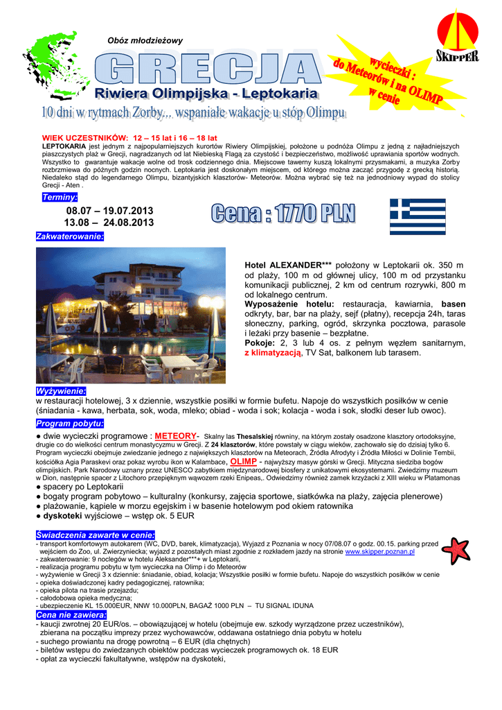 Y Obóz młodzieżowy LEPTOKARIA jest jednym z najpopularniejszych kurortów Riwiery Olimpijskiej, położone u podnóża Olimpu z jedną z najładniejszych piaszczystych plaż w Grecji, nagradzanych od lat Niebieską Flagą za czystość i bezpieczeństwo, możliwość uprawiania sportów wodnych. Wszystko to gwarantuje wakacje wolne od trosk codziennego dnia. Miejscowe tawerny kuszą lokalnymi przysmakami, a muzyka Zorby rozbrzmiewa do późnych godzin nocnych. Leptokaria jest doskonałym miejscem, od którego można zacząć przygodę z grecką historią. Niedaleko stąd do legendarnego Olimpu, bizantyjskich klasztorów- Meteorów. Można wybrać się też na jednodniowy wypad do stolicy Grecji - Aten . Terminy: 08.07 – 19.07.2013 13.08 – 24.08.2013 Zakwaterowanie: Hotel ALEXANDER*** położony w Leptokarii ok. 350 m od plaży, 100 m od głównej ulicy, 100 m od przystanku komunikacji publicznej, 2 km od centrum rozrywki, 800 m od lokalnego centrum. Wyposażenie hotelu: restauracja, kawiarnia, basen odkryty, bar, bar na plaży, sejf (płatny), recepcja 24h, taras słoneczny, parking, ogród, skrzynka pocztowa, parasole i leżaki przy basenie – bezpłatne. Pokoje: 2, 3 lub 4 os. z pełnym węzłem sanitarnym, z klimatyzacją, TV Sat, balkonem lub tarasem. Wyżywienie: w restauracji hotelowej, 3 x dziennie, wszystkie posiłki w formie bufetu. Napoje do wszystkich posiłków w cenie (śniadania - kawa, herbata, sok, woda, mleko; obiad - woda i sok; kolacja - woda i sok, słodki deser lub owoc). Program pobytu: ● dwie wycieczki programowe : METEORY- Skalny las Thesalskiej równiny, na którym zostały osadzone klasztory ortodoksyjne, drugie co do wielkości centrum monastycyzmu w Grecji. Z 24 klasztorów, które powstały w ciągu wieków, zachowało się do dzisiaj tylko 6. Program wycieczki obejmuje zwiedzanie jednego z największych klasztorów na Meteorach, Źródła Afrodyty i Źródła Miłości w Dolinie Tembii, kościółka Agia Paraskevi oraz pokaz wyrobu ikon w Kalambace, OLIMP - najwyższy masyw górski w Grecji. Mityczna siedziba bogów olimpijskich. Park Narodowy uznany przez UNESCO zabytkiem międzynarodowej biosfery z unikatowymi ekosystemami. Zwiedzimy muzeum w Dion, następnie spacer z Litochoro przepięknym wąwozem rzeki Enipeas,. Odwiedzimy również zamek krzyżacki z XIII wieku w Platamonas ● spacery po Leptokarii ● bogaty program pobytowo – kulturalny (konkursy, zajęcia sportowe, siatkówka na plaży, zajęcia plenerowe) ● plażowanie, kąpiele w morzu egejskim i w basenie hotelowym pod okiem ratownika ● dyskoteki wyjściowe – wstęp ok. 5 EUR Świadczenia zawarte w cenie: - transport komfortowym autokarem (WC, DVD, barek, klimatyzacja), Wyjazd z Poznania w nocy 07/08.07 o godz. 00.15. parking przed wejściem do Zoo, ul. Zwierzyniecka; wyjazd z pozostałych miast zgodnie z rozkładem jazdy na stronie www.skipper.poznan.pl - zakwaterowanie: 9 noclegów w hotelu Aleksander***+ w Leptokarii, - realizacja programu pobytu w tym wycieczka na Olimp i do Meteorów - wyżywienie w Grecji 3 x dziennie: śniadanie, obiad, kolacja; Wszystkie posiłki w formie bufetu. Napoje do wszystkich posiłków w cenie - opieka doświadczonej kadry pedagogicznej, ratownika; - opieka pilota na trasie przejazdu; - całodobowa opieka medyczna; - ubezpieczenie KL 15.000EUR, NNW 10.000PLN, BAGAŻ 1000 PLN – TU SIGNAL IDUNA Cena nie zawiera: - kaucji zwrotnej 20 EUR/os. – obowiązującej w hotelu (obejmuje ew. szkody wyrządzone przez uczestników), zbierana na początku imprezy przez wychowawców, oddawana ostatniego dnia pobytu w hotelu - suchego prowiantu na drogę powrotną – 6 EUR (dla chętnych) - biletów wstępu do zwiedzanych obiektów podczas wycieczek programowych ok. 18 EUR - opłat za wycieczki fakultatywne, wstępów na dyskoteki, UWAGA!!! Konieczność posiadania ważnych paszportów !!! Orientacyjne ceny: * woda mineralna - 0,60 EUR/1,5l * coca-cola - 3,5 EUR/2l * lody - 1,5 EUR/gałka * sałatka grecka - 3,5 EUR * gyros - 2 EUR * pocztówka ze znaczkiem-1 EUR * pizza - ok. 2 EUR/kawałek * oliwki - od 4 EUR/kg * materac dmuchany - 9 EUR, koło dmuchane - 5 EUR. Wycieczki fakultatywne: dla chętnych, płatne przez uczestników (istnieje możliwość wykupienia wycieczki w biurze, przy zapisie – cena wycieczki doliczana do ceny podstawowej). ATENY- zwiedzanie zaczynamy od odwiedzenia największego portu Grecji- Pireus oraz Stadionu Panatenejskiego. Program wycieczki obejmuje między innymi Wzgórze Akropol z jego antycznymi świątyniami, Agorę Grecką oraz Rzymską, Plakę. Zobaczymy również zmianę warty przed Parlamentem – koszt: 42 EUR ŚWIAT WODNY - (Waterworld) – koszt: 30 EUR SKHIATOS - Zielona wyspa w archipelagu Sporad Północnych, gdzie fale Morza Egejskiego. Liczne zatoki oraz wysepki otaczające wyspę będziemy podziwiać ze statku, na którym kapitan i jego załoga będą nas zabawiać i uczyć tańców greckich. Zwiedzimy jedno z uroczych miasteczek na wyspie oraz zrelaksujemy się na otoczonej lasem piniowym, złotej plaży Kukunaries – koszt: 42 EUR Biuro Podróży SKIPPER 61-806 Poznań, ul. Św. Marcin 29/4 tel. 61 661 33 34, tel./fax. 61 851 95 93