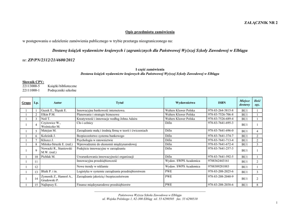 ZAŁĄCZNIK NR 2 Opis przedmiotu zamówienia w postępowaniu o udzielenie zamówienia publicznego w trybie przetargu nieograniczonego na: Dostawę książek wydawnictw krajowych i zagranicznych dla Państwowej Wyższej Szkoły Zawodowej w Elblągu nr: ZP/PN/2312/21/4600/2012 I część zamówienia Dostawa książek wydawnictw krajowych dla Państwowej Wyższej Szkoły Zawodowej w Elblągu Słownik CPV: 22113000-5 22111000-1 Grupa Lp. Książki biblioteczne Podręczniki szkolne Tytuł Autor Wydawnictwo ISBN Miejsce dostawy Ilość egz. Guzek E., Ślązak E. Elkin P.M. Neil T. Czyżowicz W., Woźniczko M. Matejun M. Innowacyjna bankowość internetowa. Planowanie i strategie biznesowe Kreatywność i innowacje według Johna Adaira Cło i celnicy Walters Kluwer Polska Walters Kluwer Polska Walters Kluwer Polska Difin 978-83-264-3815-8 978-83-7526-706-8 978-83-7526-689-4 978-83-7641-695-3 BU1 BU1 BU1 1 1 1 BU1 1 Zarządzanie małą i średnią firmą w teorii i ćwiczeniach Difin 978-83-7641-696-0 Koleśnik J. Kliszcz J. Mińska-Struzik E. (red.) Nowacki R., Staniewski M.W. (red.) Pichlak M. Bezpieczeństwo systemu bankowego Psychologia w ratownictwie Wprowadzenie do ekonomii międzynarodowej Podejście innowacyjne w zarządzaniu Difin Difin Difin Difin 978-83-7641-374-7 978-83-7641-713-4 978-83-7641-672-4 978-83-7641-257-3 BU1 BU1 BU1 BU1 4 2 2 3 BU1 1 Difin Wydaw. SWPS Academica 978-83-7641-592-5 9788362443161 BU1 1 11 Uwarunkowania innowacyjności organizacji Innowacyjna przedsiębiorczość BU1 2 1 12 Nowe trendy w reklamie Wydaw. SWPS Academica 9788389281883 BU1 1 1 13 Blaik P. i in. Logistyka w systemie zarządzania przedsiębiorstwem PWE 978-83-208-2025-6 BU1 3 Zymonik Z., Hamrol A., Grudowski P. Najlepszy E. Zarządzanie jakością i bezpieczeństwem PWE 978-83-208-2040-9 BU1 2 Finanse międzynarodowe przedsiębiorstw PWE 978-83-208-2038-6 BU1 8 1 1 1 1 2 3 1 4 1 1 1 1 5 6 7 8 1 9 1 10 1 1 14 1 15 -------------------------------------------------------------------------------------------------------Państwowa Wyższa Szkoła Zawodowa w Elblągu ul. Wojska Polskiego 1, 82-300 Elbląg tel. 55 6290505 fax. 55 6290510 1 1 1 1 16 17 18 1 19 1 1 1 1 1 3 20 21 22 23 24 28 4 29 4 4 4 4 4 5 30 31 32 33 34 35 Bal-Woźniak T. Pająk E. Szatkowski K. Rogalska S., Małuszyńska J., Olszewska M.J. Hall R., Taylor J.B. Górski J., Przewłocki S. Wendell Odom Alicja Żarowska-Mazur, Waldemar Węglarz Walter Isaacson Innowacyjność w ujęciu podmiotowym Zarządzanie produkcją Przygotowanie produkcji Podstawy cytogenetyki roślin. Wyd. 2 PWE PWN PWN PWN Makroekonomia. Wyd. 3 Nowy poradnik majstra budowlanego Podstawy mechaniki budowli. Wyd. 2 Technologia budownictwa 1 Technologia budownictwa 2 CCNP Route Oficjalny Przewodnik certyfikacji z CD-ROM PWN Arkady Arkady Wydaw. REA Wydaw. REA Wydawnictwo Naukowe PWN Książka ECDL Advanced na skróty z CD-ROM. Edycja 2012 Wydawnictwo Naukowe PWN Kurs Lightroom 4 korekcja fotografii ksiązka +DVD Kurs Vegas Pro 11 książka +DVD Kurs Adobe Premiere Pro CS5 - esencja książka + DVD Kurs Adobe After Effects CS5 - esencja książka + DVD Kurs Adobe Encore CS5 - esencja książka + DVD Strefa kursów Strefa kursów Strefa kursów Strefa kursów Strefa kursów Steve Jobs - oprawa twarda Insignis Media 978-83-208-2018-8 978-83-01-14772-3 978-83-01-15590-2 978-83-01-14434-0 978-83-01-14990-1 978-83-213-4247-4 978-83-213-4417-1 978-83-7544-118-5 978-83-7544-553-4 978-83-61428-51-0 BU1 BU1 BU1 1 16 16 BU1 1 BU1 BU1 BU1 BU1 BU1 B3/IIS 11 2 20 6 6 19 B3/IIS 3 B3/IIS B3/IIS B3/IIS B3/IIS B3/IIS 1 1 1 1 1 B3/AIP 1 Część zamówienia realizowana jest w ramach projektu pt. GRUPA 2 - Matematyka i informatyka drogą do sukcesu w szkołach zawodowych KSI: POKL.09.02.00-28-010/12. współfinansowanego przez Unię Europejską z Europejskiego Funduszu Społecznego w ramach Programu Operacyjnego Kapitał Ludzki, Priorytet IX Rozwój wykształcenia i kompetencji w regionach, Działanie 9.2 Podniesienie atrakcyjności i jakości szkolnictwa zawodowego. GRUPA 3 - Rynek pracy należy do IT - program zwiększenia liczby absolwentów na kierunku informatyka, KSI:POKL.04.01.02-00-191/10 współfinansowany ze środków Unii Europejskiej w ramach Europejskiego Funduszu Społecznego. Miejsce realizacji zamówienia:, budynek PWSZ w Elblągu: a) BU1 - ul. Grunwaldzka 137 – biblioteka pok. 125, b) B3 - Wojska Polskiego 1 – pok. 203. -------------------------------------------------------------------------------------------------------Państwowa Wyższa Szkoła Zawodowa w Elblągu ul. Wojska Polskiego 1, 82-300 Elbląg tel. 55 6290505 fax. 55 6290510 2 II część zamówienia Dostawa książek wydawnictw zagranicznych dla Państwowej Wyższej Szkoły Zawodowej w Elblągu Słownik CPV: 22113000-5 Książki biblioteczne Lp. Autor Tytuł Wydawnictwo ISBN Miejsce dostawy Ilość egz. 1. 2. Harrison, M. Glendinng, E. CAE Practice Tests with key and AudioCDs Oxford English for CareersTechnology 1 Student's Book Oxford Oxford 9780194568760 9780194569507 BU1 BU1 1 3. Glendinng, E. Oxford English for CareersTechnology 1 Teacher`s Book Oxford 9780194569514 BU1 4. Oxford English for CareersTechnology 1 Class Audio CD Oxford English for CareersTechnology 2 Student's Book Oxford Oxford 9780194569521 9780194569538 BU1 1 1 5. Glendinng, E. Glendinng, E. BU1 1 6. Glendinng, E. Oxford English for CareersTechnology 2 Teacher`s Book Oxford 9780194569545 BU1 1 7. 8. Glendinng, E. Oxford English for CareersTechnology 2 Class Audio CD Oxford 9780194569552 Frost, A. Daum, U. English for legal professional Gerichts- und Behördenterminologie, 9. überarbeitete Auflage 9780194579155 9783938430231 1 4 Schlüter-Ellner, C. Juristendeutsch verständlich gemacht und Treffende Verben in der deutschen Rechtssprache Übungen in deutscher und polnischer Rechtssprache Oxford Bundesverband der Dolmetscher und Übersetzer Bundesverband der Dolmetscher und Übersetzer Fachverlage und Ubersetzungsservice BU1 BU1 Das ABC de